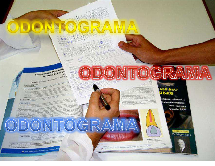 PDF created with pdfFactory Pro trial version www.pdffactory.com É a marcação em um diagrama, no papel, do exame da arcada dentária superior e inferior de um paciente. PDF created with pdfFactory Pro trial version www.pdffactory.com D I A G N Ó S T I C O E X A M E C L Í N I C O ANAMNESE IDENTIFICAÇÃO QUEIXA PRINCIPAL HISTÓRIA CLÍNICA EXAME FÍSICO ASPECTOS GERAIS EXTRA-ORAL INTRA-ORAL EXAMES COMPLEMENTARES PDF created with pdfFactory Pro trial version www.pdffactory.com Presença de cárie(aguda ou crônica); Fraturas coronárias; Erosão; Abrasão; Restaurações satisfatórias; Restaurações insatisfatórias; Ausência de dentes Dentes com extração indicada; Etc, etc, etc................... Exame dos dentes: PDF created with pdfFactory Pro trial version www.pdffactory.com PDF created with pdfFactory Pro trial version www.pdffactory.com FACES DO DENTE PDF created with pdfFactory Pro trial version www.pdffactory.com PDF created with pdfFactory Pro trial version www.pdffactory.com ODONTOGRAMA INICIAL PDF created with pdfFactory Pro trial version www.pdffactory.com faces dos dentes no odontograma: Vestibular V Mesial M Distal D O ou I Lingual L PDF created with pdfFactory Pro trial version www.pdffactory.com Cárie no odontograma: PDF created with pdfFactory Pro trial version www.pdffactory.com Restauração Insatisfatória e Cárie no odontograma: PDF created with pdfFactory Pro trial version www.pdffactory.com Restauração satisfatória e Cárie no odontograma: PDF created with pdfFactory Pro trial version www.pdffactory.com Restauração satisfatória e Cárie no odontograma: PDF created with pdfFactory Pro trial version www.pdffactory.com Cárie no odontograma: PDF created with pdfFactory Pro trial version www.pdffactory.com Dentes ausentes; extraídos ou com extração indicada no odontograma: PDF created with pdfFactory Pro trial version www.pdffactory.com Cárie : Um risco em vermelho na face do dente correspondente á cárie. Restaurações com cárie, com material provisório ou fraturadas: Preencher totalmente a face correspondente em vermelho. Restaurações satisfatórias: Preencher a face correspondente à restauração em azul ou preto. Dentes ausentes; extraídos ou com extração indicada: Fazer um X no dente correspondente PDF created with pdfFactory Pro trial version www.pdffactory.com PDF created with pdfFactory Pro trial version www.pdffactory.com PDF created with pdfFactory Pro trial version www.pdffactory.com PDF created with pdfFactory Pro trial version www.pdffactory.com PDF created with pdfFactory Pro trial version www.pdffactory.com PDF created with pdfFactory Pro trial version www.pdffactory.com