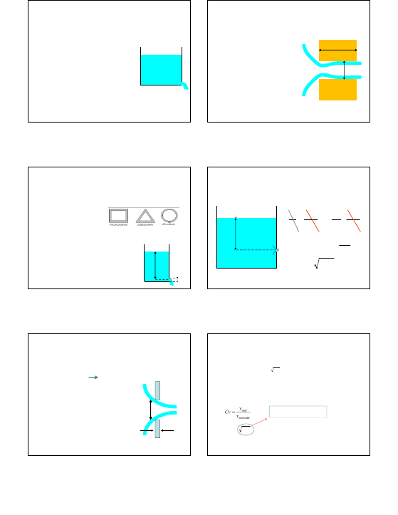 09/04/2012 1 ORIFÍCIOS DEFINIÇÃO e FINALIDADE Orifícios são aberturas ou perfurações, geralmente de forma geométrica, feita abaixo da superfície livre do líquido, em paredes de reservatórios, tanques, canais ou canalizações. A finalidade principal dos orifícios é medir, controlar vazões e o esvaziamento do recipiente. CLASSIFICAÇÃO a) Quanto à forma geométrica b) Quanto às dimensões relativas • Retangulares; • Triangulares; • Circulares. • Pequenas (d ≤ 1/3 h) • Grandes (d > 1/3 h) d h c) Quanto a natureza das paredes • parede delgada (fina) (e < 1,5 d) • parede espessa (e ≥ 1,5 d) Parede delgada (e < d): A veia líquida toca apenas a face interna da parede do reservatório. e d (e > 2 d) Bocais Parede espessa (e ≥≥≥≥ d): O jato toca quase toda a parede do reservatório. Esse caso será visto no estudo dos bocais. e d Características do escoamento nos orifícios pequenos em parede delgada h A1, V1, patm A2, V2, patm γγ patm g Vhpatm g V +=++ 22 2 2 2 1 g Vh 2 2 2 = ghV 22 = Fórmula de Torricelli (válida para fluídos ideais) Coeficiente de velocidade ( Cv ) Devido a viscosidade do líquido, a velocidade real do jato é um pouco menor que , a qual deve ser afetada de um coeficiente denominado coeficiente de velocidade ( Cv < 1 ). gh2 Devido a: Atrito externo; Viscosidade. gh2.CvrV = Valor médio de Cv=0,985 � para a H2O e outros líquidos de viscosidades semelhantes. em situações em que a pressão for desconsiderada 09/04/2012 2 Coeficiente de Contração da Veia Líquida (Cc) A veia líquida sofre uma contração após o orifício, produzindo a chamada “seção contraída”. Denomina – se coeficiente de contração a relação entre a área de seção contraída do jato e a seção do orifício. Valor médio Cc =0,62 para H2O e viscosidades semelhantes. ac = área da seção contraída a = área do orifício. Coeficiente de Descarga ou de Vazão (Cd ) É designado o coeficiente de descarga ou de vazão ao produto entre Cc. Cv. Cd = Cv . Cc Na prática adota-se Cd = 0,61 Vazão de pequenos Orifícios Q = m³/s (vazão); A = m² (área do orifício); Cd = coeficiente de descarga; h = m (carga do orifício). ghACdQ 2..= Vt � velocidade total Orifícios afogados em paredes verticais Q = m³/s (vazão); A= m² (área do orifício); Cd = coeficiente de descarga; h3 = m (diferença de cota entre os dois reservatórios). 3gh2.A.CdQ = Vazão em orifícios grandes h 1 h h 2 D Quando h1 é muito diferente de h2, o uso da altura média de água h sobre o centro do orifício de diâmetro D para o cálculo da vazão, não é recomendado. − − = 1h2h 1h2h .g.2.A.Cd. 3 2Q 2/32/3 Q = m³/s (vazão); A = área do oríficio; Cd = coeficiente de descarga; h1 = altura da borda superior do orifício até a superfície livre da água; h2 = altura da borda inferior do orifício até a superfície livre da água. 09/04/2012 3 Influência da contração incompleta da veia CONTRAÇÃO INCOMPLETA (SÓ NA PARTE DE CIMA DO ORIFÍCIO) CONTRAÇÃO COMPLETA (EM TODAS AS FACES DO ORIFÍCIO) Influência da contração incompleta da veia Nos casos de orifícios abertos junto ao fundo ou às paredes laterais, é indispensável uma correção. Nessas condições, aplica–se um coeficiente de descarga C’d corrigido. • Para orifícios retangulares C’d = Cd. (1 + 0,15.k) orifício do totalperímetro contraçãoda supressãohá que em parteda perímetro =k Perímetro total = 2.(a+b)a b ( )ba bk + = .2 ( )ba bak + + = .2 .2 ( )ba bak + + = .2 gh2.A.d'CQ = Fórmula da vazão para orifícios retangulares em posições especiais. • Para orifícios circulares C’d = Cd. (1 + 0,13.k) gh2.A.d'CQ = Valores de k K = 0,25 para orifício junto à parede lateral ou junto ao fundo. K = 0,50 para orifício junto ao fundo e uma parede lateral. K = 0,75 para orifício junto ao fundo e as duas paredes laterais. Fórmula da vazão para orifícios retangulares em posições especiais. Escoamento com nível variável Durante o esvaziamento de um reservatório por meio de um orifício de pequena dimensão, a altura h diminui com o tempo. Com a redução de h, a vazão Q também irá decrescendo. Problema: Como determinar o tempo para esvaziar ou retirar um volume v do reservatório? Num pequeno intervalo de tempo dt a vazão que passa pelo orifício será: E o volume de líquido escoado será: Obs: Lembrar que v = Q . t dt.gh2.A.Cddv = gh2.A.CdQ = A = área do orifício (m2); Ar = área do reservatório (m2); t = tempo necessário par o esvaziamento (s). 09/04/2012 4 ( )2/12/1 2h1h g.2.A.Cd Ar.2t −= Tempo para o esvaziamento onde: t = tempo gasto para o líquido baixar do nível h1 até o nível h2, dado em segundos h1 = altura no início do escoamento (t = 0), dado em (m) h2 = altura depois de um certo tempo t, dado em (m) Ar = área da seção do reservatório, m² A = m² (área do orifício); Equação válida para determinar o tempo gasto para o líquido baixar do nível h1 até o nível h2. h. g.2.A.Cd Ar.2t = Tempo para o esvaziamento Para o esvaziamento total, a expressão fica : d h Escoamento sob pressões diferentes Perda de carga em orifícios Se não existissem perdas nos orifícios, a velocidade v2 do jato igualar-se-ia à velocidade teórica vt. A perda de carga que ocorre na passagem por orifício, corresponderá portanto, à diferença de energia cinética. g2 V1 c 1h 2 2 2 V f −= A expressão da perda de carga, aplicável também às adufas e comportas. g2 Vh 2 2 f = Comportas e adufas Um reservatório de água, pode ser esvaziado por meio de uma pequena comporta de 30 x 20 cm. Calcular a vazão inicial de descarga e o tempo gasto para esvaziar. Exemplo 1: 09/04/2012 5 A água escoa através de um orifício de 7,5 cm de diâmetro, com coeficientes de velocidade e contração de 0,95 e 0,65 respectivamente. Sabendo que a leitura no manômetro A da Figura é de 2 kgf.cm-2 e o tanque tem uma secção horizontal retangular de 3 x 2 m2, calcule a vazão. Ex