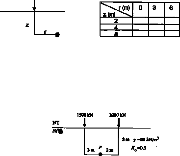 v v v v v v v v G E O T E C LISTA DE EXERCÍCIOS 05/15 – Tensões devido a cargas externas 1) Uma carga concentrada de 400 tf atua na superfície do terreno. Determinar o acréscimo de tensão total vertical (em kPa) na profundidade de 10 m, diretamente sob o eixo de aplicação da carga (ponto A) e numa distância horizontal de 5 m deste (ponto B). ∆σvA = 19,1 kPa; ∆σvB = 10,9 kPa 2) Uma carga de 50.000 kg é considerada puntiforme. Calcular a tensão total vertical (em kPa) gerada por esta carga nas posições abaixo indicadas e esboçar os diagramas de distribuição da tensão vertical ao longo da vertical sob o ponto de aplicação da carga e ao longo de uma horizontal nas cotas 2, 4 e 8 m. raio = 0 m: ∆σ (2 m) = 58,56 kPa; ∆σ (4 m) = 14,59 kPa; ∆σ (8 m) = 3,65 kPa. raio = 3 m: ∆σ (2 m) = 2,95 kPa; ∆σ (4 m) = 4,8 kPa; ∆σ (8 m) = 2,69 kPa. raio = 6 m: ∆σ (2 m) = 0,2 kPa; ∆σv (4 m) = 0,81 kPa; ∆σ (8 m) = 1,2 kPa. 3) Calcular as tensões totais verticais e horizontais e a tensão cisalhante finais em um ponto situado na profundidade de 3 m e a 3 m do eixo de aplicação de uma carga concentrada de 1000 kN sob a superfície de um terreno. O solo apresenta γ = 20 kN/m3 e ν = 0,50 e o nível d’água encontra-se na superfície. σv = 69,4 kPa; σr = 73,3 kPa; τ = 9,4 kPa 4) Calcular as tensões verticais e horizontais geostáticas e finais para o ponto P, supondo os esforços concentrados e o ponto coplanares. geostáticas: σv = 60 kPa; σh = 30 kPa; finais: σv = 192,7 kPa; σh = 52,31 kPa. 5) Calcular o acréscimo de tensão total vertical (em kPa) causado por uma placa circular de 5 m de diâmetro e carregada com 20 t/m2, em pontos situados a 2,5 m e 10 m de profundidade sob o seu eixo. ∆σvz=2,5m = 182,1 kPa; ∆σvz=10m = 56,9 kPa 6) Uma placa circular de 3 m de raio, apoiada sobre a superfície do terreno, está uniformemente carregada com 12 t/m2. Calcular o acréscimo de tensões totais verticais (em kPa) a 6 m abaixo do centro do círculo e num outro ponto, na mesma profundidade, na vertical do bordo da placa. ∆σz(centro) = 34,14 kPa; ∆σz(borda) = 22,8 kPa. 7) Para o perfil do subsolo abaixo, calcular as tensões totais verticais e horizontais nos pontos A, B, C e D após o carregamento indicado, um tanque cilíndrico assente na cota 0,0: y NA +3,0 NT Areia grossa γs = 26,5 kN/m 3; n = 42%; K0= 0,5 Areia fina γs = 27,5 kN/m 3; γd = 18 kN/m 3; K0= 0,4 0,0 -2,0 -5,0 R = 3 m Silte argiloso γs = 26,2 kN/m 3; e = 1,08; K0= 0,6 σ0 = 400 kPa Localização dos pontos: -10,0 Cotas em m PONTO x (m) y (m) cota (m) A 0 0 -2,0 B 0 0 -3,0 C 0 3,0 -5,0 D 4,5 0 -10,0 σvA = 365,1 kPa; σhA = 137,3 kPa; σvB = 331,1 kPa; σhB = 116,6 kPa; σvC = 243,8 kPa; σhA = 133,1 kPa; σvD = 275,4 kPa; σhD = 198,4 kPa; 8) Uma carga linear de 150 kgf/m é aplicada num terreno. Calcular o acréscimo de tensão vertical (em kPa) originada por essa carga na situação abaixo indicada. ∆σv = 0,04 kPa. PONTO COTA (m) A -1,0 B -3,5 Cotas em m C -6,0 -12,0 D -10,0 (C-T) 9) Para o perfil do subsolo abaixo, calcular as tensões totais verticais e horizontais nos pontos A, B, C e D após o carregamento indicado, um aterro rodoviário na cota +1,0, com γ = 21 kN/m3 e altura de 4 m: NT=NA +2,0 Areia fina γs= 26,4 kN/m 3; γd = 13,2 kN/m 3; K0= 0,5 D 8 m -1,0 C Argila siltosa G= 2,5 e = 0,80; K0= 0,8 A B -6,0 4m 2m Areia média G= 2,66 w = 11%; K0= 0,5 σvA = 115,5 kPa; σhA = 68,5 kPa; σvB = 130,4 kPa; σhB = 104,7 kPa; σvC = 157,0 kPa; σhA = 140,3 kPa; σvD = 247,2 kPa; σhD = 178,8 kPa; 10) Dado o aterro de extensão infinita apresentado abaixo, calcular a tensão total vertical transmitida aos pontos A e B. Para o ponto A, comparar os resultados obtidos pelas soluções de Osterberg e Carothers-Terzaghi. ∆σvA = 59,4; ∆σvA = 55,11 kPa; ∆σvB (C-T) = 5,91 kPa 11) Um muro de arrimo é construído sobre um terreno arenoso e transmitirá uma carga de 500 kPa através de uma sapata de 4 m de largura. Supondo para este solo γ = 20 kN/m3 (acima e abaixo do NA) e K0= 0,6 e o NA a 1 m de profundidade, calcular as tensões totais verticais e horizontais para pontos situados a profundidade 4 m sob o eixo da sapata. σv = 355 kPa; σh = 60 kPa 12) Calcular as tensões verticais devido a uma fundação por radier nos pontos A, B, C e D situados conforme ilustrado abaixo. vista superior σvA = 1000 kPa; σvB = 976 kPa; σvC = 620 kPa; σvD = 502 kPa. 13) O centro de uma área retangular na superfície do terreno tem coordenadas, em metros, de (0,0) e um dos cantos (6,15). A área está sujeita a um carregamento uniformemente distribuído de 400 kPa. Estimar o acréscimo de tensões totais verticais a uma profundidade de 15 m nos seguintes pontos: (0,0); (0,15); (6,0) e (10,25). ∆σv(0,0) = 160 kPa; ∆σv(0,15) = 72 kPa; ∆σv(6,0) = 124 kPa; ∆σv(10,25) = 14 kPa 14) Para a construção de um edifício com as dimensões em planta de 45 m x 30 m foi necessária uma escavação que atingiu a profundidade de 5 m em relação ao nível do terreno. Sabendo que o peso específico aparente natural do material escavado é 1,85 t/m3 e que o carregamento transmitido pelo edifício é 1000 kPa, calcule a variação na tensão total vertical com a escavação e a construção do prédio em um ponto situado a 20 m abaixo do nível original do terreno, no centro do edifício e em um dos cantos. σv(centro) = 1063,33 kPa;.σv(canto) = 514,5 kPa;. 15) Comparar a distribuições de tensões com a profundidade para: (a) carregamento concentrado de 3000 kN e (b) carga de 3000 kN distribuída em uma área de 3 m x 3 m. Plotar os resultados.Exemplos: z = 1m - ∆σvCC = 1431 kPa e ∆σvCD = 28,4 kPa; z = 2m - ∆σvCC = 357,8 kPa e ∆σvCD = 178,5 kPa; z = 3m - ∆σvCC = 159 kPa e ∆σvCD = 113 kPa; z = 6m - ∆σvCC = 39,8 kPa e ∆σvCD = 38,6 kPa; z = 9m - ∆σvCC = 17,7 kPa e ∆σvCD = 16,7 kPa 16) Para o perfil do subsolo abaixo, calcular as tensões totais verticais