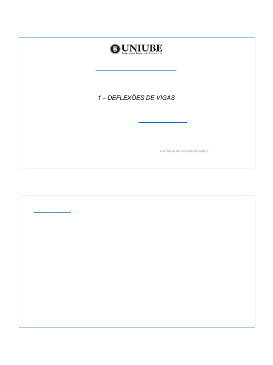 2/11/2014 1 MECÂNICA DOS MATERIAIS (Resistência dos Materiais II – 10577) 1 – DEFLEXÕES DE VIGAS Orientador: Tiago Toitio (tiago.toitio@uniube.br) NOTA: slides são apenas um material de apoio para direcionar o estudo. Nunca substitui os livros, que devem ser consultados sempre, para estudo e pesquisa. CONTEÚDO 1.1 – Introdução 1.2 – Equação diferencial da curva de deflexão 1.3 – Deflexões pela integração da equação do momento fletor 1.4 – Método da superposição 2/11/2014 2 Cálculo de deflexões – algumas aplicações: • Verificar se membros estruturais estão dentro dos limites aceitáveis de tolerância de deslocamentos. • Análise de estruturas estaticamente indeterminadas. • Análises dinâmicas (verificação de vibrações de aeronaves, respostas de edifícios aos terremotos, etc.) Há vários métodos para cálculo de deflexões em vigas, tais como: • Método da Integração da Equação da Curva de Deflexão • Método da Superposição • Método da Área do Momento • Métodos Energéticos 2/11/2014 3 Curva de deflexão curva que representa o eixo longitudinal deformado de uma viga sob carregamento. Também denominada linha elástica. Deflexão (v) deslocamento na direção y de qualquer ponto no eixo da viga. Ângulo de rotação ou inclinação (q ≈ tanq = dv/dx) ângulo entre o eixo x e a reta tangente à curva de deflexão, em determinado ponto. Figura 1 – Curva de deflexão de viga engastada sob carga concentrada. v = f(x). 2/11/2014 4 M(x) – momento fletor na abcissa x E – módulo de elasticidade do material – momento de inércia da área da seção transversal em relação ao eixo z E. – rigidez de flexão IE xM dx vd = )( 2 2 Figura 2 – Convenção de sinal para o momento fletor M. 2/11/2014 5 Procedimento: i. Substituir a função do momento fletor M(x) na equação diferencial da curva de deflexão. ii. Realizar a 1ª integração obtenção da inclinação q, isto é, dv/dx. iii. Realizar a 2ª integração obtenção da deflexão v. iv. Integrações geram constantes de integração, que são determinadas a partir de condições conhecidas relativas às inclinações e deflexões. Essas constantes são, então, substituidas nas equações de q e v. As condições classificam-se em 3 categorias: • Condições de contorno (relativas às deflexões e inclinações nos suportes de uma viga) – figura 3. • Condições de continuidade • Condições de simetria 2/11/2014 6 Figura 3 – Condições de contorno nos suportes (engaste, articulação e rolete). EXEMPLO 1. Determinar a equação da curva de deflexão para uma viga simples AB suportando um carregamento uniforme q em toda extensão da viga. Determinar a deflexão máxima dmáx. e os ângulos de rotação qA e qB nos suportes. O momento fletor em função de x, para sistema de coordenadas com origem em A e x > 0 para direita e y > 0 para cima, é: M(x) = 0,5.q.L.x – 0,5.q.x². 2/11/2014 7 EXEMPLO 2. Resolver o exemplo 1 para um carregamento w = 10 kN/m e comprimento da viga L = 4 m. EXEMPLO 3. Determinar a equação da curva de deflexão para uma viga engastada AB suportando uma carga concentrada P. Determinar também a deflexão máxima dmáx. e o ângulo de rotação máximo qmáx.. O momento fletor em função de x, para sistema de coordenadas com origem em A e x > 0 para direita e y > 0 para cima, é: M(x) = - P.x. 2/11/2014 8 EXEMPLO 4. Determinar a equação da curva de deflexão para uma viga de aço (E=200 GPa e = 1685 cm4) engastada AB de comprimento L = 2 m suportando uma carga concentrada P = 10 kN. Determinar também a deflexão máxima dmáx. e o ângulo de rotação máximo qmáx.. O momento fletor em função de x, para sistema de coordenadas com origem em A e x > 0 para direita e y > 0 para cima, é: M(x) = - P.(L - x). Método da Superposição técnica utilizada para obter deflexões e ângulos de rotação de vigas baseada no Princípio da Superposição, e pode ser estabelecido como: “ A deflexão / rotação de uma viga produzida por diversos carregamentos diferentes atuando simultaneamente pode ser calculada superpondo-se as deflexões / rotações produzidas pelos mesmos carregamentos atuando separadamente ”. 2/11/2014 9 Tabelas de deflexão de vigas o Método da Superposição é útil quando fórmulas para as deflexões e as inclinações estão prontamente disponíveis. Livros e manuais de Engenharia trazem estas fórmulas e/ou tabelas. Usando as tabelas e o Método da Superposição, pode-se calcular as deflexões e inclinações para muitas condições de carregamentos diferentes. EXEMPLO 5. A viga biapoiada AB de vão L = 5 metros, suporta um carregamento distribuído q = 5 kN/m e um carregamento concentrad P = 20 kN. Determinar a deflexão no meio do vão e as inclinações da curva elástica em A e B. 2/11/2014 10 EXEMPLO 6. Uma viga engastada AB de vão L = 4 metros, suporta três carregamentos concentrados de magnitude P = 10 kN cada. Calcular a deflexão e a inclinação da curva elástica na extremidade da viga. EXEMPLO 7. Uma viga engastada AB de vão L = 2,5 metros, suporta um carregamento concentrado P = 15 kN e um momento concentrado M = 4 kN.m. Calcular as deflexão e as inclinações da curva elástica no ponto B e no ponto C. Módulo de rigidez à flexão: E. = 6,1 x 106 N.m². 2/11/2014 11 FIM