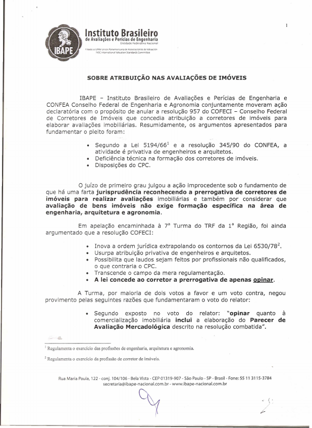 E,a - Instituto Brasileiro de Avaliações e Perícias de Engenharia Entidade Federativa Nacional f .Iiado a: UPAV Un.oo Panamericana do Assooaconcs de vafuaooo IV$( lr'ltCfN:tion.,1 Valu3t!on Standolrds Ccmrourec SOBRE ATRIBUIÇÃO NAS AVALIAÇÕES DE IMÓVEIS IBAPE - Instituto Brasileiro de Avaliações e Perícias de Engenharia e CONFEA Conselho Federal de Engenharia e Agronomia conjuntamente moveram ação declaratória com o propósito de anular a resolução 957 do COFECI - Conselho Federal de Corretores de Imóveis que concedia atribuição a corretores de imóveis para elaborar avaliações imobiliárias. Resumidamente, os argumentos apresentados para fundamentar o pleito foram: • Segundo a Lei 5194/661 e a resolução 345/90 do CONFEA, a atividade é privativa de engenheiros e arquitetos. • Deficiência técnica na formação dos corretores de imóveis. • Disposições do Cpc. o juízo de primeiro grau julgou a ação improcedente sob o fundamento de que há uma farta jurisprudência reconhecendo a prerrogativa de corretores de imóveis para realizar avaliações imobiliárias e também por considerar que avaliação de bens imóveis não exige formação específica na área de engenharia, arquitetura e agronomia. Em apelação encaminhada à r Turma do TRF da ia Região, foi ainda argumentado que a resolução COFECI: • Inova a ordem jurídica extrapolando os contornos da Lei 6530/782• • Usurpa atribuição privativa de engenheiros e arquitetos. • Possibilita que laudos sejam feitos por profissionais não qualificados, o que contraria o cpc. • Transcende o campo da mera regulamentação. • A lei concede ao corretor a prerrogativa de apenas opinar. A Turma, por maioria de dois votos a favor e um voto contra, negou provimento pelas seguintes razões que fundamentaram o voto do relator: • Segundo exposto no voto do relator: "opinar quanto à comercialização imobiliária inclui a elaboração do Parecer de Avaliação Mercadológica descrito na resolução combatida", I Regulamenta o exercício das profissões de engenharia, arquitetura e agronomia. 2 Regulamenta o exercício da profissão de corretor de imóveis. Rua Maria Paula, 122 - conj. 104/106 - Bela Vista - CEP 01319-907 - São Paulo - SP - Brasil - Fone: 55 11 3115-3784 secretaria@ibape-nacional.com.br - www.ibape-nacional.com.br .• i:, . /.;: 2 Instituto Brasileiro de Avaliações e Perícias de Engenharia Enrtdade Federativa Nacional Flhado a: UPAV Unión paoamertcana de Assocteciooes de vaiueción iV$C rntcreauonet vatuanon S!imd.:trd~ Ccmmrnec • As atividades elencadas no artigo 3° da Resolução? não necessitam de formação específica na área de engenharia, arquitetura ou agronomia. • O objetivo da resolução é padronizar e dar segurança ao mercado imobiliário, o que está em harmonia com a Lei 6530/79. • A jurisprudência já consolidou no sentido de admitir que a avaliação de um imóvel possa ser feita também por corretores imobiliários. • A Lei 5194/66 não excluiu a possibilidade de trabalhos avaliatórios serem realizados também por outros profissionais. • Proposta (rechaçada) de tornar privativas de corretores de imóveis as avaliações judícíars" indica que existe o entendimento de a atividade não é privativa de engenheiros e arquitetos. O voto discordante foi apoiado nas seguintes razões: • A lei que regulamenta a atividade do corretor não previa (permitia) a elaboração de parecer técnico: opinar é uma coisa e emitir parecer técnico é outra. • A elaboração de um parecer envolve análise da qualidade do material empregado, a categoria e o padrão da construção. • Avaliações judiciais envolvendo indenizações têm natureza científica. Recurso especial encaminhado pelo CONFEA/IBAPE ao STJ não foi aceito, esclarecendo que esmiuçar fatos para avaliar quais seriam os conhecimentos técnicos para avaliar imóveis deveriam ter sido apresentados em instâncias inferiores, e não no STJ, conforme sua Súmula 7. 3 Identificação do solicitante; o~jetivo do parecer; identificação do imóvel, indicação da metodologia utilizada, valor resultante e data.de referência, identificação do e currículo do corretor. ~ Proposta feita na Câmara Federal pelo Deputado e Ex-Magistrado Flávio Dino. Rua Maria Paula, 122 - conj. 104/106 - Bela Vista - CEP 01319-907 - São Paulo - SP - Brasil - Fone: 55 11 3115-3784 secretaria@ibape-nacional.com.br - www.ibape-nacional.com.br 3 Instituto Brasileiro de Avaliações e Perícias de Engenharia Entidade Federativa Nacional üuaee a: UPAV Union Penemerkane de Assocectoncs oc vaiuaooo lVSC Intemational vatuanon Stand.:l(d~Commm('{' • A análise de tudo quanto exposto e também de manifestações feitas por dirigentes de entidades que congregam corretores de imóveis permitem concluir que: • O entendimento da Justiça é de que as avaliações feitas pelos corretores são equivalentes à emissão de opiniões e que o parecer mercadológico é apenas uma forma de uniformizar sua apresentação. • Os corretores não se propõem a fazer avaliações em conformidade com os requisitos da norma ABNT NBR 14653 Avaliação de Bens (Parte 1 Procedimentos Gerais, Parte 2 Imóveis Urbanos e Parte 3 Imóveis Rurais). Esse entendimento decorre dos requisitos • indicados na própria resolução do COFECI que abrangem apenas uma parte do que está previsto na norma da ABNT. • Logo, pode-se concluir que o COFECI pode regulamentar a emissão do PTAM - Parecer Tecnológico de Avaliação Imobiliária pelos corretores. • Por outro lado, a norma ABNT NBR14653 não admite que as avaliações técnicas sejam feitas por meio de pareceres mas as apenas e tão somente por meio de laudos, que devem ser fundamentados, e cujos requisitos extrapolam, em muito, o que está relacionado na resolução do COFECI guerreada. • As avaliações técnicas fundamentadas não estão, portanto, abrangidas pela resolução do COFECI e, p
