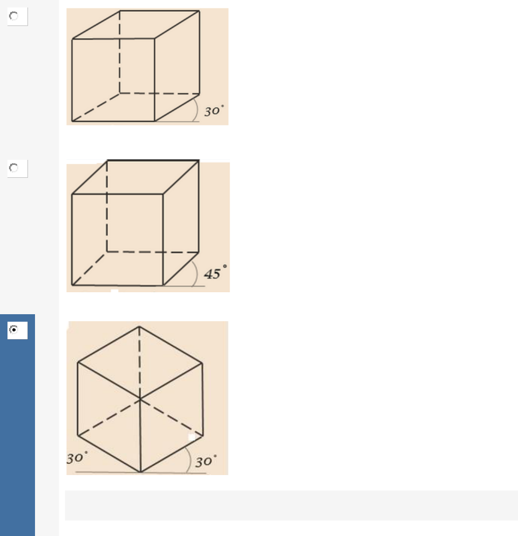 Questão 1/10 Muitas vezes a visualização de um desenho apenas nas suas projeções ortogonais pode ser complicado e pode-se amenizar tal fato com o uso de um desenho em perspectiva. Existem alguns tipos de perspectivas em desenho técnico, porém a mais utilizada é a perspectiva isométrica. Qual das perspectivas a seguir representa o ângulo correto para se desenhar uma perspectiva isométrica? A B C Você acertou! Resposta: rota de aprendizagem aula 2 D Questão 2/10 Existem peças com muitos detalhes que não são vistos normalmente, tais como: furos, roscas, ranhuras, rebaixos e detalhes internos e que precisam ser informados para que a peça seja visualizada corretamente. Para essa visualização é usado um tipo de linha, na mesma espessura das linhas principais da peça e que indicam esses detalhes internos e até detalhes do lado oposto da peça, oculto por uma determinada face. Para essa visualização, qual o tipo de linha deve ser usado? A Linhas tracejadas Você acertou! Resposta: rota de aprendizagem aula 2 B Linhas traço e ponto C Linhas de centro D Linhas traço dois pontos Questão 3/10 Um desenho técnico apresenta as linhas e faces de uma peça, porém nem sempre é o suficiente para se produzir um objeto, pois é necessário se conhecer o seu tamanho, ou seja, suas dimensões as quais irão definir as características geométricas do objeto. Esse conjunto de informações é chamado de sistemas de cotagem. Qual é a norma regulamentadora desse sistema de cotagem? A NBR 9.004 B NBR 10.126 Você acertou! Resposta: rota de aprendizagem aula 3 C NBR 10.209-2 D NBR 17.007 Questão 4/10 Existem algumas regras gerais para fazer a cotagem em desenhos técnicos, analise o parágrafo a seguir e responda a alternativa que o preenche corretamente as lacunas em branco: “As linhas __________ e de cotas devem ser desenhadas com linhas _________ e um pequeno __________ deve ser deixado entre a linha de __________ e a linha __________.” A auxiliares – finas – espaço – contorno – auxiliar Você acertou! Resposta: rota de aprendizagem aula 3 B cheias – grossas – espaço – centro – cheia C auxiliares – grossas – detalhe – contorno – cheia D tracejadas – finas – espaço – cheia – auxiliar Questão 5/10 Complete os espaços em branco no parágrafo a seguir, em relação ao local correto de colocação das cotas em desenhos técnicos: “Nas linhas de cotas __________ o número (valor da cota) deverá estar __________ da linha de cota, enquanto que nas cotas __________ o número deverá estar à __________ da linha de cota”. A verticais – abaixo – horizontais – abaixo B horizontais – acima – verticais – esquerda Você acertou! Resposta: rota de aprendizagem aula 3 C horizontais – abaixo – verticais – esquerda D verticais – direita – horizontais - acima Questão 6/10 Quando temos que desenhar peças com grandes dimensões muitas vezes as vistas ortogonais não cabem na folha de desenho então devemos se utilizar das escalas de medida, ou seja, se a peça for grande devemos usar uma escala de redução e ao contrário uma escala de ampliação afim de poder representar a peça dentro da folha de desenho. Assinale a alternativa que preenche corretamente os campos indicados com o sinal (?) na tabela a seguir: A 1 : 2 – 2 : 1 – 370 cm – 1 cm B 2 : 1 – 1 : 2 – 640 cm – 1.000 cm C 2 : 1 – 1 : 2 – 740 cm – 100 cm Resposta: rota de aprendizagem aula 3 D 1 : 2 – 2 : 1 – 740 cm – 100 cm Questão 7/10 Assinale a alternativa que apresenta corretamente as três vistas ortogonais no 1° diedro da peça desenhada em perspectiva a seguir: A B C Você acertou! Resposta: rota de aprendizagem aula 3 D Questão 8/10 Observe a peça desenhada em perspectiva e assinale a alternativa que apresenta corretamente as três vistas ortogonais no 1° diedro: A B Você acertou! Resposta: rota de aprendizagem aula 3 C D Questão 9/10 Nos desenhos técnicos além das cotas que nos dão a noção exata do tamanho do objeto a ser fabricado, temos também alguns símbolos usados, os quais nos indicam uma série de particularidade nos desenho. Relacione a coluna A (símbolo) com a coluna B (definição do símbolo). A D – B – C - A B D – B – A – C Você acertou! Resposta: rota de aprendizagem aula 3 C B – C – A – D D B – D – C - A Questão 10/10 O Desenho Técnico é uma expressão gráfica que tem por finalidade a representação de forma, dimensão e posição de objetos de acordo com as necessidades de um projeto. Para uma padronização dos desenhos e para que eles sejam uma linguagem universal, é preciso seguir alguns padrões. Nas representações ortogonais podemos utilizar dois tipos de projeção das vistas, são eles 1° Diedro e 3° Diedro. Analise as proposições a seguir e marque V para as verdadeiras ou F para as falsas, em relação a esses Diedros e marque a alternativa correta: ( ) O sistema de projeção no 1º Diedro é conhecido como Método Alemão ( ) O sistema de projeção no 1º Diedro é adotado pela ABNT ( ) O sistema de projeção no 3º Diedro é adotado pela norma alemã DIN ( ) O sistema de projeção no 3º Diedro é conhecido como Método Americano A V – V – V – V B V – F – V – V C F – V – V – F D V – V – F – V Você acertou! Resposta: rota de aprendizagem aula 2