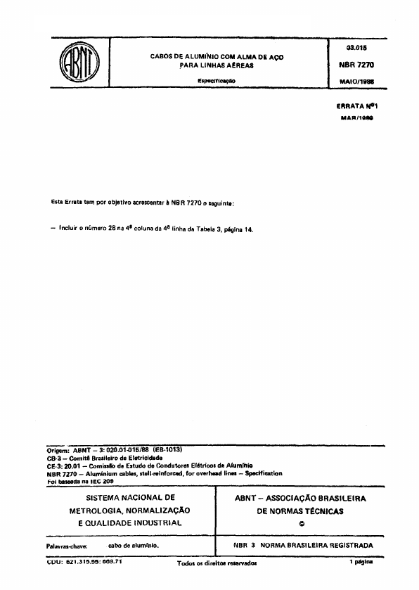 3 WdlS CABOS DE ALUMiNlO COM ALMA DE AC0 PARA LINHAS ACREAS NBR 7270 I’ Especificap% MAIO/lOS8 ERRATA N=l MAR110W Esta Errata tern par objetlvo acrescentar b NBR 7270 o teguinte: - Muir o nOrnero 28 ne 4” coluna da 4a linha da Tab& 3. p6glna 14. Origem: ABNT - 3: 020.01016/88 (EB-1013) C&3 - Cornit& Brarileiro de Eletricidsde - CE-3: 20.01 - CombsSo de Estudo de Candutoras EYtrimr da Alumti’da NBR 7270 - Aluminium cables, StOk’einfwXd, for overhand linm - BpWifieation Foi baseads na IEC 209 SISTEMA NACIONAL DE ABNf - ASSOClA@tO BRASILEIRA METROLOGIA, NORMALIZACAO DE NORMAS Tl!CNlCAS E QUALIDADE INDUSTRIAL e Palavmschave: cab0 de slumlnio. I NBR 3 NORMA BRASILEIRA REGISTRADA CDU: 521.315.55: 669.71 Todor 01 direitce rasrvadol 1 p6griu CABOS DE ALUMlklO COM ALMA DE AC0 PARA LINHAS Al!REAS SUMARIO 1 ObJativo 2 Normm compbmrntms 3 Definblh 4 Condiqh !~enlr 6 Cod&b9 rawffiar 6 Inrpe$uLl 7 Acait@a e mjri#o ANEXO A -Tab&s I OBJETIVO Esta Norma fixa as condigoes exigiveis na qualificagk e na aceitagao e/au rece- bimento de cabos de aluminio corn alma de ago (CAA), empregados em linhas aereas, corn ou sem cobertura. 2 NORMAS COMPLEMENTARES Na aplicagk desta Norma i necessirio consultar: NBR 5118 - Fios de aluminio nus de segk circular para fins elitricos - Espe- cif icagk NBR 5456 - Eletricidade geral - Terminologia NBR 5471 - Condutores eletricos - Terminologia NBR 6238 - Ensaio de envelhecimento acelerado para flos e cabos elitricos - Mitodo de ensaio NBR 6241 - Tragao i ruptura em materiais isolantes e coberturas protetoras ex trudadas para fios e cabos eletricos - Mdtodo de ensaio Origem: ABNT - 3: 02O.Ol~lE&1013~ C&3 - Cornit Bmsileim de ‘Elstrioidsdr, CE.3: 20.01 - ComipeO de Ermdo do condntorm EMricos de Alumlnio NBR 7270 - Aluminium cables. stell-reinforesd. for ovsrhud lines - spscitiation Foi baseada na IEC 209 SISTEMA NACIONAL DE ABNT - ASSOCIA~AO BRASILEIRA WETROLOGIA, NORMALlZA@O DE NORMAS TltCNICAS E OUALIDADE INDUSTRIAL 0 hlWU+MYR c&a da aluminio. NBR 3 NORMA BRASILEIRA REGISTAADA CDU: S21.316.SSz 669.71 Tdaadbda~ 21 plgmas C6pia impressa pelo Sistema CENWIN 2 NBR727lll1988 NBR 6242 - Verificagao dimensional para fios e cabos eletricos - bitodo de en saio NBR 6243 - Choque tirmico para fios e cabos eletricos - Mitodo de ensaio NBR 6756 - Fios de a$o zincados para alma de cabos de aluminio e aluminio li- ga - EspecificaGao NBR 7272 - Condutor elitrico de aluminio - Ruptura a caracteristica dimensio- nal - Hetodo de ensaio NBR 7302 - Condutores elitricos de aluminio - Tensso-deforma$o em condutores de aluminio - Metodo de ensaio F8R 7308 - Carreteis de madeira para condutores nus de aluminio - Caracteris- ticas dimensionais e estruturais - Padroniza$o NER 7310 - Transporte, armazenamento e utilizagao de bobinas de condutores e- letricos em madeira - Procedimento NBR 7312 - Roles de fios e cabos elitricos - Caracteristicas dimensionais - Pad ron i zacao 3 DEFlNlCdES OS termos ticnicos utilizados nesta Norma estso deflnidos nas NBR 5456 e NBR 5471, complementados por 3.1 e 3.2. 3.1 Rekzp;io ok? encordomento Razao entre o comprimento axial de uma hilice completa de fio encordoado a o dii metro externo da hilice. 3.2 Espu7.4 Carretel destinado a receber OS fios componentes do condutor para o processo de encordoamento. 4 CONDlCdES GERAIS 4.1 ccmdutor 4.1.1 Material OS fios componentes dos cabos devem ser de aluminio de tPmpera H 19, conform NBR 5118 e de ago zincado, conforme NBR 6756. 4.1.2 Acahmento 0 cabo nao deve apresentar fissuras, rebarbas, estrias, inclusoes, falhas de an- cordoamento ou outros defeitos que comprometam o desempenho do produto. 4.1.3 Emendas 4.1.3.1 Go sso permitidas emendas nos fios de a50 zincado. 4.1.3.2 Durante o encordoamento nao devem ser feitas emendas nos fios de alumi- C6pia impressa pelo Sistema CENWIN NBR 727OlWB8 3 nio corn o objetivo de aproveitar espulas contend0 sobras de fio 4.1.3.3 Somente sao permitidas eme,ndas nos fios de aluminio rompidos devido a ocorrkcias acidentais, durante o process0 de encordoamento. As emendas devem conservar a forma geomitrica do fio original 4.1.3.4 As emendas nos fios de aluminio, feitas durante o encordoamento, devem estar separadas por mais de I5 m de qualquer outra emenda, em qualquer coroa e sao permitidas, no miximo, q uatro por lance de condutor. As emendas devem ser feitas por pressa a frio, solda elitrica de topo ou outro mdtodo adequado e de acordo corn a boa prjtica comercial. Nos fios corn emendas feitas por solda ele- trica de topo, deve ser efetuado tratamento termico de recozimento ati uma dis- t8ncia minima de 250 mm de cada lado da emenda. 4.1.3.5 As emendas feitas por solda elitrica de topo e seguidas de recozimen- to, devem apresentar ten&o de ruptura superior a 75 MPa e rs feitas por pres- Go a frio, ten&o de rutptura superior a 130 MPa, nso sendo exigido, porim, ne nhum requisite quanta a dutilidade. 4.1.4 Engmxcmento Quando solicitado pelo comprador, o cabo deve ser fornecido corn uma protecao de graxa aplicada sobre a alma de aco (ver 5.9). 4.2 Acondiciona?nento e fofomecimento 4.2.1 OS cabos devem ser acondicionados em role ou carretel. OS carreteis de- vem estar de acordo corn a NBR 7308 e OS roles de acordo corn a NBR 7312. 4.2.2 0 transporte, armazenamento e utilizagao das bobonas devem ser feitos de acordo corn a NBR 7310. 4.2.3 Nos lances de fabricagao i permitida a seguinte tolersncia sobre o com- primento nominal: a) + 5% nos cabos de segao nominal de aluminio superior a 35 mm2; b) + 10% nos cabos de secao nominal de aluminio inferior a 35 mm2. 4.2.4 E permitida a entrega de ati 10% da massa da encomenda em lances nao in- feriores a 50% do comprimento nominal. 4.2.5 A quantidade em massa da encomenda pode sofrer uma toler8ncia de entrega de ?: 5%. 4.2.6 OS carreteis devem ser marcados nas duas faces laterais externas, direta mente sobre o disco ou por meio de plaqueta metalica, corn caracteres legivies e Indeleveis, corn pelo menos as seguintes indicaghes: a) nome do fabricante 