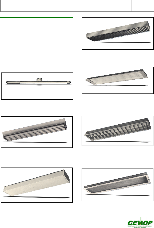 Obras Civis 1 Instalações Elétricas / Telefônicas 1.06 Luminária Internas 1.06.09 1 0011.. DDEEFFIINNIIÇÇÃÃOO Consiste no fornecimento e instalação de luminárias internas em edificações. Poderão ser instaladas com ou sem suas respectivas lâmpadas (incandescentes, fluorescentes, mistas e a vapor de mercúrio) e seus reatores. Materiais Para efeito de referência desta Especificação serão adotados os seguintes modelos de luminárias internas: Fig. 01. Luminária Fluorescente Tubular MODÊLO PELOTAS REF. 6465 Fig. 02. Luminária Fluorescente Plafonier Aberta (sem difusor) MODÊLO PELOTAS REF. 6410 Fig. 03. Luminária Plafonier com Difusor Plano em Poliestireno ou Acrílico MODÊLO PELOTAS REF. 1014 Fig. 04. Luminária Plaflonier com Aletas MODÊLO PELOTAS REF. 6478 Fig. 05. Luminária Fluorescente de Embutir Aberta MODÊLO PELOTAS REF. 8157 Fig. 06. Luminária Fluorescente de Embutir com Aletas MODÊLO PELOTAS REF. 6440 Fig. 07. Luminária de Embutir com Difusor Plano de Poliestireno ou Acrílico MODÊLO PELOTAS REF. 6487 Obras Civis 1 Instalações Elétricas / Telefônicas 1.06 Luminária Internas 1.06.09 2 Fig. 09. Luminária de Embutir com Lâmpada Incandescente 100w MODÊLO PELOTAS REF. EP 987 Fig. 10. Luminária Plafonier Tipo “Drops” MODÊLO PELOTAS REF. 2385 Fig. 11. Lustre com Quatro Braços Metálicos MODÊLO LUSTRES PROJETO REF. C 2085/4 Fig. 12. Spot Tipo Arandela em Alumínio MODÊLO PELOTAS REF. 3894 Fig. 08. Spot com Lâmpada Dicróica MODÊLO DOMINICI REF. SH 968 MODÊLO TECNOLUX REF. FLP-250 Fig. 13. Luminária para lâmpadas fluorescentes de 16w ou 32w para uso pendente ou plafonier MODÊLO TECNOLUX REF. FLP-268 Fig. 14. Luminária para lâmpadas fluorescentes de 16w ou 32w MODÊLO TECNOLUX REF. FLT-6465-T1 Fig. 15. Luminária fluorescente tubular aberta Obras Civis 1 Instalações Elétricas / Telefônicas 1.06 Luminária Internas 1.06.09 3 0022.. MMÉÉTTOODDOO EEXXEECCUUTTIIVVOO A montagem seguirá as orientações do fabricante e do projeto. Basicamente, compreenderá: ? A locação conforme projeto; ? A fixação da luminária na forma indicada no projeto; ? A ligação elétrica da mesma às bases do reator, quando houver; ? A instalação das lâmpadas e reposição de forro, se houver; ? O teste de funcionamento. 0033.. CCRRIITTÉÉRRIIOOSS DDEE CCOONNTTRROOLLEE Controle do material As luminárias, sejam para lâmpadas fluorescentes ou incandescentes, mistas ou a vapor de mercúrio obedecerão às Normas pertinentes da ABNT, tendo resistência adequada e possuindo espaço suficiente para permitir as ligações necessárias. Independentemente do aspecto estético desejado serão observadas as recomendações a seguir : ? Todas as peças de aço das luminárias serão protegidas contra corrosão, mediante pintura, esmaltação, zincagem ou outros processos equivalentes; ? As peças de vidro das luminárias deverão ser montadas de forma a oferecer segurança, tendo espessura adequada e arestas expostas lapidadas, de forma a evitar cortes quando manipuladas. ? As luminárias destinadas a embutir deverão ser construídas de material incombustível e que não seja danificado sob condições normais de serviço. Seu invólucro deverá abrigar todas as partes vivas ou condutores de energia, condutos e porta-lâmpadas, permitindo-se, porém, a fixação de lâmpadas e “starters” na sua face externa; ? Luminárias destinadas a funcionar em locais úmidos, deverão ser construídas de forma a impedir a penetração de umidade em eletroduto, porta-lâmpadas e demais partes elétricas. Não se devem empregar materiais absorventes nesses aparelhos; ? Toda luminária deverá apresentar, em local visível, as seguintes informações: MODÊLO TECNOLUX REF. FLT-6465-T2 Fig. 16. Luminária fluorescente tubular aberta MODÊLO TECNOLUX REF. SP-572 Fig. 17. Luminária projetor MODÊLO TECNOLUX REF. SP-811 Fig. 18. Luminária projetor, com (SP 811B) ou sem (SP 811) aletas e difusor Obras Civis 1 Instalações Elétricas / Telefônicas 1.06 Luminária Internas 1.06.09 4 ? Nome do fabricante ou marca registrada; ? Tensão de alimentação; ? Potências máximas dos dispositivos que nele podem ser instalados (lâmpadas, reatores, etc.); Controle da instalação A montagem deverá estar rigorosamente de acordo com o projeto e as especificações do fabricante. Antes da energização deverá ser verificada a situação das ligações e, após, se foco e luminosidade estão de acordo com o projetado, com o auxílio de um luxímetro. 0044.. CCRRIITTÉÉRRIIOOSS DDEE MMEEDDIIÇÇÃÃOO EE PPAAGGAAMMEENNTTOO A medição será por a unidade (un) instalada, testada e aceita pela Fiscalização. O pagamento será por preço unitário contratual e conforme medição aprovada pela Fiscalização. 0055.. DDOOCCUUMMEENNTTOOSS DDEE RREEFFEERRÊÊNNCCIIAA FONTE CÓDIGO DESCRIÇÃO ABNT NBR 05456 Eletricidade Geral ABNT NBR 05461 Iluminação ABNT NBR 13298 Luminária para Lâmpada Tubular Fluorescente ABNT NBR 13299 Luminária para Lâmpada Tubular Fluorescente - Ensaios Definição Método Executivo Critérios de Controle Critérios de Medição e Pagamento Documentos de Referência