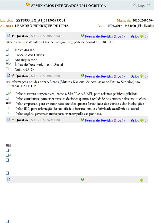 SEMINÁRIOS INTEGRADOS EM LOGÍSTICA Lupa Exercício: GST0838_EX_A1_201502405504 Matrícula: 201502405504 Aluno(a): LEANDRO HENRIQUE DE LIMA Data: 13/09/2016 19:51:00 (Finalizada) 1a Questão (Ref.: 201503068024) Fórum de Dúvidas (1 de 1) Saiba (0) Através do sitio da internet ¿emec.mec.gov.br¿, pode-se consultar, EXCETO: Índice das IES Conceito dos Cursos Ato Regulatório Índice de Desenvolvimento Social Nota ENADE 2a Questão (Ref.: 201503068020) Fórum de Dúvidas (1 de 1) Saiba (0) As informações obtidas com o Sinaes (Sistema Nacional de Avaliação do Ensino Superior) são utilizadas, EXCETO: Pelos sistemas corporativos, como o SIAPE e o SIAFI, para orientar políticas públicas. Pelos estudantes, para orientar suas decisões quanto à realidade dos cursos e das instituições. Pelas empresas, para orientar suas decisões quanto à realidade dos cursos e das instituições. Pelas IES, para orientação da sua eficácia institucional e efetividade acadêmica e social. Pelos órgãos governamentais para orientar políticas públicas. 3a Questão (Ref.: 201502695718) Fórum de Dúvidas (1 de 1) Saiba (0) O Sistema Nacional de Avaliação da Educação Superior (SINAIS) analisa as Instituições de Ensino Superior (IES), os cursos e o desempenho dos estudantes, considerando vários aspectos. O ENADE (Exame Nacional de Desempenho dos Estudantes) é um dos componentes do SINAIS. Marque a afirmativa INCORRETA referente à importância do ENADE: A realização do ENADE é obrigatória para a obtenção do diploma. O ENADE serve para medir o desempenho do curso superior e da IES O ENADE serve para avaliar o histórico escolar do aluno. A avaliação do ENADE é composta de uma prova com 10 questões de formação geral e 30 de conhecimento específico da área (discursiva e múltipla escolha) para medir o conhecimento do aluno. O ENADE serve para aferir o rendimento dos alunos dos cursos superiores. 4a Questão (Ref.: 201502700582) Fórum de Dúvidas (1 de 1) Saiba (0) O SINAES reúne informações do Exame Nacional de Desempenho de Estudantes (ENADE) e das avaliações institucionais e dos cursos. Com relação às informações obtidas nesse exame, analise as afirmações sobre sua utilização e escolha a opção correta. I - Para orientação institucional de estabelecimentos de ensino superior e para embasar políticas públicas. II - São úteis para a sociedade, especialmente aos estudantes, como referência quanto às condições de cursos e instituições. III - São utilizados por empresas na seleção de funcionários e estagiários. Somente I e III estão corretas. Somente II está correta. Todas estão corretas. Somente I está correta. Somente I e II estão corretas. 5a Questão (Ref.: 201502700583) Fórum de Dúvidas (1 de 1) Saiba (0) Em relação ao ENADE analise as afirmações e escolha a opção correta. I - É o Exame Nacional de Desempenho de Estudantes (Enade), que integra o Sistema Nacional de Avaliação da Educação Superior (Sinaes). II - A prova é composta de 40 questões no total, sendo 20 questões da parte de formação geral e 20 da parte de conhecimento específico da área, contendo as duas partes questões discursivas e de múltipla escolha. Prova de Conhecimento específico da área vale 50% da nota. III - Serve para aferir o rendimento dos alunos dos cursos de graduação em relação aos conteúdos programáticos, suas habilidades e competências e avaliar a qualidade das Instituições de Ensino Superior de todo o Brasil. Todas estão corretas Somente I está correta. Somente I e II estão corretas. Somente II está correta. Somente I e III estão corretas. 6a Questão (Ref.: 201503068030) Fórum de Dúvidas (1 de 1) Saiba (0) Assinale a alternativa INCORRETA: O Sinaes avalia todos os aspectos que giram em torno desses três eixos: o ensino, a pesquisa, a extensão, a responsabilidade social, o desempenho dos alunos, a gestão da instituição, o corpo docente, as instalações e vários outros aspectos. O Sinaes possui uma série de instrumentos complementares: auto-avaliação, avaliação externa, Enade, Avaliação dos cursos de graduação e instrumentos de informação (censo e cadastro). Os processos avaliativos são coordenados e supervisionados pela Comissão Internacional de Avaliação da Educação (CIAE). Os resultados das avaliações possibilitam traçar um panorama da qualidade dos cursos e instituições de educação superior no País. Criado pela Lei n° 10.861, de 14 de abril de 2004, o Sistema Nacional de Avaliação da Educação Superior (Sinaes) é formado por três componentes principais: a avaliação das instituições, dos cursos e do desempenho dos estudantes. SEMINÁRIOS INTEGRADOS EM LOGÍSTICA Lupa Exercício: GST0838_EX_A2_201502405504 Matrícula: 201502405504 Aluno(a): LEANDRO HENRIQUE DE LIMA Data: 13/09/2016 20:30:21 (Finalizada) 1a Questão (Ref.: 201502697670) Fórum de Dúvidas (1 de 3) Saiba (0) 33% dos brasileiros têm domínio da leitura e da escrita, enquanto 67% não dominam a leitura e a escrita. 11% dos municípios brasileiros possuem livrarias, enquanto 89% não possuem livrarias. Relacione essas estatísticas às seguintes informações: O Ministério da Cultura divulgou, em 2008, que o Brasil não só produz mais da metade dos livros do continente americano, como também tem parque gráfico atualizado, excelente nível de produção editorial e grande quantidade de papel. Estima-se que 73% dos livros do país estejam nas mãos de 16% da população. Para melhorar essa situação, é necessário que o Brasil adote políticas públicas capazes de conduzir o país à formação de uma sociedade leitora. Qual das seguintes ações NÃO contribui para a formação de uma sociedade leitora? Uso da literatura como estratégia de motivação dos estudantes, contribuindo para uma leitura mais prazerosa. Exigência de acervo mínimo de livros, impressos e eletrônicos, com gêneros diversificados, para a