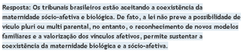 DIREITO CIVIL V – SEMANA 11 Caso Concreto Dra. Ana Carolina, Jorge é meu enteado desde que tinha mais ou menos dois anos de idade. Sua mãe faleceu no parto e desde pequeno sempre cuidei dele como se fosse meu filho. Temos um relacionamento muito próximo e agora que ele já possui 19 anos gostaríamos de documentar nosso parentesco. Consultei outro advogado que disse-me que a única opção para reconhecê-lo como filho seria realizar a adoção, o que implicaria, automaticamente na retirada do nome da mãe biológica dele da certidão de nascimento. Mas não é isso que queremos. Quero ser reconhecida como a mãe afetiva de Jorge, sem que isso implique necessariamente a exclusão da mãe biológica em respeito à sua memória. Não há nenhuma outra alternativa para a nossa situação? O que você aconselharia à sua cliente? Explique sua resposta em até dez linhas. Questão objetiva 1 (VII OAB) A respeito da perfilhação é correto dizer que: X a. constitui ato formal, de livre vontade, irretratável, incondicional e personalíssimo. Art.1607 e 1610 C.C. b. se torna perfeita exclusivamente por escritura pública ou instrumento particular. c. não admite o reconhecimento de filhos já falecidos, quando estes hajam deixado descendentes. d. em se tratando de filhos maiores, dispensa-se o consentimento destes. Questão objetiva 2 (TJRO 2012) Em relação ao registro de filhos, analise as assertivas em conformidade com o disposto no Código Civil. I. A lei presume que os filhos de mulheres casadas há mais de 180 dias são do marido, sendo dispensável a presença do pai no dia do registro. Art.1597 I II. Para registrar o filho nascido após a morte do marido, será necessária a concordância dos herdeiros, não recaindo nenhum tipo de presunção. 1597 III III. O reconhecimento voluntário do filho pode ser tanto direto no registro, como em escritura pública apartada .art. 1609 C.C IV. O reconhecimento voluntário do filho pode ser anterior ao seu nascimento, e é por natureza irretratável. Art. 1610 C.C Assinale a alternativa correta: a. São verdadeiras apenas as assertivas III e IV. b. São verdadeiras apenas as assertivas I e II. c. Todas as assertivas são verdadeiras. X d. São verdadeiras apenas as assertivas I, III e IV.