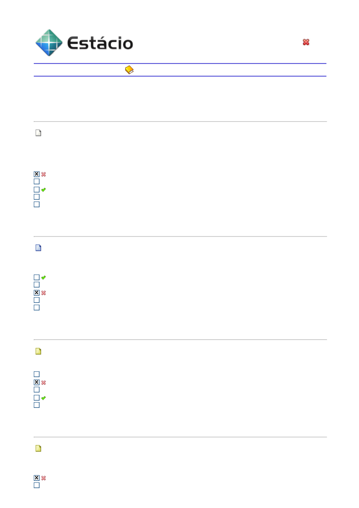 03/12/2016 BDQ Prova http://simulado.estacio.br/bdq_simulados_linear_view.asp 1/2 Fechar ANATOMIA DO APARELHO LOCOMOTOR Simulado: SDE0022_SM_201601623275 V.1 Aluno(a): THALIA TABOSA DOS SANTOS Matrícula: 201601623275 Desempenho: 0 de 0,5 Data: 01/11/2016 20:49:40 (Finalizada) 1a Questão (Ref.: 201602342225) Pontos: 0,0 / 0,1 Sobre a artrologia da coluna podemos afirmar que: os ....(1).... proporcionam a junção das vértebras através de articulações sinoviais planas; e o ligamento ....(2).... proporciona estabilidade à coluna vertebral, conectando as lâminas de vértebras adjacentes. Os termos que completam adequadamente os números (1) e (2) são, respectivamente: (1) discos intervertebrais e (2) amarelo (1) processos articulares e (2) longitudinal anterior (1) processos articulares e (2) amarelo N.d.a. (1) discos intervertebrais e (2) longitudinal anterior 2a Questão (Ref.: 201601706474) Pontos: 0,0 / 0,1 O crânio é composto por 22 ossos, sendo estes dispostos em pares ou não. Em qual sequência os ossos são encontrados aos pares no crânio? Parietal, temporal, maxila, palatino, zigomático, lacrimal, nasal, concha nasal. Parietal, temporal, frontal, esfenóide, palatino, zigomático, nasal. Parietal, temporal, maxila, frontal, etmóide, palatino, zigomático, nasal. Parietal, esfenóide, mandíbula, palatino, zigomático, lacrimal, concha nasal, vômer. Parietal, esfenóide, maxila, palatino, zigomático, lacrimal, vômer, concha nasal. 3a Questão (Ref.: 201602389042) Pontos: 0,0 / 0,1 Quais os ossos que participam da face medial da órbita ocular? Esfenóide e etmoide. Frontal e zigomático. Frontal e esfenoide. Lacrimal e etmoide. Zigomático e esfenoide. 4a Questão (Ref.: 201602344936) Pontos: 0,0 / 0,1 Relacionado a músculos da Face, mimica facial, mastigação e supra e infra hioideos, assinale a alternativa CORRETA. Os músculos esternohioideo, tireohioideo, esternotireoideo e estilohioideo formam os infrahioideo. Todas as alternativas estão falsas. 03/12/2016 BDQ Prova http://simulado.estacio.br/bdq_simulados_linear_view.asp 2/2 O músculo digástrico e dividido em dois ventres (anterior e posterior) e fazem parte dos músculos que forma a assoalho da boca. Omohioideo é um músculo que recebe esse nome por ter origem na escapula e fazer parte dos músculos suprahioideo. Os músculos responsáveis pela mastigação são: masseter, pterigoide medial e lateral, todos participam dos movimentos de abertura, fechamento, protusão e lateralidade da boca. 5a Questão (Ref.: 201601717732) Pontos: 0,0 / 0,1 Um estudo de Marchetto et al. (2002), publicado na Acta Ortopédica Brasileira, apresentou e discutiu os resultados da análise biomecânica, radiográfica e anatômica de 20 peças de coluna cervical de cadáveres humanos, submetidas à corpectomia de C5, discectomia adjacente e estabilização com enxerto de fíbula. Eles concluíram que o enxerto de fíbula é resistente e proporciona estabilidade imediata à coluna cervical quando submetido à carga em flexão. Sendo assim, podese afirmar que o plano e eixo abordado nesse estudo quanto ao movimento de flexão cervical foi: Plano mediano, eixo ânteroposterior Plano mediano, eixo láterolateral Plano frontal, eixo láterolateral Plano transversal, eixo longitudinal Plano transversal, eixo ânteroposterior