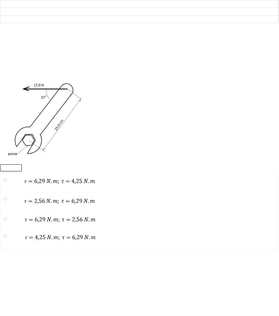 /106145/no Nota: 100 Disciplina(s): Física Mecânica Data de início: 11/10/2016 08:25 Prazo máximo entrega: - Data de entrega: Questão 1/5 - Física Mecânica Um operário está usando uma chave de boca para afrouxar uma porca. A ferramenta tem 25,0 cm de comprimento, e ele exerce uma força de 17,0 N sobre a extremidade do cabo formando um ângulo de 37o com o cabo, veja figura. a) Qual o torque que o operário exerce sobre o centro da porca. b) Qual é o torque máximo que ele pode exercer com essa força, e como a força deve ser orientada? Nota: 20.0 A B C D 05/12/2016 AVA UNIVIRTUS http://univirtu vo/1 2/7 E Questão 2/5 - Física Mecânica O cinturão de asteroides é uma região do Sistema Solar compreendida entre as órbitas de Marte e Júpiter. Os quatro maiores asteroides do cinturão são Ceres, Vesta, Palas e Hígia. Eles compõe mais da metade da massa total do cinturão. Contudo, a maioria de corpos que compõem o cinturão são muito menores. Dois asteroides de grande tamanho podem chocar entre si, formando o que é conhecido como "famílias de asteroides", que possuem composições e características similares. Suponha que dois asteroides (A e B) de igual massa colidam entre si com um estouro luminoso. O asteroide A, que se deslocava inicialmente a 40,0 m/s é desviado em 40,0º da sua direção original, enquanto o asteroide B que estava em repouso, agora se desloca a 45,0 da direção original de A, veja a figura. Ache a velocidade escalar de cada asteroide após a colisão. Nota: 20.0 A V = 25,80 m/s; V = 28,38 m/s B V = 26,49 m/s; V = 35,91 m/s C V = 28,38 m/s; V = 25,80 m/s Você acertou! o A B A B A B Você acertou! 05/12/2016 AVA UNIVIRTUS http://univirtus vo/1 3/7 05/12/2016 AVA UNIVIRTUS http://univirtu vo/1 4/7 D V = 35,38 m/s; V = 26,80 m/s Questão 3/5 - Física Mecânica Um carro utilitário ecológico elétrico de 1200 kg deslocase a 12,0 m/s ao longo de uma rua retilínea. Um Renault Duster de 1800 kg e se deslocando a 20,0 m/s, tem seu centro de massa situado a uma distância de 40,0 m na frente do centro de massa do utilitário, veja figura. Calcule a velocidade do centro de massa total do sistema. Nota: 20.0 A 10,3 m/s A B 05/12/2016 vo/1 5/7 B 16,8 m/s C 40,3 m/s D 54,2 m/s Questão 4/5 - Física Mecânica Um operário está usando uma chave de boca para afrouxar uma porca. A ferramenta tem 25,0 cm de comprimento e ele exerce uma força de 17,0 N sobre a extremidade do cabo formando um ângulo de 52º com o cabo, veja a figura. Qual torque o operário exerce sobre o centro da porca? Nota: 20.0 A 5,64 N.m B 4,10 N.m Você acertou! 05/12/2016 AVA UNIVIRTUS http://univirtus vo/1 6/7 C 3,35 N.m D 2,15 N.m Questão 5/5 - Física Mecânica Um carro utilitário ecológico elétrico de 1200 kg deslocase a 12,0 m/s ao longo de uma rua retilínea. Um Renault Duster de 1800 kg e se deslocando a 20,0 m/s, tem seu centro de massa situado a uma distância de 40,0 m na frente do centro de massa do utilitário, veja figura. Calcule o módulo do momento linear total do sistema constituído pelos dois carros. Nota: 20.0 A 15,0 x 10 kg.m/s B 30,4 x 10 kg.m/s C 40,3 x 10 kg.m/s Você acertou! 3 3 3 05/12/2016 AVA UNIVIRTUS http://univirtu vo/1 7/7 D 50,4 x 10 kg.m/s3 Você acertou!