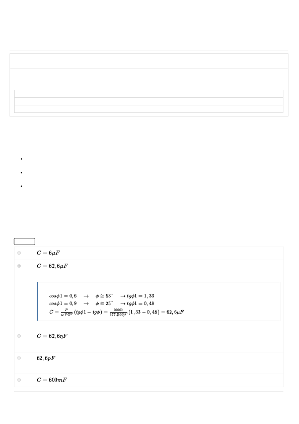 28/12/2016 AVA UNIVIRTUS http://univirtus277877701.saeast1.elb.amazonaws.com/ava/web/#/ava/AvaliacaoUsuarioHistorico/115591/novo/1 1/4 APOL 3 PROTOCOLO: 201611231249148DB140BDIONE FERREIRA DA SILVA - RU: 1249148 Nota: 80 Disciplina(s): Análise de Circuitos Elétricos Data de início: 23/11/2016 18:49 Prazo máximo entrega: - Data de entrega: 23/11/2016 20:35 Questão 1/5 - Análise de Circuitos Elétricos A diminuição do FP de uma instalação se deve a vários fatores, entre os quais citamos: Motores CA operando em vazio ou com pequena carga Transformadores operando em vazio Reatores de lâmpadas fluorescentes A melhoria do FP pode ser feita de várias formas. Mas a principal forma que iremos adotar é o uso de capacitores. Sabendo disso um motor consome uma potência de 10kW a 600V com um FP = 0,6. Calcule a capacitância do capacitor que aumenta a FP para 0,9, sendo a frequência 60HZ Nota: 20.0 A B C D E C = 6μF C = 62, 6μF Você acertou! cosϕ1 = 0, 6 → ϕ≅53° → tgϕ1 = 1, 33 cosϕ1 = 0, 9 → ϕ≅25° → tgϕ1 = 0, 48 C = . (tgϕ1 − tgϕ) = . (1, 33 − 0, 48) = 62, 6μF P ω . VG 2 10000 377.(600) 2 C = 62, 6ηF 62, 6pF C = 600mF 28/12/2016 AVA UNIVIRTUS http://univirtus277877701.saeast1.elb.amazonaws.com/ava/web/#/ava/AvaliacaoUsuarioHistorico/115591/novo/1 2/4 Questão 2/5 - Análise de Circuitos Elétricos Os tópicos abordados referentes a circuito RLC com alimentação senoidal, podese comprovar a sua magnitude intensa e tão vital para a vida humana e além de ser fruto de variadas pesquisas que se fundamenta em seu funcionamento. Assim temos um circuito RLC paralelo visto a seguir: Pedese para determinar, sabendo que a tensão da fonte é de 10V: Corrente em cada componente (IR,IC,IL) Corrente Total Angulo de defasagem da corrente total com IR Nota: 20.0 A B C D E Questão 3/5 - Análise de Circuitos Elétricos Dada a operação com números complexos: Calcular o valor de x Nota: 20.0 IR = 100mA, IC = 100mA, IL = 100mA, I = 300mA, Z = 316Ω, ϕ = 71, 5° IR = 10mA, IC = 20mA, IL = 50mA, I = 31.6mA, Z = 316Ω, ϕ = 71, 5° Você acertou! IR = = 10mA IC = = 20mA IL = = 50mA I = √ IR 2 + (IC − IL) 2 = √ 10 2 + (20 − 50) 2 = 31, 6mA Z = = = 316Ω cosϕ = ⟶ ϕ = 71, 5° 10V 1000Ω 10V 500Ω 10V 200Ω VG I 10V 31 , 6mA 10mA 31 , 6mA IR = 10A, IC = 20A, IL = 50A, I = 31.6A, Z = 316Ω, ϕ = 71, 5° IR = 31.6mA, IC = 20mA, IL = 50mA, I = 300mA, Z = 312Ω, ϕ = 71.5° IR = 1A, IC = 1A, IL = 2A, I = 5A, Z = 10Ω, ϕ = 71.5° 28/12/2016 AVA UNIVIRTUS http://univirtus277877701.saeast1.elb.amazonaws.com/ava/web/#/ava/AvaliacaoUsuarioHistorico/115591/novo/1 3/4 A B C D E Questão 4/5 - Análise de Circuitos Elétricos Dada a operação com números complexos: Calcular o valor de x Nota: 0.0 A B C Você acertou! 28/12/2016 AVA UNIVIRTUS http://univirtus277877701.saeast1.elb.amazonaws.com/ava/web/#/ava/AvaliacaoUsuarioHistorico/115591/novo/1 4/4 D E Questão 5/5 - Análise de Circuitos Elétricos Dada a operação com números complexos: Calcular o valor de x Nota: 20.0 A B C D E Você acertou!