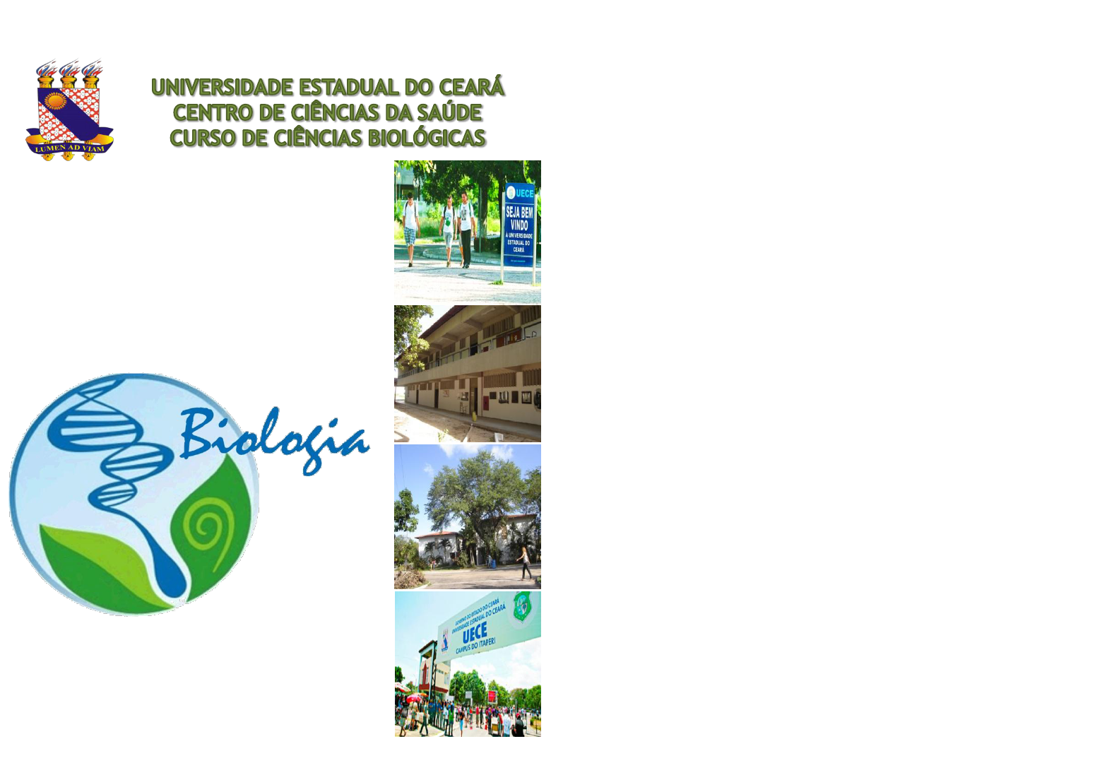 Corpo Docente Profa. Dra. Carminda Sandra Brito Salmito Vanderley Profa. Dra. Celia Maria de Souza Sampaio Prof. MSc. Crisanto Medeiros de Lima Ferreira Prof. Dr. Eliseu Marlônio Pereira de Lucena Profa. MSc. Germana Costa Paixão Prof. Dr. Istvan Major Profa. MSc. Jeanne Barros Leal de Pontes Medeiros Prof.Dr. Luís Flávio Mendes Saraiva Prof. MSc. Luis Gonzaga Sales Junior Profa. Dra. Maria da Penha Baião Passamai Profa. Dra. Maria de Lourdes Oliveira Otoch Profa. Dra. Maria Erivalda Farias de Aragão Profa. PhD. Maria Goretti Araújo de Lima Prof. Dr. Oriel Herrera Bonilla Profa. Dra Patricia Limaverde Nascimento Prof. Dr. Paulo Roberto de Lavor Porto Profa. Dra. Roselita Maria de Souza Mendes Profa. Dra. Sandra Maria Dias Moraes Profa. Dra. Theresa Christine Filgueiras Russo Aragão Prof. MSc. Valberto Barbosa Porto Profa. Dra. Vânia Marilande Ceccatto Prof. Dr. Yves Patric Quinet Agosto - 2014 1 2 CURSO LEI M at ri z C u rr ic u la r d o C u rs o d e C iê n ci as B io ló gi ca s C a rg a h o rá ri a = 3 32 8 h ( in cl u in d o 2 0 8 h o ra s d e A ti v id a d e s C o m p le m e n ta re s) C ré d it o s = 1 8 4 c ré d it o s o b ri g a tó ri o s D u ra çã o m ín im a = 7 s e m e st re s D u ra çã o m á x im a = 1 4 s e m e st re s Lei Nº 6.684, de 3 Setembro de 1979. Capítulo I – Da Profissão de Biólogo Art. 1º O exercício da profissão de Biólogo é privativo dos portadores de diploma: I- devidamente registrado, de bacharel ou licenciado em curso de História Natural, ou de Ciências Biológicas, em todas as especialidades ou de licenciado em Ciências, com habilitação em Biologia, expedido por instituição brasileira oficialmente reconhecida. O curso de Ciências Biológicas é oferecido na modalidade Licenciatura Plena no turno da tarde, objetivando a formação de professores de Ciências Biológicas e de facilitadores do processo ensino/ aprendizagem. Reconhecimento: Resolução 175/97 - CEPE 14/11/97. 3 4 Os egressos do curso de Ciências Biológicas, podem dar continuidade aos estudos em nível de pós-graduação, seguindo mestrados e doutorados ofertados dentro da Universidade Estadual do Ceará – UECE. Mestrados Acadêmicos Programa de Pós-Graduação em Saúde Coletiva Mestrado Acadêmico em Recursos Naturais Programa de Pós-Graduação em Educação – PPGE Mestrado Acadêmico em Geografia Doutorado Próprio Ciências Veterinárias – FAVET Programa de Pós-Graduação em Educação - CED Programa de Pós-Graduação em Saúde Coletiva - CCS Programa de Pós-Graduação em Ciências Fisiológicas – CCS Biotecnologia RENORBIO Programas de Pós-graduação PET Biologia UECE O Programa de Educação Tutorial (PET) do curso de Ciências Biológicas da Universidade Estadual do Ceará é integrante de um programa criado em 1991 pela Coordenação de Aperfeiçoamento de Pessoal de Nível Superior - CAPES - e atualmente está vinculado a Secretaria de Educação Superior do Ministério da Educação - MEC/SESu. Atualmente, o PET Biologia é composto por doze alunos de graduação de Ciências Biológicas da Universidade Estadual do Ceará, e um professor-tutor, cuja função, dentre tantas outras, é orientar os Petianos nas atividades do grupo e estimular a aprendizagem destes nas diversas áreas. O programa visa atuar dentro da tríade, ou três pilares universitários, abordando as áreas de ensino, pesquisa e extensão, abordando transversalmente a indissociabilidade destas. Assim sendo, o programa tem como objetivos principais, o desenvolvimento de atividades acadêmicas que abordem os diversos temas das ciências biológicas, contribuir para a melhoria da qualidade da graduação e estimular uma formação ampla dos alunos ligados diretamente ou indiretamente ao programa. 5 6 Laboratórios Laboratório de Botânica (LABOTAN) Laboratório de Carcinicultura (LACAR) Laboratório de Ecologia (LABOECO) Laboratório de Ecofisiologia Vegetal (ECOFISIO) Laboratório de Etnobiologia e Educação Ambiental (ETNOBIO) Laboratório de Microbiologia (LAMIC) Laboratório de Ornitologia e Sistemática Animal (LORNISA) Laboratório de Interações Inseto-Planta (LABIIP) Laboratório de Eletrofisiologia (LEF) Laboratório de Bioquímica e Expressão Gênica (LABIEX) Laboratório de Biologia Celular (BIOCEL) Laboratório de Bioenergética Laboratório de Entomologia/Mirmecologia (LABIENT) Centro Acadêmico Harpia – Empresa Jr. NEPPSA O Núcleo de Estudos e Práticas Permaculturais do Semiárido (NEPPSA) atua dentro da perspectiva de difundir e desenvolver tecnologias ambientais e sociais voltadas para o semiárido. É baseado no planejamento e implantação de tecnologias simples, integradas e sustentáveis, aliando a satisfação das necessidades humanas de habitação, alimento e energia, à recuperação do equilíbrio ambiental e da diversidade biológica. A Harpia Soluções Ambientais é uma associação simples sem fins, econômicos, que tem por finalidade prestar serviços à comunidade, aos poderes públicos e à iniciativa privada, sob forma remunerada, ou não, nas áreas de gestão ambiental, estudos e análises ambientais, educação ambiental, ecoturismo, assessoria educativa, capacitação de pessoal e consultoria ambiental. Um centro acadêmico no Brasil é uma entidade estudantil que representa os estudantes de um curso de nível superior. Suas funções são diversas: organização de atividades acadêmicas extra-curriculares como debates, palestras e semanas temáticas. A relação que o Centro Acadêmico estabelece com as instâncias burocráticas da instituição pode se dar de forma direta, sendo este parte desta estrutura, ou de forma independente, sendo a entidade estudantil livre de qualquer tipo de interferência institucional. 7 8 8 O curso de Ciências Biológicas proporciona a seus alunos experiências fora dos muros da Universidade seguindo o tripé que constrói o saber acadêmico: ensino, pesquisa e extensão; a partir de p