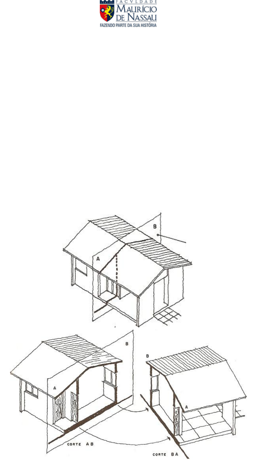 Curso de Arquitetura e Urbanismo / Disciplina: Desenho de Arquitetura CORTES Os cortes são planos verticais que passam pela edificação e dividem-na em duas partes, seja no sentido transversal ou longitudinal. Tem como função apresentar as alturas do projeto, tais como, alturas do pé-direito, do peitoril, das janelas, das portas, da cumeeira, entre outras. A escolha da posição dos cortes na edificação vai depender dos elementos internos que se queira representar, facilitando assim o entendimento do projeto, deve ser disposto de forma que o desenho mostre o máximo de detalhes construtivos. No mínimo são exigidos 02 cortes num projeto, onde um deles deverá passar por alguma área molhada, como banheiro, cozinha, área de serviço. A forma de cotar será somente na vertical, para representar as alturas. Para fazer um corte, necessitamos indicar na planta baixa o local onde o corte estará passando, sua posição, para onde está “mirando”, podemos dizer. O modo de representar a indicação do corte está ao seu critério. Apenas imaginamos em qualquer forma, uma linha que cruza o edifício de um ponto externo a outro, e indicamos com uma seta qualquer sua direção. Assim como na planta baixa, também representamos em traços grossos tudo aquilo que está sendo cortado (estruturas e alvenaria: viga, laje, piso, paredes, etc), em seguida, em traços médios, o que está sendo cortado e não é estrutura, como as janelas, portas, grades das esquadrias, etc, e depois em traços finos, tudo que está em vista, como representações de objetos, bancadas, vasos sanitários, chuveiros. Nos cortes não se representa nada que seja visto através de portas e janelas, considerando-se que estejam fechadas. Alguns termos técnicos: CORTE AB ESCALA: 1/75 Exemplo de corte no banheiro: PLANTA BAIXA ESCALA: 1/75 Existem várias maneiras de se iniciar o desenho de um corte. Vamos começar com o corte A-A, construindo uma linha de terra, e elevando as paredes que estão sendo cortadas a uma altura aproximadamente maior ou igual ao pé-direito desejado. Agora colocamos o nível de piso do banheiro e lançamos a altura do pé-direito junto com a laje (vamos considerar 0,10m de espessura). Lançamos as outras alturas, como de pia, box, forro, chuveiro, colocamos todas as peças (sanitário, pia, chuveiro, etc.) Aplicamos hachuras (note que na parede onde o corte mostra arredondada, aplicamos uma hachura para identificá-la, assim como na pia), e cotamos. E o resultado fica assim: CORTE AA ESCALA 1/75 � A � � � PLANO VERTICAL A B B B B A A B A A B �PAGE � �PAGE �1�
