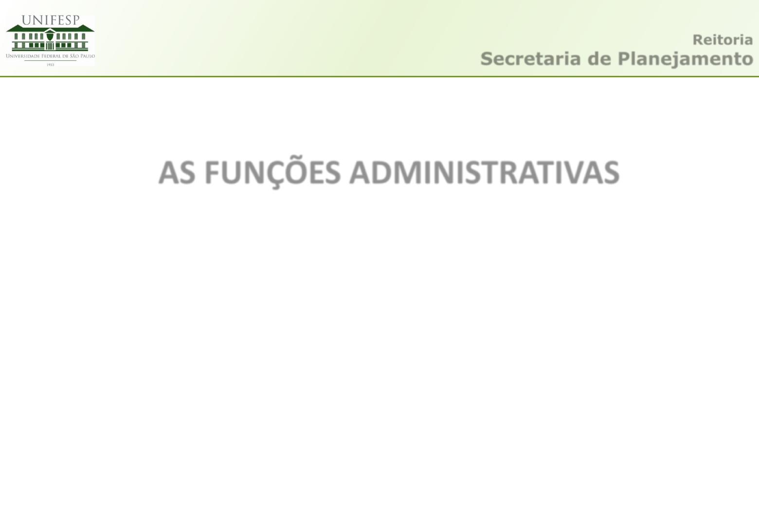 Reitoria Secretaria de Planejamento Reitoria Secretaria de Planejamento Professor Djair Picchiai Campus São Paulo Março 2010 AS FUNÇÕES ADMINISTRATIVAS Reitoria Secretaria de Planejamento Reitoria Secretaria de Planejamento AS FUNÇÕES ADMINISTRATIVAS Todo diretor, gerente, chefe e encarregado exercem estas sete funções administrativas, a saber: •Planejar •Comandar •Organizar •Coordenar •Avaliar •Supervisionar •Controlar O conjunto dessas funções e suas interações constituem o conceito de administração. Professor Djair Picchiai – Março 2010 COMANDAR ORGANIZAR COORDENARAVALIAR SUPERVISIONAR CONTROLAR PLANEJAR ADMINISTRAR Reitoria Secretaria de Planejamento Reitoria Secretaria de Planejamento PLANEJAR É a função administrativa em que se estima os meios que possibilitarão realizar os objetivos (prever), a fim de poder tomar decisões acertadas, com antecipação, de modo que sejam evitados entraves ou interrupções nos processos organizacionais. É também uma forma de se evitar a improvisação. Nesta função, o gerente especifica e seleciona os objetivos a serem alcançados e como fazer para alcançá-los. Exemplos: o chefe de seção dimensiona os recursos necessários (materiais, humanos, etc.), em face dos objetivos e metas a serem atingidos; a montagem de um plano de ação para recuperação de uma área avariada. Professor Djair Picchiai – Março 2010 Reitoria Secretaria de Planejamento Reitoria Secretaria de Planejamento PLANEJAR Planejamento: funciona como a primeira função administradora, pois serve de base para as demais. É uma reflexão que antecede a ação; É um processo permanente e contínuo; É sempre voltado para o futuro; É uma relação entre as coisas a fazer e o tempo disponível para tanto; É mais uma questão de comportamento e atitude da administração do que propriamente um elenco de planos e programas de ação; É a busca da racionalidade nas tomadas de decisões; É um curso de ação escolhido entre várias alternativas de caminhos potenciais; É interativo, pois pressupõe avanços e recuos, alterações e modificações em função de eventos novos ocorridos no ambiente externo e interno da empresa. O planejamento é um processo essencialmente participativo, e todos os funcionários que são objetos do processo devem participar. Para realizar o planejamento, a empresa deve saber onde está agora (presente) e onde pretende chegar (futuro). Para isso, deve dividir o planejamento em cinco fases seqüenciais a saber: Estabelecimento de objetivos e meios para alcançá-los; Tomada de decisões a respeito das ações futuras; Elaboração de planos de ação; Ação empresarial: execução; Controle e avaliação dos resultados. Exemplos de instrumentos de planejamento: orçamento, cronograma, desenho de processo, etc. Professor Djair Picchiai – Março 2010 Reitoria Secretaria de Planejamento Reitoria Secretaria de Planejamento COMANDAR É a função administrativa que consiste basicamente em: Decidir a respeito de “que” (como, onde, quando, com que, com quem) fazer, tendo em vista determinados objetivos a serem conseguidos. Determinar as pessoas, as tarefas que tem que executar. É fundamental para quem comanda desfrutar de certo poder: •Poder de decisão. •Poder de determinação de tarefas a outras pessoas. •Poder de delegar –a possibilidade de conferir a outro parte do próprio poder. •Poder de propor sanções àqueles que cumpriram ou não as determinações feitas. A função de comando é muito mais participativa no hospital, dada a complexidade de suas atividades. O comando de várias especialidades exige uma maior participação dos funcionários. Instrumento de comando: escala de trabalho dos profissionais em plantões e folgas. Professor Djair Picchiai – Março 2010 Reitoria Secretaria de Planejamento Reitoria Secretaria de Planejamento ORGANIZAR É a função administrativa que visa dispor adequadamente os diferentes elementos (materiais, humanos, processos, etc.) que compõem (ou vierem a compor) a organização, com o objetivo de aumentar a sua eficiência, eficácia e efetividade. É constituir o duplo mecanismo, material e social do hospital. Organização Estrutural •É a definição de estrutura básica, a partir da qual tudo o mais se organiza: pessoal, material, etc. •É aquela que define as unidades e os cargos que constituem (ou constituirão) o hospital (e pelas quais se distribuem os recursos), caracterizados segundo: - os níveis hierárquicos que tem; - as funções básicas que serão desenvolvidas. Os desenhos de processos são formas de organização racional e seqüencial das atividades (tarefas, passos) de um serviço do hospital. O fluxograma é a representação gráfica de um desenho de processo. Instrumentos de organização: organograma, manuais de organização, manuais de serviços, etc. Professor Djair Picchiai – Março 2010 Reitoria Secretaria de Planejamento Reitoria Secretaria de Planejamento ORGANIZAÇÃO ESTRUTURAL Professor Djair Picchiai – Março 2010 Unidade assessora ASSISTENTE Unidade administrativa SECRETÁRIA Unidade executiva TÉCNICO Unidade deliberativa DIRETOR Reitoria Secretaria de Planejamento Reitoria Secretaria de Planejamento COORDENAR É a função administrativa que visa ligar, unir, harmonizar todos os atos e todos os esforços coletivos através da qual se estabelece, dentro do hospital, um conjunto de medidas, que tem por objetivo harmonizar recursos e processos. Dois tipos de Coordenação: •Vertical/Hierárquico: É aquela que se faz com as pessoas sempre dentro de uma rigorosa observância das linhas de comando (ou escalões hierárquicos estabelecidos). •Horizontal: É aquela que se estabelece entre as outras pessoas sem observância dos níveis hierárquicos dessas mesmas pessoas. Essa coordenação possibilita a comunicação entre as pessoas de vários departamentos e de diferentes níveis hierárquicos. Risco Básico: