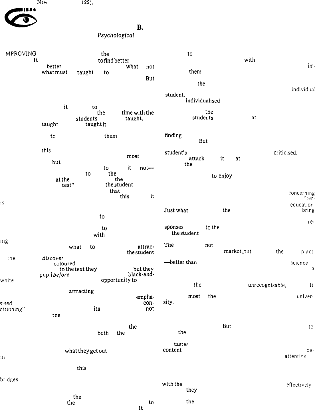 Rcprintcd from New Scientist (Vol. 122), May 20, 1964 New methods and new aims in teaching by Professor B. F. Skinner Psychological Laboratories, Harvard University I MPIXOVING education seldom takes the form of improvingteaching. It is no doubt important to find better teachers, build more and better schools, teach less of what is not needed, bring what must be taught up to date, and reach more students through various forms of mass media. But by 1984, we should hope, teaching itself will also have been improved. The experimental analysis of behaviour, human and animal, has uncovered facts about learning and teaching which were not available when current methods were devised and which should make it possible to improve education in the plain sense of teaching more in the same time with the same effort, As a result more students should be taught, and each should be taught more and taught it more thoroughly. Each student should have a greater choice of programmes and should be able to pursue any one of them more success- fully. Some gain in this direction will come from a further aban- donment of coercive techniques. The cane has in most quar- ters been discarded, but teachers still use less obvious forms of punishment, and-whether we like to admit it or not- most students still study mainly to avoid the consequences of not studying, Even at the university level, the commonest pattern is “assign and test”,in which the student is held responsible for learning simply in the sense that he will suffer certain unhappy consequences if he fails. In this system it IS never the teacher who fails nor can it be, for “assigning and testing” is not really teaching at all. It is not enough, however, simply to abandon coercive practices. The methods of Summerhill are therapeutic rather than educational, Nor will it suffice to replace punitive methods by “enriching” our schools with real life or by turn- lng from textbooks to non-verbal audio-visual media, There IS good reason to make what is to be learned as aRrac- tive as possible, but in doing so we often deprive the student of the chance to .discover that something is interesting when looked into. Brightly coloured illustrations in a reading primer may attract the pupil to the text they accompany, but they entertain the pupi bejore he reads; a page of black-and- white text offers him a much greater opportunity to enjoy the consequences of reading. The audio-visual aids of 1984 will be less concerned with attracting and holding attention. The consequences of behaviour are particularly empha- slsed in the study of what is technically called “operant con- dltloning”, Behaviour reinforced by its consequences is not to be confused with the conditioned reflexes of Pavlov, and only certain instances of operant reinforcement are appropri- ately called rewards. What is important here is the extra- ordinary power-fully demonstrated both in the laboratory and in field applications-to change behaviour in specified ways through properly arranged reinforcements. Students are only slightly affected by what they get out of their education In the long run. It is the immediate consequences of their behaviour which must be carefully examined and altered. Unfortunately, we cannot do this simply by applying some general principle of reinforcement, just as we cannot build bridges simply by applying general principles of stress and strain. The teacher must become a specialist in a rapidly de- veloping scientific analysis of human behaviour. The conspicuous signs of the new technology of teaching in 1984 will probably be the “teaching machines” used to arrange the necessary contingencies of reinforcement. It will be easy to confuse the technology with the equipment. But machines are inevitable. Only with the help of appropriate capital equipment can teachers cope with the problems irn- posed on them by the extraordinary cultural changes and the growth in populations characteristic of the twentieth century Although the word “machine” suggests regimentation, such devices are designed precisely to help the individual student. Students were once taught one at a time, and the ideal of individualised instruction is still preserved in state- ments of educational policy, but the practice has long since succumbed to the exigencies of teaching large classes. Groups of students move forward at a standard pace. Those who could move quickly are held back and grow bored; those who work slowly are pulled forward beyond their speed, finding their work more and more difficult, until they eventu- ally give up. But speed of learning, like speed of reading, has no very important relation to the ultimate quality of the student’s work. The system has often been criticised, but an effective attack upon it has at last come from the effort to arrange the contingencies of reinforcement recommended by an experimental analysis. By 1984 the fast worker will per- haps be permitted to .enjoy his natural advantage, while the slow student will be able to demonstrate that he is capable of comparable achievements given enough time. Another result of applying recent discoveries concernjng learning and teaching has been a reconsideration of the “[et-. minal behaviours”which compose the goals of education Just what changes in the student is the teacher to brmg about? Current specifications are surprisingly vague. A re- lated result has been the construction of sequences of re- spouses leading to the terminal behaviours thus specified, as the student moves from ignorance to competence, Such se- quences are now commonly called programmed instruction, The Principle is not yet well understood, and poorly designed programmes flood the market, hut by 1984 the market place should have had its well-known effect. Excellent programmes -better than any now available if the art and science of programming continue to improve-should be available in a wide range of subjects. Many of the subjects 