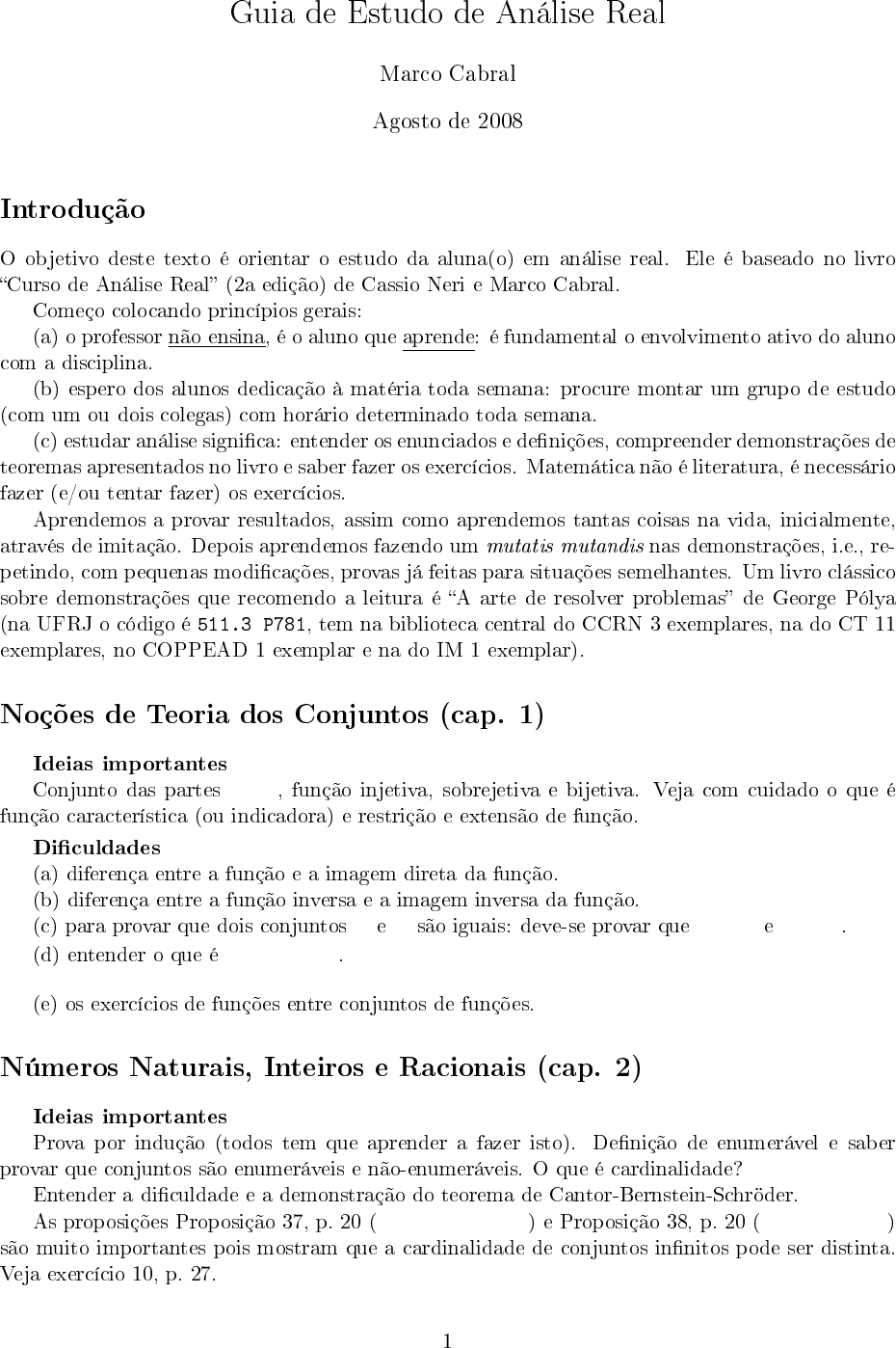 Guia de Estudo de Análise Real Marco Cabral Agosto de 2008 Introdução O objetivo deste texto é orientar o estudo da aluna(o) em análise real. Ele é baseado no livro �Curso de Análise Real� (2a edição) de Cassio Neri e Marco Cabral. Começo colocando princípios gerais: (a) o professor não ensina, é o aluno que aprende: é fundamental o envolvimento ativo do aluno com a disciplina. (b) espero dos alunos dedicação à matéria toda semana: procure montar um grupo de estudo (com um ou dois colegas) com horário determinado toda semana. (c) estudar análise significa: entender os enunciados e definições, compreender demonstrações de teoremas apresentados no livro e saber fazer os exercícios. Matemática não é literatura, é necessário fazer (e/ou tentar fazer) os exercícios. Aprendemos a provar resultados, assim como aprendemos tantas coisas na vida, inicialmente, através de imitação. Depois aprendemos fazendo um mutatis mutandis nas demonstrações, i.e., re- petindo, com pequenas modificações, provas já feitas para situações semelhantes. Um livro clássico sobre demonstrações que recomendo a leitura é �A arte de resolver problemas� de George Pólya (na UFRJ o código é 511.3 P781, tem na biblioteca central do CCRN 3 exemplares, na do CT 11 exemplares, no COPPEAD 1 exemplar e na do IM 1 exemplar). Noções de Teoria dos Conjuntos (cap. 1) Ideias importantes Conjunto das partes P(A), função injetiva, sobrejetiva e bijetiva. Veja com cuidado o que é função característica (ou indicadora) e restrição e extensão de função. Dificuldades (a) diferença entre a função e a imagem direta da função. (b) diferença entre a função inversa e a imagem inversa da função. (c) para provar que dois conjuntos A e B são iguais: deve-se provar que A ⊂ B e B ⊂ A. (d) entender o que é ⋃ q∈Q (q, q + 1). (e) os exercícios de funções entre conjuntos de funções. Números Naturais, Inteiros e Racionais (cap. 2) Ideias importantes Prova por indução (todos tem que aprender a fazer isto). Definição de enumerável e saber provar que conjuntos são enumeráveis e não-enumeráveis. O que é cardinalidade? Entender a dificuldade e a demonstração do teorema de Cantor-Bernstein-Schröder. As proposições Proposição 37, p. 20 (#N = #(N× N)) e Proposição 38, p. 20 (#N < #P(N)) são muito importantes pois mostram que a cardinalidade de conjuntos infinitos pode ser distinta. Veja exercício 10, p. 27. 1 Leia sobre a hipótese do contínuo na página 2.2. O Hotel de Hilbert mostra as dificuldades com infinito e a diferença radical entre R e N. Na Seção 2.4 sobre os Racionais é importante somente a enumerabilidade de Q. O resto apre- senta a definição de corpo (no sentido de álgebra): conjunto munido de duas operações comutativa, distributiva, etc.. Com relação a isto (omita em primeira leitura) veja exercício 45, p. 32, que todo corpo possui um conjunto �tipo� Z contido no corpo. Dificuldades (a) Cuidado com prova por indução: provar que algo é verdade para todo n ∈ N não é o mesmo que provar para n =∞! Veja exercício 2, p. 26. (b) saber provar que os conjuntos são enumeráveis (basta estabelecer injeção, não precisa ser bijeção, com N). Deve-se saber provar porque: Z,Q,N × N,Z × Z,Q × Q são enumeráveis (entre outros). Números Reais (cap. 3) Ideias importantes A seção 3.1 discute as dificuldades com os irracionais. A seção 3.2 (cortes de Dedekind) pode ser omitida: trata-se de construir os reais com ideias geométricas simples. O difícil é definir as operações de soma e produto. Vamos simplesmente (neste momento) axiomatizar os reais. Mais adiante vamos construir os reais como classes de equivalência de sequências de Cauchy. A seção 3.3 apresenta a definição muito importante de sup e inf e assume que R é um corpo ordenado completo (único pelo exercício 31, p. 52). Na definição de intervalos, observe os que serão chamados de abertos e fechados. Leia a com- paração de intervalos com portas (:-)). Termina com o teorema dos intervalos encaixantes: todos devem saber fazer esta demonstração. A prova da não-enumerabilidade de R dada pela Proposi- ção 80, p. 48 é um exercício de abstração: vale a pena tentar entender o argumento (não é fácil). Dificuldades (a) trabalhar com sup e inf em exercícios, que envolve entender bem a definição. (b) provar a irracionalidade de raízes não inteiras. Sequências (cap. 4) Ideias importantes Seção 4.1 define sequências e subsequências. Note que numa subsequência os índices escolhidos tem que crescer de forma estrita. Define-se convergência e prova-se a unicidade do limite (que você deve saber demonstrar!). Estude a relação entre a convergência da sequência e de uma subsequência: verifique se sabe, de fato, o que é uma subsequência. Estude porque 1,0,1,0,1,0 é divergente. Todos devem saber demonstrar que toda sequência convergente é limitada. A seção 4.2 relaciona monotonicidade e convergência. Aprenda a provar que toda sequência monótona limitada é convergente. Teorema MUITO importante é o Bolzano-Weierstrass: todos devem conhecê-lo e saber demonstrá-lo como no exercício 26, p. 73. O conceito de sequências de Cauchy é MUITO importante. Deve-se saber provar que uma sequência é convergente se, e somente se, é de Cauchy. As seções 4.3 e 4.4 são burocráticas. A seção 4.3 adapta definições para limites infinitos e a seção 4.4 verifica que o limite se comporta bem com relação a soma, produto e divisão. O argumento do limite do produto fazendo uma triangulação deve ser entendido e estudado por todos. Este tipo de argumento se repetirá muitos vezes (somar e subtrair o mesmo termo e utilizar desigualdade triangular). A seção 4.5 define limsup e liminf de três modos distintos: veja inicialmente somente o 4.5.1. O 4.5.2 e 4.5.3 são de leitura opcional. Nem toda sequência tem limite, mas toda sequênci