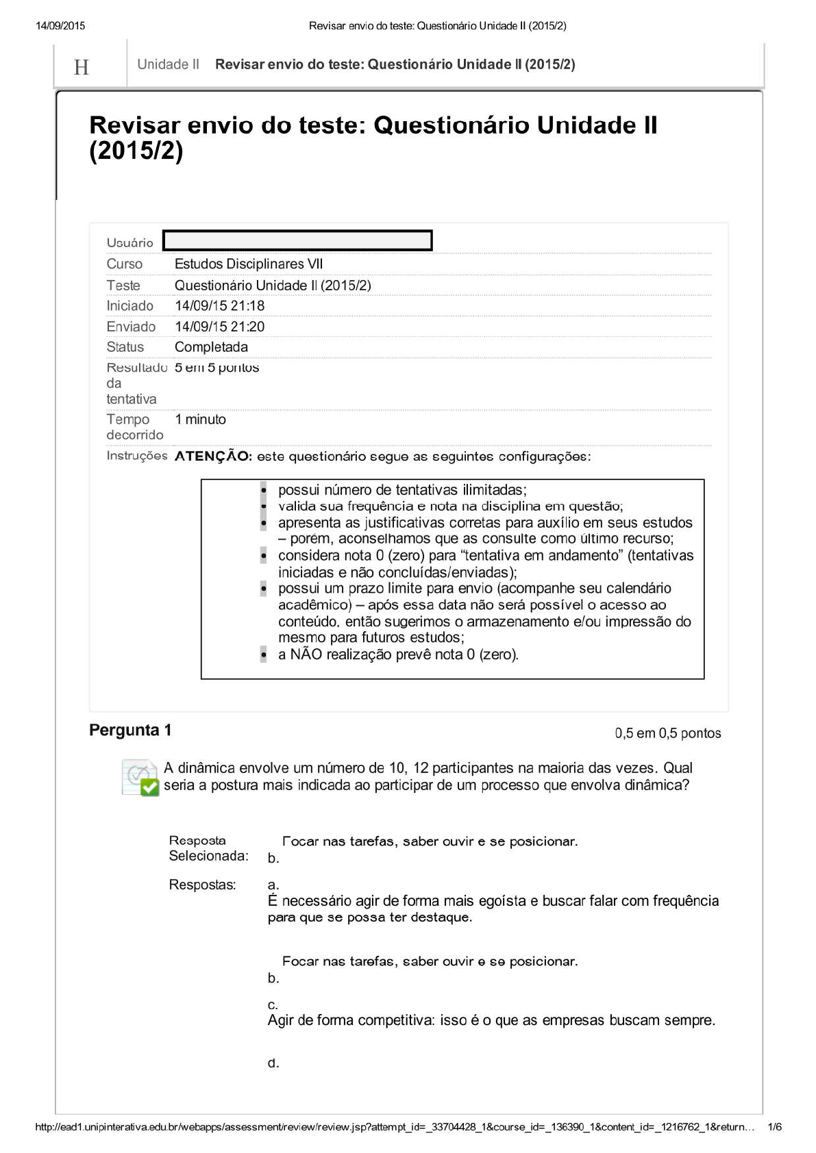 UNIP EAD CONTEÚDOS ACADÊMICOS BIBLIOTECAS MURAL DO ALUNO TUTORIAIS Menu global Fazer teste: QUESTIONÁRIO UNIDADE II ESTUDOS DISCIPLINARES VII (741...