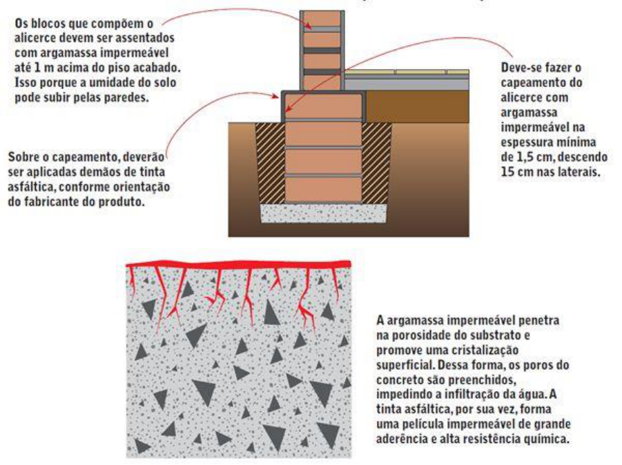 Conheça os sistemas de impermeabilização de fundações diretas Saiba como funcionam os sistemas de impermeabilização usados em elementos de fundação direta Embora não estejam expostas às intempéries, como sol e chuva, as fundações ficam em contato constante com a umidade do solo. Por isso, a impermeabilização é tão importante para evitar que a umidade suba pelas alvenarias e elementos estruturais e provoque uma série de consequências desagradáveis, como destacamentos de revestimentos internos e danos estruturais. Além das tecnologias citadas nesta reportagem, há outras alternativas para impermeabilizar elementos de fundação. O importante é que o sistema escolhido seja adequado à qualidade do solo e às particularidades da obra em questão. Também é imprescindível a aplicação, conforme orientação do fornecedor do produto. VIGA-BALDRAME Geralmente usadas em obras com cargas pequenas (residências) sobre solo firme, a viga-baldrame pode ser de alvenaria, concreto simples ou armado. Uma das etapas obrigatórias em sua execução é a impermeabilização. RADIER O radier é um tipo de fundação que funciona como uma laje de concreto armado. Por ser uma área extensa e mais sujeita às fissuras, o melhor é optar pelos sistemas de impermeabilização mais flexíveis, como as mantas asfálticas, que acompanham a movimentação da laje e criam uma barreira física, evitando que a umidade presente no solo suba para a estrutura pelos poros do concreto. SAPATAS No caso das sapatas, uma solução usual é o capeamento com argamassa impermeável em toda a superfície da fundação (laterais e topo), antes de fechar as cavas. Após secagem completa, aplicase tinta asfáltica impermeável com o auxílio de uma trincha.