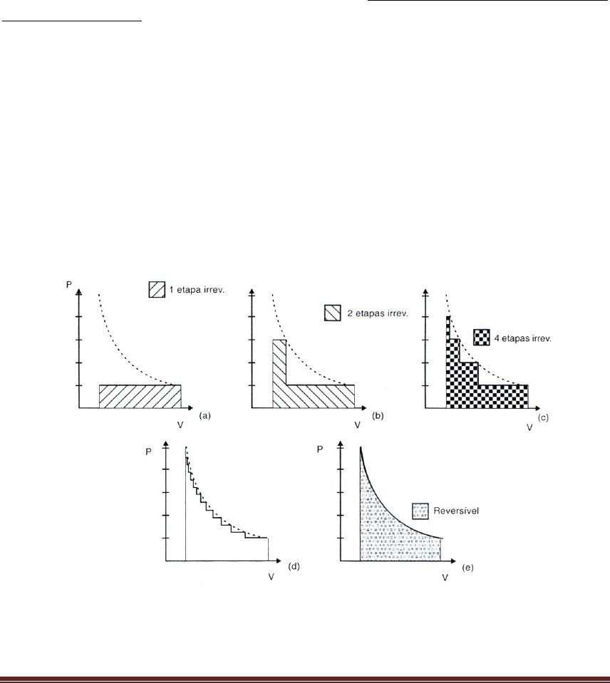 Trabalho de expansão de um gás – prof. Ourides Página 1 Trabalho de Expansão Reversível de um Gás Notas de aula de fisquim I – Prof. Ourides Santin Filho 1 Processos reversíveis e irreversíveis Consideremos um pedaço de gelo e água em equilíbrio a 0 °C. Se fornecermos uma quantidade infinitesimal de energia (calor) a esse sistema, parte do gelo vai se derreter. Ao se retirar uma quantidade de energia do sistema, a pequena porção de água vai voltar à fase de gelo. Chamamos o processo acima de processo reversível. Esse termo significa que a mudança que provocamos pode ser revertida por uma modificação infinitesimal (no caso, a transferência de energia) no sistema. O que define a reversibilidade de um processo é o fato de ele estar em equilíbrio. Vamos comparar o processo acima com aquele que ocorre, por exemplo ao se jogar um pedaço de gelo em um béquer contendo água a 50 °C. O gelo vai se derreter rapidamente e a remoção de uma quantidade infinitesimal de energia não faz com que o sistema retorne à sua condição inicial. Esse processo é dito irreversível. Notemos que, nesse caso, o sistema não está em equilíbrio. 2 Expansão reversível de um gás Voltemos agora à expansão isotérmica do gás contra uma pressão constante, conforme visto no texto anterior. Vejamos um exemplo numérico, apoiados pela figura 1. Suponhamos que uma amostra de gás contido numa seringa esteja à pressão de 4 atm e seu volume seja mantido constante à custa do travamento de seu êmbolo. Consideremos que a pressão externa ao gás seja de 1 atm. Ao se liberar o êmbolo, o gás se expande rapidamente contra essa pressão de 1 atm, até o equilíbrio mecânico. Isso ocorre quando a pressão do gás se iguala à pressão externa. Figura 1: a expansão de um gás executada em uma e mais etapas irreversíveis e num processo reversível. As áreas sob a curva pV correspondem ao trabalho executado pelo gás. Trabalho de expansão de um gás – prof. Ourides Página 2 Pelo gráfico, o trabalho realizado pelo gás corresponde à área do retângulo sombreado, dado pelo produto pext.DV (fig. 1a). O processo anterior não pode ser revertido por um aumento infinitesimal de pressão externa, logo, ele é irreversível. Consideremos agora que o processo ocorra em duas etapas. O gás, inicialmente mantido a 4 atm, se expande contra uma pressão externa constante de 3 atm. Após essa etapa o êmbolo é novamente preso e a pressão externa e reduzida até 1 atm. Novamente o êmbolo é liberado e o gás se expande até essa pressão, entrando em equilíbrio. Nesse novo processo, o trabalho realizado pelo gás corresponde à soma das áreas dos dois retângulos sombreados (fig. 1b). Pode-se ver facilmente que cada uma das etapas é irreversível e que o trabalho total realizado pelo gás (soma das duas áreas) é maior do que no primeiro caso. O mesmo processo, realizado em quatro etapas, está mostrado em outro diagrama indicador (fig. 1c). Claramente, o aumento do número de etapas em que o gás se expande aumenta a quantidade de trabalho que o mesmo pode executar (fig. 1d). Nota-se também que, se aumentarmos o número de etapas até o infinito, o gás vai realizar o trabalho máximo permitido pelo sistema, de tal modo que seu valor corresponde a área sob a curva isotérmica do gás (fig. 1e). Para executar a expansão acima, devemos provocar reduções infinitesimais da pressão externa exercida sobre o gás. Isso equivale à situação em que, a cada instante, a pressão externa é igual à pressão externa. Se executarmos uma expansão infinitesimal, ela será revertida por um aumento infinitesimal da pressão externa. Estamos diante, portanto, de uma expansão reversível. Podemos afirmar, então, que o trabalho máximo executado por um gás ocorre quando ele sofre uma expansão reversível. Não podemos reproduzir a situação acima em laboratório, pois não é possível executar reduções de pressão infinitesimais em sistemas reais, mas podemos simulá-las de modo bem simples. Imaginemos uma amostra de gás mantida na seringa em equilíbrio mecânico contra uma pressão externa de duas atmosferas. Consideremos agora que essa pressão externa seja devido à pressão do ar (1 atm) e de uma quantidade de areia sobre o êmbolo, que aplica mais 3 atm sobre o gás. O êmbolo está livre e o sistema está em equilíbrio mecânico. Retiramos um grão de areia por vez. Fazendo isso, a pressão externa irá diminuir por “um infinitésimo” e o gás vai se expandir. Teoricamente, ao se repor o grão, o gás sofrerá compressão e voltará ao seu estado inicial. Por fim, ao se retirar grão por grão até o final, o gás terá se expandido de modo reversível, realizando o máximo de trabalho que lhe é permitido teoricamente. Vejamos como calcular esse trabalho. Partimos da equação (6) do texto anterior, 𝑤 = −𝑝%&'𝑑𝑉*+*, (1) No caso de expansão reversível, consideramos que a pressão externa era igual à pressão do gás, em cada uma das infinitas etapas de expansão. Nesse caso, podemos escrever para a pressão externa, 𝑝%&' = -./* (2) Substituindo a eq. (2) na eq. (1) e considerando a expansão isotérmica Trabalho de expansão de um gás – prof. Ourides Página 3 𝑤0%1 = − -./* 𝑑𝑉*+*, = −𝑛𝑅𝑇 5* 𝑑𝑉*+*, (3) Integrando, 𝑤0%1 = −𝑛𝑅𝑇 𝑑𝑉𝑉 = −𝑛𝑅𝑇𝑙𝑛*+*, ½*,*+ = −𝑛𝑅𝑇𝑙𝑛 𝑉7𝑉8 𝑤0%1 = −𝑛𝑅𝑇𝑙𝑛 *+*, (4) A expressão acima permite calcular o trabalho máximo que um gás pode executar ao se expandir, de modo reversível.