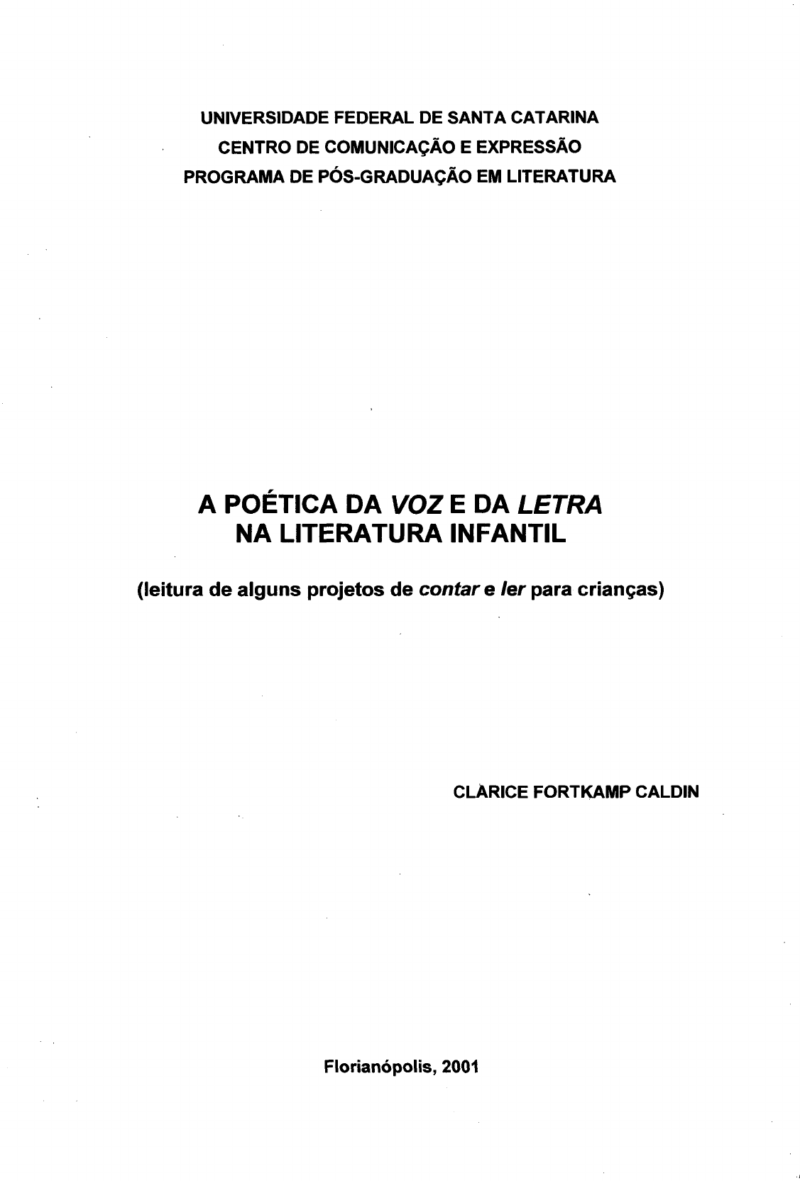 UNIVERSIDADE FEDERAL DE SANTA CATARINA CENTRO DE COMUNICAÇÃO E EXPRESSÃO PROGRAMA DE PÓS-GRADUAÇÃO EM LITERATURA A POÉTICA DA yOZ E DA LETRA NA LITERATURA INFANTIL (leitura de alguns projetos de contar e ler para crianças) CLARICE FORTKAMP CALDIN Florianópolis, 2001 CLARICE FORTKAMP CALDIN A POÉTICA DA yOZ E DA LETRA NA LITERATURA INFANTIL (leitura de alguns projetos de contar b /erpara crianças) Dissertação apresentada como requisito parcial para obtenção de título de Mestre em Literatura do Curso de Pós-Graduação em Literatura da Universidade Federal de Santa Catarina. Orientadora; Prof Dr® Odília Carreirâo Ortiga Florianópolis, junho de 2001. A Poética da Voz e da Letra na Literatura Infantil(leitura de alguns projetos de contar e ler para crianças) Clarice Fortkamp Caldin Esta dissertação foi julgada adequada para a obtenção do título MESTRE EM LITERATURA Área de concentração em Literatura Brasileira e aprovada na sua forma final pelo Curso de Pós-Graduação em Literatura da Universidade Federal de Santa Catarina. /■ f ír -LA Profa. Dra. Odílía Carreirãó Ôrtiga ORI^iTAt Prof^ Dra.ySimo?ié«Pèreira Schmidt CQiORDENADORA DO CURSO BANCA EXAMINADORA; r, / I *rofa. Dra. Odília Çarreirão Ortiga PRESIDENTE Profa./Ora. Simone Pereira Schmidt (UFSC) 4 Prof. Dr. José Roberto Bastos 0'Schea (UFSC) SUPLENTE Dedico esse trabalho à criança que existe em cada um de nós. AGRADECIMENTOS À profa. Solange Medina Ketzer, à profa.Taíza Mara Rauen de Moraes, à sra. Maria Luiza 0 ’Shea Wheler, ao prof. Luciano Martins e Souza e às bibliotecárias Verônica dos Santos Ferreira e Ângela Maria Leite pela disponibilização dos projetos de narração e de leitura. Aos estagiários que realizaram atividades nos projetos. À profa. Eliana Yunes da Pontifícia Universidade Católica do Rio de Janeiro, pelos depoimentos esclarecedores a respeito da Literatura Infantil, pelo incentivo á realização do trabalho e pela acolhida calorosa. À bibliotecária-chefe do CEDOP/FNLIJ Maraney Freire e à sra. Elizabeth D’ Ângelo Serra secretária geral da FNLIJ e diretora da Casa da Leitura, pelas valiosas informações prestadas. Aos professores Luís Felipe Ribeiro e Marcos José Müller, do Departamento de Filosofia da UFSC, por atenuarem minhas dúvidas sobre a teoria da catarse de Aristóteles. À psicóloga e psicanalista Soraya Rodrigues Martins, pela entrevista gentilmente concedida e observações acerca dos efeitos terapêuticos da leitura. Aos autores de Literatura Infantil, por alimentarem meu olhar acerca da arte poética. À profa. Odília, minha orientadora, pelo convívio intelectual estimulante. Aos meus pais, marido e filhos, pelo encorajamento e estímulo nas horas difíceis. A Deus por ter me dado forças nessa jornada. Excelentíssimas crianças Se eu fosse vocês, a primeira coisa que pediria à professora ao entrar na sala de aula, pela manhã, seria: “Professora, leia uma história para nós”. Não existe melhor maneira de começar um dia de trabalho! E no final do dia, quando a noite chegasse, meu pedido ao adulto mais próximo seria: “Por favor, conte uma história para mim”. Não existe melhor maneira para escorregar nos “lençóis da noite”. Mais tarde, quando vocês já forem grandes, lerâo para outras crianças aquelas mesmas histórias. Desde que o mundo é mundo e que as crianças crescem, todas estas histórias escritas e lidas têm um nome muito bonito: literatura. Daniel Pennac (Palestra proferida na Feira de Livros para crianças e jovens em Bolonha, 1999) SUMARIO RÉSUMÉ....................................................................................................................... 7 1 DAS PRIMEIRAS PONTUAÇÕES............................................................................... 8 2 DA MOLDURA TEÓRICA 17 2.1 O conceituar Literatura e texto literário 20 2.2 A oralidade e a escritura 26 2.3 A Literatura Infantil 29 2.4 A leitura e o leitor 42 3 DA APRESENTAÇÃO E LEITURA DOS PROJETOS 53 3.1 Projetos, Leitura & textos literários: a função terapêutica 60 3.1.1 Projeto Literatura Infantil e Medicina Pediátrica: uma aproximação de integração humana, da PUCRS 69 3.1.2 Leitura crítica do Projeto Literatura Infantil e Medicina Pediátrica: uma aproximação de integração humana 75 3.1.3 Projeto Por uma Política de Incentivo à Leitura, da UNIVILLE 87 3.1.3.1 Projeto O prazer d e /e r 92 3.1.3.2 Leitura crítica do Projeto O Prazer de le r 94 3.1.3.3 Projeto Da leitura de mundo para a leitura do mundo ....100 3.1.3.4 Leitura crítica do Projeto Da leitura de mundo para a leitura do mundo ....102 3.1.3.5 Projeto Ler é transformar-se 107 3.1.3.6 Leitura crítica do Projeto Ler é transformar-se ....110 3.1.3.7 Projeto Viajar no conhecido e no desconhecido: prêmio para os que se deixarem levar pelos prazeres da leitura ....119 3.1.3.8 Leitura crítica do Projeto Viajar no conhecido e no desconhecido: prêmio para os que se deixarem levar pelos prazeres da leitura ....122 3.1.3.9 Projeto Despertando o prazer da leitura através do ato de ouvir histórias . 127 3.1.3.10 Leitura crítica do Projeto Despertando o prazer da leitura através do ato de ouvir histórias............................................................................................ ....129 3.2 Projetos, Leitura & textos literários: a função social ... 135 3.2.1 Projeto Continuado, da Casa da Leitura do Rio de Janeiro ....144 3.2.2 Leitura crítica do Projeto Continuado 152 3.2.3 Projeto Brincando com a Leitura, do Serviço Socjal do Comércio de Florianópolis 162 3.2.4 Lejtura crítica do Projeto Brincando com a Leitura ....168 3.3 Projetos, Leitura & textos literários: a função pedagógica ....180 3.3.1 Projeto Hora do Conto, da Escola Autonomia de Florianópolis ....191 3.3.2 Leitura crítica do Projeto Hora do Conto da Escola Autonomia ... 196 3.3.3 Projeto Hora do Conto, da Escola Básica Padre João Alfredo 