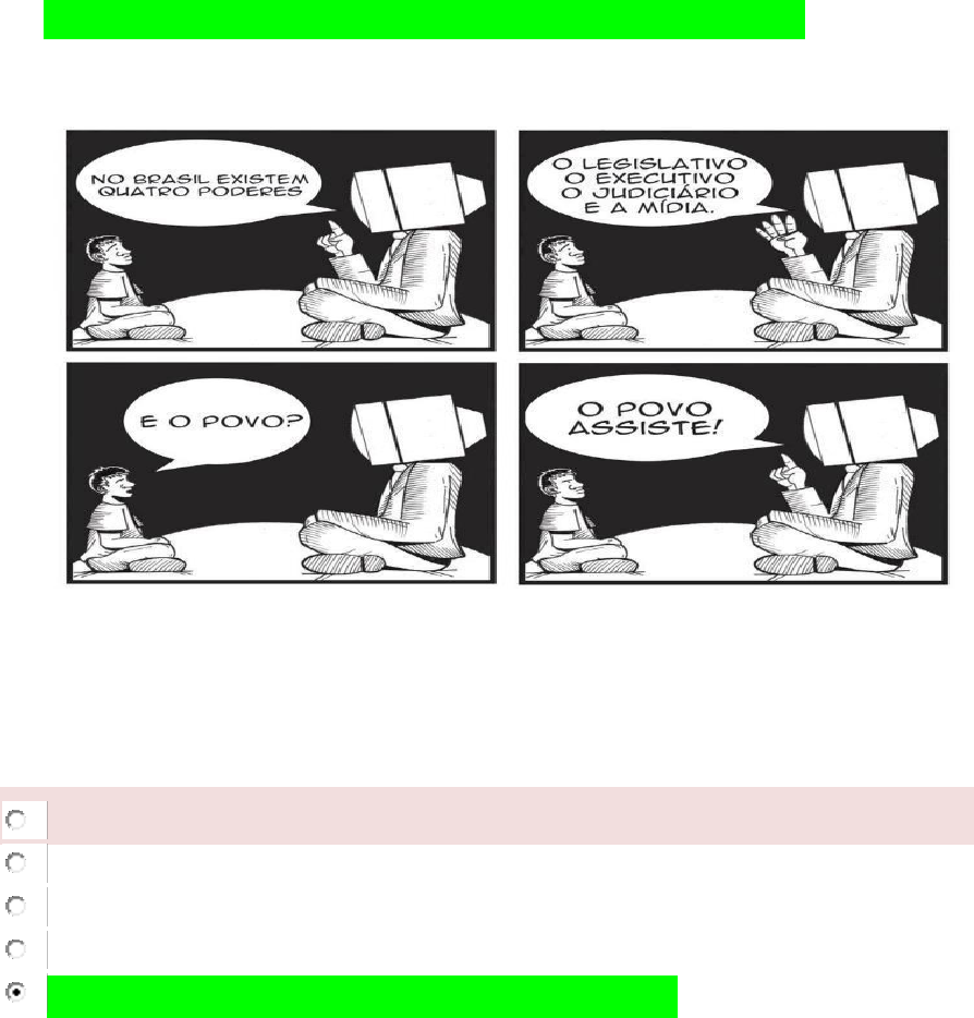 ALTERNATIVAS CORRETAS ESTÃO MARCADAS DE VERDE 1- Tendo em vista o poder que a mídia possuí e a influência que exerce na sociedade, podemos afirmar que a charge expressa: Escolha uma: a. A influência social que a mídia exerce sobre a sociedade b. A influência moral que a mídia exerce sobre a sociedade c. A influência cultural que a mídia exerce sobre a sociedade d. A influência psicológica que a mídia exerce sobre a sociedade e. A influência política que a mídia exerce sobre a sociedade 2 - I – O consumo é uma atividade principalmente associada ao atendimento das necessidades básicas do ser humano; estimulado pela propaganda e publicidade, elas incentivam o consumo de determinado produto em função de sua necessidade elementar. II – As peças publicitárias não se limitam em discorrer sobre a utilidade ou funcionalidade de um determinado produto, porque o principal é afetar a consciência do cliente com a ideia de que há no produto algo além de seu mero valor de uso, algo imaginário, da ordem da realização do desejo. Ao relacionar a imagem às assertivas I e II é correto afirmar que: Escolha uma: a. Somente a assertiva I está correta, porque a imagem contradiz o argumento da assertiva II. b. As assertivas I e II estão corretas, e a imagem é ilustrativa da assertiva II. c. As assertivas I e II estão corretas, e a imagem é ilustrativa da assertiva I. d. Somente a assertiva II está correta, porque a imagem contradiz o argumento da assertiva I. e. A assertiva I está correta e a imagem é ilustrativa do argumento da assertiva II. 3 - O Fordismo é uma forma de organização da produção industrial que revolucionou o trabalho fabril no início do século XX. Ele se baseia em três princípios: Intensificação: redução do tempo que se levava para produzir um produto e fazer com que ele chegasse rapidamente ao mercado. Economicidade: tinha como meta fazer com que as empresas reduzissem ao mínimo seus estoques. Produtividade: a especialização do trabalhador faz com que ele se torne mais produtivo. Ford visava atingir o mercado de massa. Os automóveis eram à época exclusividade das classes mais abastadas. O Ford T, primeiro automóvel a ser fabricado pelo novo sistema, conseguiu ter seu custo diminuído. Ao reduzir o custo através da padronização do produto, os próprios operários se tornaram parte do mercado consumidor e os carros passaram a fazer parte da realidade das classes trabalhadoras. Leia as afirmativas abaixo e identifique quais assertivas correspondem ao fordismo I – É um modelo de gestão do trabalho propício a criar sistemas de alta confiança, no qual os trabalhadores podem participar do processo decisório fazendo sugestões. II – É um modelo que consolidou e intensificou o processo produtivo se utilizando da linha de montagem para interligar e otimizar as etapas de produção. III – Estimulou a produção para atender o consumo em larga escala, ou seja, além de produzir era necessário estimular e facilitar o consumo, o que dinamizava o ciclo econômico. É correto afirmar que Escolha uma: a. II é verdadeira e I e III são falsas b. II e III são verdadeiras e I é falsa. c. I e III são verdadeiras e II é falsa. d. I e II são verdadeiras e III é falsa. e. III é verdadeira e I e II são falsas. 4- Considerando a imagem acima, avalie as assertivas a seguir: I – Em um planeta com recursos naturais finitos, limitados, não-renováveis o consumismo da sociedade contemporânea nos conduzirá a uma realidade socioeconômica insustentável e desastrosa para a humanidade e para o meio-ambiente. II – Em sociedades capitalistas, individualistas, competitivas, que giram em torno do dinheiro e da ostentação de classe e onde as pessoas são identificadas e valorizadas pelos bens materiais que possuem, as desigualdades se tornam evidentes pelo consumo. O consumismo se traduz no imaginário da posse, do poder e da riqueza. Relacione a imagem às assertivas I e II e responda. Escolha uma: a. As assertivas I e II são verdadeiras, e a II é uma contestação da I. b. Somente a assertiva I é verdadeira, porque a II é uma explicação da I. c. As assertivas I e II são verdadeiras, e a I é a causa da II. d. Somente a assertiva II é verdadeira, porque a I é uma constatação da II. e. As assertivas I e II são verdadeiras, e a I é uma consequência da II. 5 - Em um mundo globalizado a economia altamente competitiva, nessa realidade complexa requer mais qualificação, mais flexibilidade, mais competências, além de comportamento empreendedor e disposto a enfrentar desafios. Nesse contexto a base que sustenta a inovação e o crescimento econômico são as ideias, informações e as várias formas de conhecimento. Considerando o texto e a imagem acima é correto afirmar que: Escolha uma: a. A implementação do modelo de linha de montagem fordista para otimizar a produção, o estoque e a circulação de mercadorias. b. A valorização do trabalho mecânico, da linha de produção, pois todos devem ser aptos a realizar as operações necessárias do setor. c. A adoção gradativa de tecnologias mecanizadas vai substituindo os postos de trabalhos automatizados. d. O trabalhador deve ser especializado em uma função dentro do modelo imposto de divisão técnica do trabalho. e. A mudança para uma economia pós-industrial acompanhada do crescimento do setor de serviços e de tecnologia. 6 - Considere as afirmativas I, II, III e IV abaixo: I – O sociólogo brasileiro Octávio Ianni afirma que o fenômeno globalização é uma realidade ainda pouco conhecida, desafiando práticas e ideais, situações consolidadas e interpretações sedimentadas, formas de pensamento e voos da imaginação. Sobre a Globalização e as afirmativas acerca dos estudos do fenômeno, podemos inferir que: II – A globalização, a transnacionalização e a mundialização nos campos social, econômico e cultural estão dentre os temas mais debatid