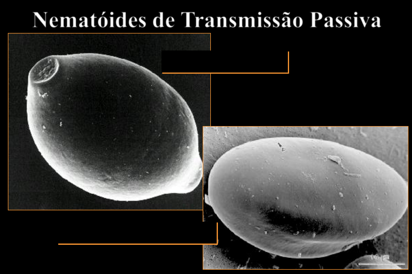 Nematóides de Transmissão Passiva Prof. Rodrigo Guerra Trichuris trichiura Enterobius vermicularis Trichuris trichiura Considerações Gerais: - Também conhecido como Trichocephalus trichiura, Trichuris trichiurus ou “whipworms”. - Causador da tricuríase, tricurose ou tricocefalose. - Homem é o principal hospedeiro (Já observou-se infectando em porcos e primatas). - População infantil é a mais afetada. De um total de 1.049.000.000 de portadores, crianças na idade pré-escolar e escolar somam 114 milhões (Crompton, 1999). Posição Sistemática: Filo: Nemathelminthes Classe: Nematoda Superfamília: Trichuroidea Família: Trichuridae Gênero: Trichuris Trichuris trichiura - Morfologia - Até 3 cm e testículo único, - extremidade posterior recurvada ventralmente, - espículo protegido por bainha - Até 5 cm, - Extremidade posterior romba e reta - Vagina, ovário e útero únicos MachoFêmea Parte posterior Parte anterior Morfologia dos vermes adultos Morfologia dos ovos - 50 m de comprimento; - Formato de barril característico; - São resistentes no meio ambiente; - Presença de tampão albuminoso ou pólos germinativos. Diagnóstico parasitológico CICLO BIOLÓGICO Atenção: parasito não realiza ciclo de Loss Habitat e comportamento Extremidade anterior mergulhada na mucosa do ceco. Longevidade: 6 a 8 anos (idade média: 3 anos) Patogenia e Sintomatologia - Carga parasitária: 2 a 10 helmintos (Podendo chegar de 100 a 1000); - Grande maioria dos portadores é assintomático; - Quadro clínico indefinido: insônia, perda de apetite, eosinofilia sangüínea, podendo apresentar dor abdominal, flatulência e constipação intestinal; - Alta carga parasitária: - Anemia: sangramento da mucosa intestinal - processo inflamatório local. - Prolapso retal * Alimentos ou água contaminada com ovos (Via Fecal-Oral). Mecanismos de Transmissão * População infantil é a mais afetada, devido aos pobres hábitos higiênicos. * Vetores mecânicos: Vento, chuva, poeira e insetos. Relatos de Trichuris trichiura geralmente está associada à infecções múltiplas com Ascaris lumbricoides Diagnóstico Laboratorial Exame de fezes e encontro de ovos característicos. Métodos: Sedimentação espontânea (Lutz ou HPJ) ou Kato-Katz Considerações Gerais: - Também conhecido como Oxiúros (Anteriormente denominada Oxyuris vermicularis). - Causador da enterobíase. - Distribuição geográfica mundial - Maior incidência em países de clima temperado. - População infantil é a mais afetada. Posição Sistemática: Filo: Nemathelminthes Classe: Nematoda Família: Oxyuridae Gênero: Enterobius Enterobius vermicularis Morfologia dos vermes adultos Machos: 5mm de comprimento. - cauda curvada ventralmente com um espículo. Fêmeas: 1cm de comprimento. - cauda pontiaguda e longa. Ambos os sexos: - Expansões típicas - Asas Cefálicas - Esôfago claviforme Morfologia dos ovos • 50 m de comprimento • possuem membrana tripla • têm formato grosseiro de um “D” • são transparentes e muito leves MEV Habitat e comportamento • Ceco e apêndice. • Vivem aderidos à mucosa ou livres na cavidade intestinal. • Fêmeas acumulam de 5.000 a 16.000 ovos no útero. • Durante a noite, migram do ceco para o reto. • Os machos morrem após a cópula. • As fêmeas no períneo, morrem, ressecam e rompem liberando ovos. ovoovos CICLO BIOLÓGICO Atenção: parasito não realiza ciclo de Loss Mecanismos de Transmissão • Heteroinfecção (Primoinfecção) - ovos presentes na poeira ou alimentos atingem novo hospedeiro. • Indireta - ovos presentes na poeira ou alimentos atingem o próprio hospedeiro que os eliminou. • Auto-infecção externa ou direta - criança ou adulto (mais raro) levam os ovos da região perianal à boca (*mecanismo responsável pela cronicidade da doença). • Auto-infecção interna - Processo raro no qual as larvas eclodem dentro do reto, migram até o ceco e transformam-se em helmintos adultos. • Retroinfecção - larvas eclodem na região perianal (externa), penetram pelo ânus e migram pelo intestino grosso até o ceco, transformando-se em helmintos adultos. Patologia e Sintomatologia • Maioria dos casos são assintomáticos. • A alteração mais freqüente é o prurido anal. • Infecção bacteriana secundária. • Há perturbações do sono. • Carga parasitária elevada: fezes moles ou diarreicas, perturbações do apetite emagrecimento Clínico: prurido anal noturno. Laboratorial: método da fita gomada (Graham). Diagnóstico Epidemiologia Alta prevalência em crianças. Transmissão doméstica ou em ambientes fechados (creches, asilos). • Não sacudir a roupa de cama e de dormir e lavar em água fervente; • Tratar todas as pessoas parasitadas e repetir o medicamento 2 ou 3 vezes, com intervalo de 20 dias; • banhos matinais diários; • evitar superlotação de dormitórios; • remoção do pó por meio de aspiradores e uso de desinfetantes; • educação sanitária. Medidas Profiláticas