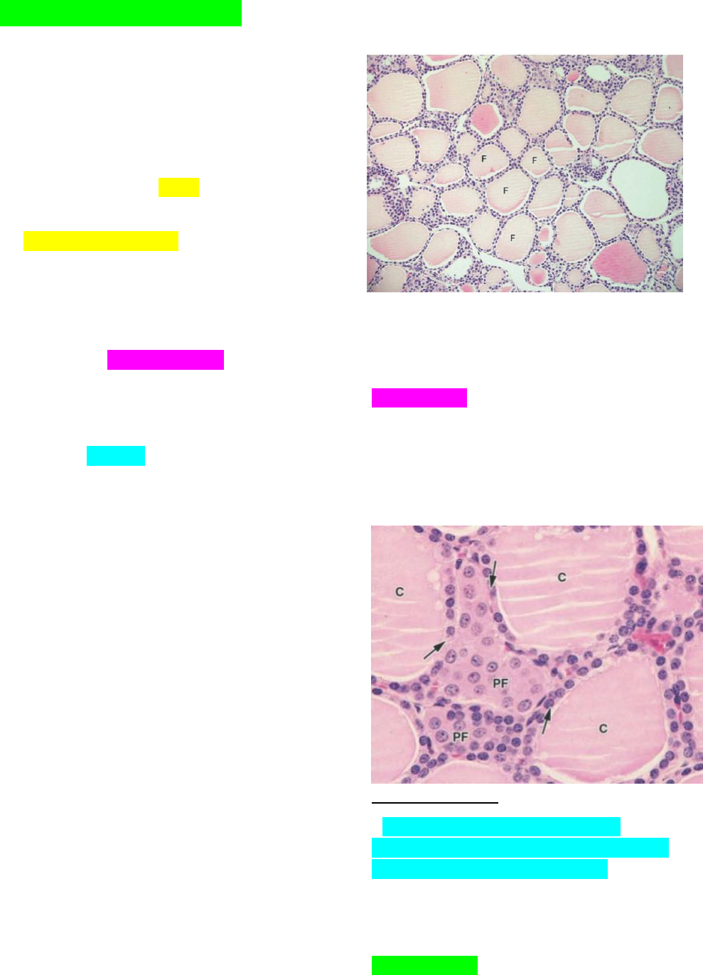 GLÂNDULA TIREÓIDE (HISTOLOGIA) A tireóide é uma glândula endócrina cuja função é secretar T3 (+ potente) e T4 que regulam a taxa de metabolismo do corpo. Situa-se na região cervical anterior anterior à laringe e é composta por dois lobos unidos por um istmo COMPOSIÇÃO: É composta por milhares de folículos tireoidianos, Células C (ou parafolicular) Os folículos tireoidianos: - São esferas pequenas - Paredes de epitélio simples que varia de cúbico ou pavimentoso a colunar, dependendo do nível de atividade funcional. - Células : tirócitos - Possuem dentro deles: coloide - Separados entre si por fibras reticulares Ps: Alguns folículos são grandes, cheios de coloide e com células pavimentosas ou cúbicas (indica glândula hipoativa) e outros podem ser menores e com epitélio colunar (indica glândula hiperativa). Ps: A relação de hiper ou hipoatividade depende de qual tipo de folículo é predominante na glândula. As células C (parafoliculares): - podem fazer parte do folículo - Normalmente se agrupam entre os folículos - Produzem o hormônio calcitonina (tirocalcitonina) (diminui o cálcio no sangue) (inibe a reabs. de tec. Ósseo no sangue) (PF= parafoliculares) _________________________________ VASCULARIZAÇÃO: É intensa e os capilares sanguíneos e linfáticos envolvem os folículos. As células endoteliais dos capilares sanguíneos são frenestradas para que haja um melhor transporte de substâncias entre as células endócrinas e o sangue. SÍNTESE E ARMAZENAMENTO DE HORMÔNIOS NAS CELULAS FOLICULARES: - Tireóide é a única glândula que armazena seu produto de secreção em grande quantidade (no coloide) - O coloide, responsável pelo armazenamento de T3 e T4, é composto por uma glicoproteína chamada tireoglobulina. - A síntese e o acúmulo de horm. Tireoidianos ocorrem em 4 etapas: 1º) Síntese de tireoglobulina – As proteínas são prod no R.E.R e dps o carboidrato é adicionado a ela no C.G. Dps, essa molécula será transportada em uma vesícula, até que libere seu conteúdo no lúmen do folículo 2º) Captação do iodeto circulante – Realizada pela proteína cotransportadora de sódio/iodo que fica na membrana basolateral das células foliculares. Essa proteína irá transportar um íon iodeto para dentro da célula ao mesmo tempo em que joga um íon sódio para fora da célula. Isso possibilita uma maior concentração de iodo na tireóide em relação ao plasma. 3º) Oxidação do iodeto intracelular – O iodeto é oxidado por H2O2. Em seguida, o iodo é transportado para o folículo por um transportador de ânions (pendrina). 4º) Iodação das moléculas de tirosina (da tiroglobulina) – Ocorre no interior do colóide Deste modo, são produzidos T3 e T4 que fazem parte das moléculas de tireoglobulina. LIBERAÇÃO DE T3 E T4 E SUAS AÇÕES NO ORGANISMO: - Captação do colóide por células foliculares por endocitose. - Digestão do colóide por enzimas lisossômicas - As partes relacionadas às porções iodinadas bem como o restante da molécula de tireoglobulina são quebradas por proteases - Liberação de T3 (+ potente), T4 (maior qnt), di-iodotirosina e monoiodotirosina são liberados no citoplasma - T4 e T3 cruzam a membrana basolateral da célula e difundem-se até os capilares sanguíneos. - MIT e DIT não são secretados e perdem seu iodo enzimaticamente gerando iodo e tirosina que serão reciclados pelas células foliculares. PS: Os hormônios tireoidianos: -Estimulam a síntese protéica - Estimulam o consumo de O2 no organismo. - Aumentam a qnt de mitocôndrias e de oxidação fosforilativa, - Aumentam a absorção de carboidratos no intestino e regulam o metabolismo de lipídeos. - Influenciam o crescimento corporal e o des. do sistema nervoso durante a vida FETAL CONTROLE NA PRODUÇÃO DE HORMÔNIOS TIREÓIDIANOS - Teor de iodo no organismo - Hormônio tireotrópico (TSH) (adenohipófise) PS: O TSH estimula a ação da tireóide por estimular a captação de iodeto circulantes HIPER E HIPOTIREÓIDISMO Quando há carência de iodo, há diminuição na síntese de T3 e T4, o que estimila a secreção de TSH que causa hipertrofia da tireóide (bócio) Hipotireóidismo – pode ser causado por problemas na tireóide ou deficiências na hipófise ou hipotálamo. Ex: doença de Hashimoto (doença autoimune da tireóide) e Cretinismo (em recém nascidos,decorrente de def. tireoidiana. Leva à retardamento mental e mal desenvolvimento físico) Hipertireóidismo – Muito raramente pode ser consequência de tumores da hipófise. Mais comumente é resultado de doença tireoidianas. Ex: doença de Graves.