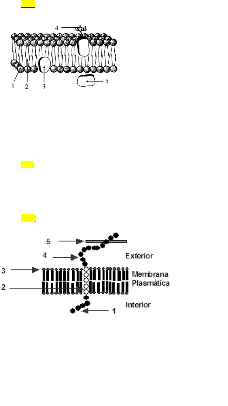 UFES - O modelo abaixo representa a configuração molecular da membrana celular, segundo Singer e Nicholson. Acerca do modelo proposto, assinale a alternativa incorreta. a) O algarismo 1 assinala a extremidade polar (hidrófila) das moléculas lipídicas. b) O algarismo 2 assinala a extremidade apolar (hidrófoba) das moléculas lipídicas. c) O algarismo 3 assinala uma molécula de proteína. d) O algarismo 4 assinala uma molécula de proteína que faz parte do glicocálix. São os glicídios e) O algarismo 5 assinala uma proteína extrínseca à estrutura da membrana. (proteína periférica) UMC - A membrana plasmática, apesar de invisível ao microscópio óptico, está presente: a) em todas as células, seja ela procariótica ou eucariótica. b) apenas nas células animais. c) apenas nas células vegetais. d) apenas nas células dos eucariontes. e) apenas nas células dos procariontes. UFPE - Considere o seguinte desenho esquemático de uma membrana plasmática. Estabeleça a correta correspondência das setas com as estruturas indicadas. ( V) Seta 4 = porção da proteína de membrana que pode atuar como receptor para hormônio. ( V ) Seta 2 = aminoácido hidrofóbico de uma proteína integrante de uma membrana plasmática. ( F ) Seta 3 = porção apolar de uma membrana plasmática. ?( f ) Seta 1 = aminoácido hidrofóbico da porção intracelular de uma proteína ( V ) Seta 5 = carboidrato ligado à porção extracelular de uma proteína de membrana. # V V F F V UFV - A célula apresenta membrana plasmática que a delimita do meio exterior. Embora essa membrana não seja visível à microscopia ótica, sabe-se que a sua estrutura é complexa. A figura a seguir representa o padrão básico de organização dessa membrana. a) Cite a natureza química dos componentes indicados pelos números: I.___________________ # Proteína II. __________________ # Bicamada lipídica III. __________________ # Glicocálix b) Cite uma função fisiológica desempenhada pela membrana plasmática que não tenha gasto de energia: # Osmose, difusão facilitada. c) O glicocálix está indicado pelo número: # O glicocálix está indicado pelo número III. PUCPR- No início da década de 70, dois cientistas (Singer e Nicholson) esclareceram definitivamente como é a estrutura das membranas celulares, propondo-se o modelo denominado mosaico-fluido. Neste conceito, todas as membranas presentes nas células animais e vegetais são constituídas basicamente pelos seguintes componentes: a) ácidos nucleicos e proteínas. b) ácidos nucleicos e enzimas. c) lipídios e enzimas. d) enzimas e glicídios. e) lipídios e proteínas. PUCCAMP - As características estruturais e a composição química das membranas celulares conferem-lhes permeabilidade a) seletiva. b) somente às substâncias iônicas. c) somente às substâncias moleculares. d) somente à água e a outras substâncias inorgânicas. e) a todas as substâncias. UFF - A membrana plasmática é constituída de uma bicamada de fosfolipídeos, onde estão mergulhadas moléculas de proteínas globulares. As proteínas aí encontradas: a) estão dispostas externamente, formando uma capa que delimita o volume celular e mantém a diferença de composição molecular entre os meios intra e extracelular. b) apresentam disposição fixa, o que possibilita sua ação no transporte de íons e moléculas através da membrana. c) têm movimentação livre no plano da membrana, o que permite atuarem como receptores de sinais. d) dispõem-se na região mais interna, sendo responsáveis pela maior permeabilidade da membrana a moléculas hidrofóbicas. e) localizam-se entre as duas camadas de fosfolipídeos, funcionando como um citoesqueleto, que determina a morfologia celular. UNIOESTE - O modelo a seguir representa a estrutura molecular da membrana plasmática, segundo Singer e Nicholson (1972). Observando-o, leia as afirmativas propostas e assinale a(s) correta(s): F(01) O número 1 indica a parte hidrofóbica dos fosfolipídios que controlam o transporte pela membrana. F(02) O número 2 indica as proteínas que formam barreiras para substâncias hidrossolúveis. F(04) O número 3 indica uma proteína periférica que facilita a passagem de íons pela membrana. V(08) O número 4 indica uma molécula de glicídio que faz parte do glicocálix. F(16) O número 5 indica uma proteína transmembrana que dificulta a passagem de gases pela membrana. V(32) Os números 1 e 2 indicam regiões hidrofílica e hidrofóbica de lipídios, respectivamente. # F F F V F V MACKENZIE - Assinale a afirmativa correta a respeito da estrutura representada no esquema acima. a) É observada somente como envoltório externo em qualquer tipo de célula. b) Quando uma célula se encontra em equilíbrio osmótico com o meio externo, as substâncias param de atravessar essa estrutura. c) Proteínas presentes nessa estrutura podem estar envolvidas no transporte de compostos como glicose, processo conhecido como difusão facilitada. d) O transporte ativo envolve gasto de energia para bloquear a ação das proteínas constituintes dessa estrutura. -e) O processo de osmose ocorre quando moléculas de água atravessam essa estrutura em direção a um meio hipotônico. Estaria certa se fosse nos dois sentidos COVEST - Assinale a alternativa incorreta. a) A difusão simples é um tipo de transporte passivo através da membrana plasmática que ocorre quando existem condições de gradiente de concentração sem haver “gasto” de energia. b) A difusão facilitada utiliza proteínas carreadoras para o transporte de açúcares simples e aminoácidos através da membrana constituindo, por essa razão, um processo de transporte ativo. c) A membrana plasmática é formada por uma camada bimolecular de fosfolipídios onde estão dispersas moléculas de proteínas globulares, dispostas em mosaico. d) Qualquer processo de captura por meio do envolvimento de partículas é chamado endocitose. e) Na fagocitose a c