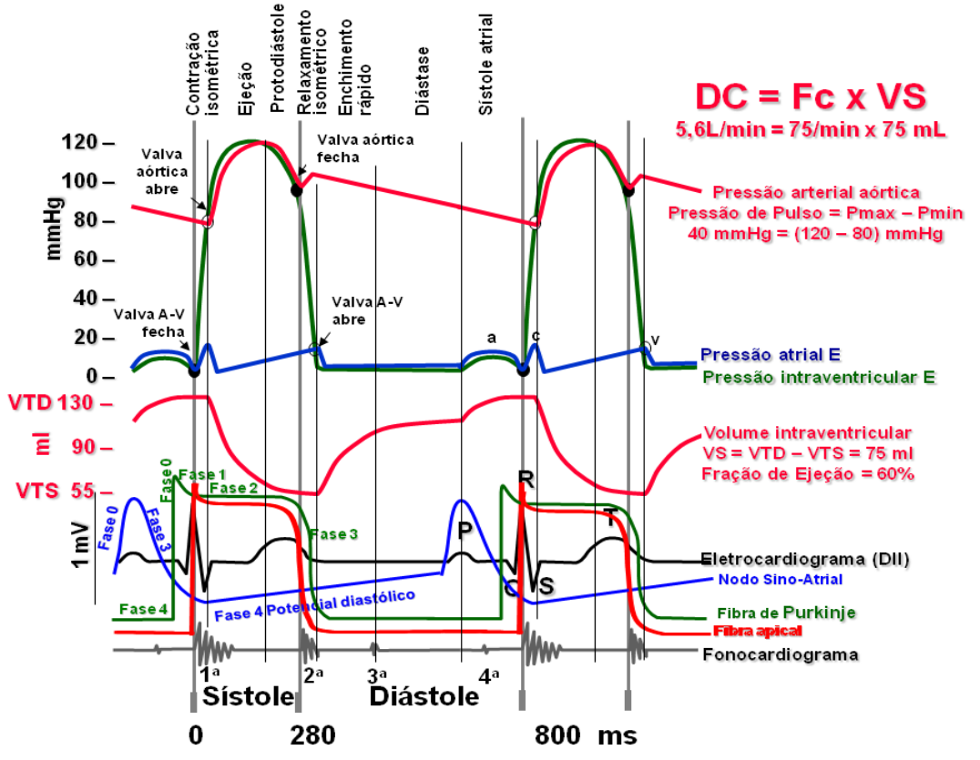 CICLO CARDÍACO Prof. Poty Ribeiro Tubino Potencial de Ação de repouso: concentração de íons Potássio (K+) elevado no meio intracelular com polaridade negativa. Já a concentração de íons Sódio (Na+) está elevado no meio extracelular e polaridade positiva na célula, conforme demonstrado na figura à esquerda. Despolarização ==> ocorre a inversão da polaridade na membrana celular com elevação de íons + no interior da célula. Repolarização ==> É o retorno do estado de repouso da célula, ou seja, o meio intra-celular fica mais negativo que o meio extra-celular. Porém, existe uma diferença do potencial de ação para o coração, o qual apresenta dois tipos de potenciais de ação: Fibra Nodal e Fibra de Trabalho. A Fibra de Trabalho apresenta o seguinte aspecto: Fase 0 (zero) – despolarização rápida -> entrada rápida de Na+. Fase 1 – Despolarização precoce – Inativação da entrada de Na+ Fase 2 (platô) – mantida pela entrada lenta de Ca2+ Fase 3 (repolarização final) – saída de K+ Fase 4 (potencial de repouso) – Saída de Na+ e entrada de K+ ==> bomba de Na+/K+ A Fibra Nodal apresenta o seguinte aspecto do potencial de ação: Fase 0 (zero) – Influxo lento de Na+ Fase 3 – efluxo lento de K+ Fase 4 – ação da bomba de Na+/K+. Não existe as fases 1 e 2 Sistema de Condução: O coração é um órgão elétrico, funcionando a base de estímulos elétricos, o qual estes percorrem um esqueleto elétrico do coração é constituído por: nodo sinusal (marcapasso fisiológico), Nodo Átrio-Ventricular (AV), Feixe de His (ramos Direito e esquerdo), Fibras de Purkinje. Ciclo Cardíaco: Eventos que ocorrem entre dois batimentos cardíacos consecutivos. Sendo Sístole ==> Contração e Diástole ==> Relaxamento. Ocorrem Eventos Elétricos, Mecânicos e Hemodinâmicos. Fases do Ciclo Cardíaco: Sístole Atrial Sístole Ventricular ==> Contração isovolumétrica, Ejeção Rápida e Ejeção Lenta Diástole Ventricular ==> Relaxamento isovolumétrico, Enchimento rápido e Enchimento lento Ao lado, temos um esquema demonstrando o ciclo cardíaco em relação as pressões, volumes, as ondas e os sons. Sístole Atrial Coração: 75% do sangue flui diretamente enchendo os ventrículos; e os 25% restantes flui com a sístole atrial Pressões e Volumes: pressão atrial elevada; Sons -> Ausente (pode estar presente a 4ª bulha: entrada de sg para os ventrículos durante a sístole atrial) (Figura ao lado) Sistole Ventricular ==> Contração Isovolumétrica Coração: Fechamento das válvulas AV; Contração ventricular (sem mudança no volume); Pressões e volumes: Pressão ventricular elevada; Manutenção dos volumes ventriculares; ECG: Complexo QRS; Sons: 1ª bulha (Fechamento das valvas AV) Ejeção Rápida: Coração: pressão ventricular > pressão artérias Aorta e pulmonar, abertura valvas semilunares e escoamento rápido de sague (70%); Pressões e volumes: Altas pressões ventriculares e arteriais; Diminuição rápida do vol. ventricular ECG e sons: ausente Ejeção Lenta: Coração: Término do escoamento (30% sangue) e sístole ventricular Pressões e volumes: Diminuição lenta do vol. ventricular, diminuição das pressões ventriculares e arteriais ECG: Onda T (repolarização ventricular) Sons: Ausente Diástole Ventricular ==> Relaxamento isovolumétrico Coração: Fechamento das valvas semilunares, relaxamento ventricular Pressões e volumes: Aumento gradual das pressões atriais, diminuição elevada das pressões ventriculares, Vol. ventricular mínimo ECG: ausente; Sons: 2ª bulha (Fechamento das valvas semilunares) Enchimento Ventricular Rápido Coração: Abertura Valvas AV, Escoamento rápido para os ventrículos Pressões e volumes: Aumento rápido Vol. Ventricular ECG: ausente; Sons: 3ª bulha Enchimento Ventricular Lento Coração: Cotinuação do enchimento ventricular Pressões e volumes: Aumento leve vol. ventricular Sons e ECG: Ausente Lei de Frank-Starling:“O trabalho executado pelo coração a cada batimento é proporcional ao grau de enchimento das câmaras precedente” (Ernest Starling, 1914). Assim: Maior Débito Cardíaco ==> Maior distênsão dos sarcômeros ==> Maior volume diastólico ==> gerando uma maior força de contração. Porém, esta força de contração aumenta até um certo limite. Visualizamos na figura ao lado o comprimento do sarcômero em relação ao % da força máxima, o qual a partir de um certo ponto este começa a perder a sua força, como é o caso da Insuficiência Cardíaca Volumes: Volume Diastólico Final (VDF) ou Pré Carga: Vol. sangue contido no ventrículo imediatamente antes da sístole ventricular (130 ml) Volume sistólico Final ou Residual: Vol. Sangue contido no ventrículo final da sístole ventricular (50 ml) Fração de Ejeção: Fração do VDF que é ejetado num batimento cardíaco (50% a 60%) Pós-carga: Valor da pressão arterial que deve ser vencido pela sístole ventricular (VD >10; VE> 80 mmHg) Débito Cardíaco: Frequência Cardíaca (FC): Número de sistoles cardíacas por minuto (80 bpm) Volume sistólico (VS) ou de ejeção: Volume de sangue que o ventrículo ejeta na corrente sanguínea a cada sístole (70 ml) Débito Cardíaco (DC): vol. sangue bombeado pelos ventrículos por minuto (5 a 6l/min) ==> DC = VS X FC Pressão Arterial (PA)= DC X RVP (resistência vascular periférica) Onde DC = VS X FC Desempenho Cardíaco: Inotropismo: A força de contração é proporcional ao Ca2+ no citoplasma. Cronotropismo: relacionado com a contratilidade, dependendo do sistema nervoso autônomo e mecanismo de Frank-Starling Pré-Carga: pressão gerada na cavidade ao término da diástole Pós-carga: resistência a ser vencida, constituída pela pressão Aórtica no final da diástole e durante a sístole (PA)