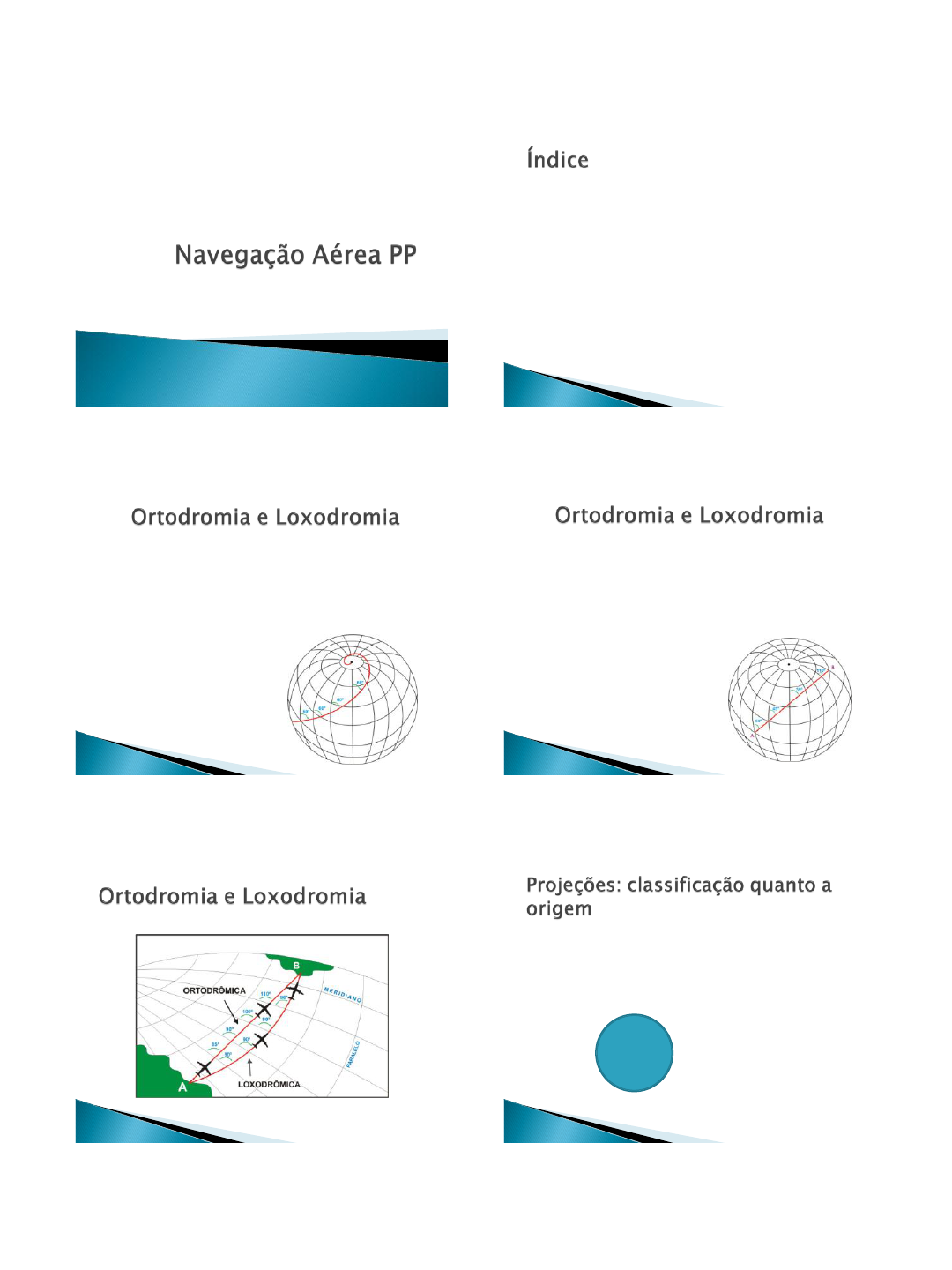 05/09/2013 1 Tipos de rotas: Ortodromia e Loxodromia Projeções Cartas: Mercator e Lambert Lembretes ROTA LOXODROMICA Corta os meridianos em ângulos iguais; Fácil planejamento; Coincide com a ortodromica em dois casos; voando sobre o equador ou voando sobre o meridiano. ROTA ORTODROMICA Corta os meridianos em ângulos diferentes; É um segmento de circulo máximo; É a menor distancia entre dois pontos; Difícil planejamento; não e utilizada pela aviação de pequeno porte. Gnomônica : centro da esfera. Esterográfica: Ponto oposto ao ponto de tangência (ao redor, na tangência). Ortográfica: infinito. G E O 05/09/2013 2 PARALELOS NÃO EQUIDISTANTES MERIDIANOS EQUIDISTANTES ESCALA VARIÁVEL COM A LATITUDE MEDIDA DE DISTÂNCIA LATITUDE MÉDIA DE DOIS PONTOS DIREÇÃO DA ROTA QUALQUER MERIDIANO QUE CRUZE A ROTA VANTAGEM FÁCIL CONSTRUÇÃO DESVANTAGEM ESCALA VARIÁVEL COM LATITUDE PARALELOS CÍRCULOS CONCENTRICOS AO PÓLO MERIDIANOS LINHAS RETAS CONVERGENTES ESCALA QUASE CONSTANTE MEDIDA DE DISTÂNCIA QUALQUER MERIDIANO DIREÇÃO DA ROTA MERIDIANO MÉDIO DA RETA ENTRE DOIS PONTOS VANTAGEM ÁREAS E FORMAS QUASE PERFEITAS DESVANTAGEM LOXODRÔMICA SER LINHA CURVA (EXETO MERIDIANOS) L O L O ROTA (loxodromica / ortodrômica) L L M M CARTA (Lambert / Mercartor ) C R R C Curva/ Reta ( I I ) Curva / Reta Rota Loxodrômica: cruzam os meridianos em ângulos iguais. Rota Ortodrômica: cruzam os meridianos em ângulos diferentes, é um circulo máximo e é a menor distância entre dois pontos. Mercartor: • É um cilindro • Paralelos não eqüidistantes (aumentam com a latitude) • Meridianos eqüidistantes Lambert: • É um cone • Paralelos:círculos concêntricos aos pólos • Meridianos não equidistantes (aumentam com a longitude) – linhas retas convergentes para os pólos • Mais perfeita nas áreas projetadas. 05/09/2013 3 1. Em uma projeção Lambert, uma rota loxodrômica é representada por um (a): a. Linha reta b. Linha curva c. Circulo menor d. Circulo máximo 2. A rota que corta todos os meridianos em ângulos iguais é chamada: a. Loxodrômica b. Ortodrômica c. Magnética d. Mercartor 1. Em uma projeção Lambert, uma rota loxodrômica é representada por um (a): a. Linha reta b. Linha curva c. Circulo menor d. Circulo máximo 2. A rota que corta todos os meridianos em ângulos iguais é chamada: a. Loxodrômica b. Ortodrômica c. Magnética d. Mercartor 3. Em uma projeção estereográfica, as linhas de projeção tem origem no: a. Infinito b. Centro da Terra c. Ponto de tangência d. Ponto oposto ao ponto de tangência 4. A projeção que tem como caracteristica a perfeição nas áreas projetadas, chama-se: a. Lambert b. Mercartor c. Ortodrômica d. Loxodrômica 3. Em uma projeção estereográfica, as linhas de projeção tem origem no: a. Infinito b. Centro da Terra c. Ponto de tangência d. Ponto oposto ao ponto de tangência 4. A projeção que tem como caracteristica a perfeição nas áreas projetadas, chama-se: a. Lambert b. Mercartor c. Ortodrômica d. Loxodrômica