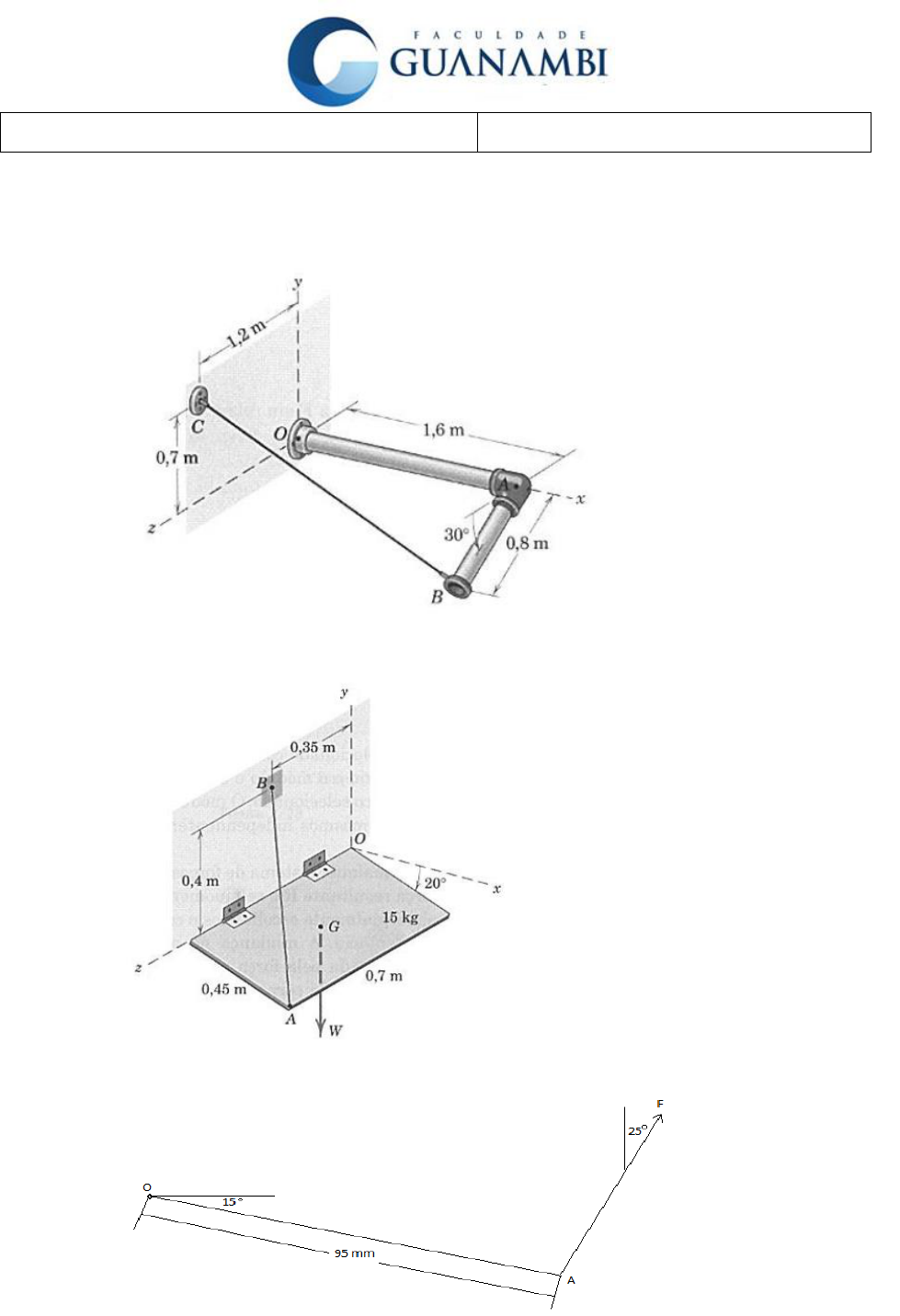 Lista de Exercícios – Sistemas equivalentes 1- O tubo em ângulo reto OAB é sustentado por um cabo, onde a tração é de 750N. Substitua a tração por um sistema equivalente no ponto O (força, momento). 2- Sabendo que a tração no cabo AB vale 143,4N. Determine o momento dessa força de tração no cabo em relação ao eixo z. Compare seu resultado ao momento do peso W da placa uniforme de 15Kg em relação ao eixo z. 3- A força F de intensidade 150N, é aplicada no ponto A. Determine o momento desta força em relação ao ponto O. Mecânica dos Sólidos I Eng˚ Prof: Tácio Eduardo Silva Ramos 4- A figura mostra a ação de 3 forças sobre uma estrutura. Determine a intensidade da resultante das forças, e o momento resultante em relação a O. 5- Uma força P de 4 KN é aplicada no fim de uma lança de um guindaste, de comprimento 20m. Se 𝛩= 60˚, determine a distância x do ponto A para que o momento em relação ao ponto O seja máximo. Determine o momento máximo. 6- Determine a intensidade do momento da Força Fc em relação ao eixo aa da porta. 7- A tubulação sofre a ação de duas forças, determine o momento em relação ao ponto O, e o momento na direção x. 8- Um pequeno barco pende de dois suportes, um dos quais é mostrado na figura. Sabendo que o momento em relação ao eixo y, causado pela resultante das forças aplicada em A, do suporte não deve exceder o valor de 217 N.m, em valor absoluto. Determine o maior valor possível da força de tração no cabo ABAD quando x= 1,46m. 9- Os braços AB e CD de uma luminária estão em um plano vertical que forma um ângulo de 30 graus com o plano xy. Para reposicionar o feixe de luz, é aplicado uma força de 8N em C, como mostra a ilustração. Determine o momento da força em relação ao ponto O sabendo que AB= 45cm; BC = 32,5 cm e a linha CD é paralela ao eixo z. 10- A partir do conhecimento das forças e momentos, reduzir em um sistema equivalente no ponto A. “ Uma mente que se abre a novas ideias, não retornará ao mesmo tamanho”. Albert Einstein.