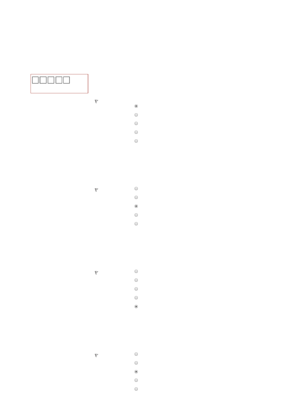 08/10/2017 Questionário Online 1/2 Página inicial ► Meus cursos ► UNIPLAN ► Licenciatura ► SU-L0045 ► Tópico 2 ► Questionário Online Questão 1 Vale 2,00 ponto(s). Marcar questão Questão 2 Vale 2,00 ponto(s). Marcar questão Questão 3 Vale 2,00 ponto(s). Marcar questão Questão 4 Vale 2,00 ponto(s). Marcar questão As etapas do projeto de pesquisa respondem às perguntas que caracterizam cada um desses momentos. Pensando assim, qual etapa responderia à pergunta: O que pesquisar? Escolha uma: a. Definição do problema, hipóteses, base teórica e conceitual b. Metodologia c. Cronograma de execução d. Justificativa da escolha do problema e. Objetivos do estudo, propósitos Durante a fase de planejamento e preparação da pesquisa costuma-se elaborar um documento. Esse documento é: Escolha uma: a. A síntese dos recursos metodológicos b. A carta de intenções c. O projeto de pesquisa d. Os instrumentos de coleta de dados e. O relatório estatístico Antes de escrever o trabalho científico é preciso que o autor obedeça algumas etapas anteriores. Qual dessas etapas deve ser a primeira? Escolha uma: a. Fazer a pesquisa de campo b. Fazer a pesquisa científica c. Pesquisar a bibliografia do tema d. Escolher uma hipótese a ser solucionada e. Escolher e delimitar um tema Na elaboração de um projeto de pesquisa não há necessidade de se considerar: Escolha uma: a. Os prazos adequados para a realização da pesquisa b. A formação do pesquisador no assunto c. Os benefícios gerados pelos resultados da pesquisa d. A existência de recursos financeiros e. Os meios para execução da pesquisa, como os instrumentos analíticos disponíveis Navegação do questionário Finalizar tentativa ... 1 2 3 4 5 08/10/2017 Questionário Online 2/2 SU-L0045 Questão 5 Vale 2,00 ponto(s). Marcar questão As etapas do projeto de pesquisa respondem às perguntas que caracterizam cada um desses momentos. Pensando assim, qual etapa responderia à pergunta: Com que recursos pesquisar? Escolha uma: a. Orçamento b. Cronograma de execução c. Objetivos do estudo, propósitos d. Metodologia e. Definição do problema, hipóteses, base teórica e conceitual