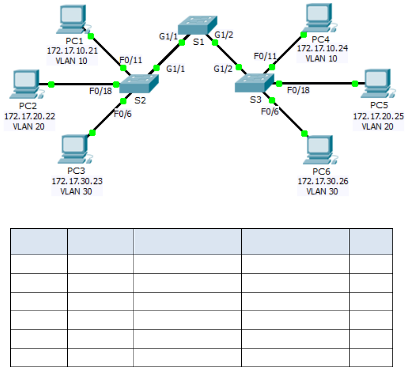 Configuração de VLANs Topologia Device Interface IP Address Subnet Mask VLAN PC1 NIC 172.17.10.21 255.255.255.0 10 PC2 NIC 172.17.20.22 255.255.255.0 20 PC3 NIC 172.17.30.23 255.255.255.0 30 PC4 NIC 172.17.10.24 255.255.255.0 10 PC5 NIC 172.17.20.25 255.255.255.0 20 PC6 NIC 172.17.30.26 255.255.255.0 30 Part 1: Objetivos Parte 1: verificar a configuração da VLAN padrão Parte 2: configurar VLANs Parte 3: atribuir VLANs para portas Part 2: As VLANs são úteis na administração de grupos lógicos, permitindo que membros de um grupo sejam facilmente movidos, alterados ou adicionados. Esta atividade concentra-se na criação e nomeação de VLANs e na atribuição de portas de acesso a VLANs específicas. Part 3: Exibir a Configuração de VLAN Padrão Etapa 1: exiba as VLAN atuais. No S1, emita o comando que exibe todas as VLAN configuradas. Por padrão, todas as interfaces são atribuídas à VLAN 1. Etapa 2: verifique a conectividade entre os PCs na mesma rede. Observe que cada PC pode fazer ping no outro PC que compartilha a mesma rede. • PC1 pode ping PC4 • PC2 pode ping PC5 • PC3 pode ping PC6 Pings para PCs em outras redes falham. Qual benefício irá configurar as VLANs para a configuração atual? _________________________________________________________________________ _______________________________________________________________________ Part 4: Configurar VLANs Etapa 1: Crie e nomeie VLANs no S1. Crie as seguintes VLANs. Os nomes diferenciam maiúsculas de minúsculas • VLAN 10: Faculdade • VLAN 20: Estudantes • VLAN 30: Convidado • VLAN 99: Gerenciamento Etapa 2: verifique a configuração da VLAN. Qual comando exibirá apenas o nome da VLAN, o status e as portas associadas em um switch? _________________________________________________________________________ Etapa 3: crie as VLANs em S2 e S3. Usando os mesmos comandos da Etapa 1, crie e nomeie as mesmas VLANs em S2 e S3. Etapa 4: verifique a configuração da VLAN. Part 5: Atribuir VLANs para portas Passo 1: atribua VLANs às portas ativas no S2. Atribua as VLAN às seguintes portas: • VLAN 10: Fast Ethernet 0/11 • VLAN 20: Fast Ethernet 0/18 • VLAN 30: Fast Ethernet 0/6 Etapa 2: atribua VLANs às portas ativas no S3. O S3 usa as mesmas atribuições da porta de acesso da VLAN como S2. Passo 3: verifique a perda de conectividade. Anteriormente, os PCs que compartilhavam a mesma rede podiam executar ping com sucesso. Tente fazer ping entre PC1 e PC4. Embora as portas de acesso sejam atribuídas às VLAN apropriadas, os pings foram bem-sucedidos? Por quê? _________________________________________________________________________ _________________________________________________________________________ O que poderia ser feito para resolver esse problema? _________________________________________________________________________