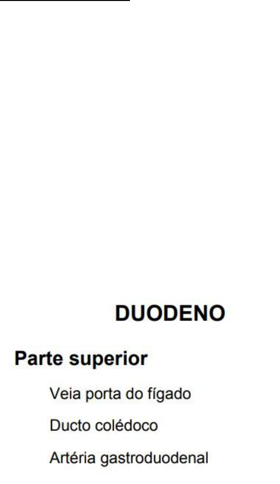 perguntas anatomia SISTEMA DIGESTÓRIO - INTESTINO DELGADO 1. Caracterize o Intestino delgado. Quais suas funções? O intestino delgado fica na cavidade abdominal, começa na junção do estômago (piloro) e termina na junção com o intestino grosso. É onde ocorre a maior parte da absorção dos alimentos. 2. Quais são as partes do intestino delgado? Dê em ordem. É formado por duodeno, jejuno e íleo 3. Quais os limites do duodeno? O duodeno começa na junção com o piloro e se estende até a junção duodeno-jejunal, que não é distinguível. É retroperitoneal. 4. Quais são as partes do duodeno? São elas: Parte superior, descendente, horizontal e ascendente. Ele tem a forma de um C ao redor da cabeça do pâncreas. 5. Caracterize a parte superior do duodeno. É logo após o piloro, e é onde fica a ampola duodenal 6. Caracterize a parte descente do duodeno. É a segunda parte. É onde a ampola hepatopancreática despeja seu conteúdo no duodeno (na papila maior/ de Vater: Ducto colédono (provem da vesicula biliar e fígado-bile-) + ducto prancreático (provém do pâncreas - suco pancreático-)) 7. Caracterize a parte ascendente do duodeno: Essa parte é onde fica o músculo suspensor do duodeno, que suspende o órgão. Também é onde ocorre a flexura duodeno-jejunal. 8. Caracteriza a parte horizontal/inferior do duodeno Curva-se para a esquerda e cruza a veia cava inferior, a aorta e o músculo psoas maior direito. 9. Como é a mucosa interna do duodeno? Possui pregas circulares 10. Como é a vascularização do duodeno? É pelas artérias pancreático-duodenais. Tronco celíaco > Hepática comum > Gastroduodenal > pancreático duodenal superior, anterior e posterior. Mesentérica Superior > Pancreático Duodenal inferior, anterior e posterior. 11. Como é a drenagem venosa do duodeno? As veias do duodeno drenam para a mesentérica e esplênica, que drenam para a veio porta. 12. Como é a disposição das camadas musculares da víscera? A camada circular é interna e a longitudinal é externa. 13. Como é a inervação do duodeno? A parte parassimpática é pelo tronco vagal e a simpática e pelo plexo celíaco 14. Qual a diferença entre a vascularização do jejuno e do íleo? Ambas são feitas por vasos mesentéricos, mas a do jejuno possui mais vasos retor do que arcos, e a do íleo possui mais arcos do que vasos retos. 15. Quais as diferenças visíveis entre jejuno e íleo? O íleo é menos corado, suas paredes são mais finas e possui mais gordura no mesentélio. 16. Qual o término do íleo? O íleo termina na junção ileocecal 16. Como é a vascularização do jejuno? E do íleo? É feita pela mesentérica superior, que emite ramos jejunais, ileais e ileocólicos. 17. Como é a inervação do jejuno e do íleo? É realizado pelo plexo mesentérico superior e pelo nervo vago. SISTEMA DIGESTÓRIO - INTESTINO GROSSO 1. Quais as funções do intestino grosso? É nele que ocorre a maior parte da absorção de água 2. Cite características que diferem o intestino grosso do intestino delgado O intestino grosso possui saculações/haustros e tênias (feixes de músculo liso), pregas semilunares, apêndices omentais/epiplóicos e possui maior calibre (é mais grosso) 3. Quais os 3 tipos de tênias existentes no colo? Tênia livre, tênia mesocólica e tênia omental 4. Quais são a partes do intestino grosso? Ceco, apêndice vermiforme, colo ascendente, colo descendente, colo transverso, colo sigmóide 5. Caracteriza as tenias do colo A tênia livre é bem visível ao longo de toda a víscera. A tenia mesocólica fica em contato com o mesocolo transverso. A tenia omental fica em contato com o omento maior. 6. Onde está localizado o Ceco? O ceco fica na fossa ilíaca da direita, após a junção ileocecal. 7. Caracterize o local onde o ceco está em contato com o íleo. O Ceco está em contato com o íleo na junção ileocecal. Lá existe a papila ileal e o frênulo do óstio ileal. 8. O que liga o ceco à parede abdominal? As pregas cecais. 9. Onde se localiza o apêndice vermiforme? O que é o apêndice vermiforme? O apêndice vermiforme se localiza na junção das tênias livres e tênia omental, bem no fundo do Ceco. Ele é um divertículo (evaginação) do tecido linfóide. Mias frequentemente está localizado na fosse ilíaca, intraperitonialmente, no recesso retrocecal. 10. Qual a posição mais comum do apêndice? É a posição ''retrocecal''. 11. Qual ligamento e vasos fazem a irrigação do apêndice vermiforme? O apêndice vermiforme possui o mesoapêndice, que é um ligamento próprio que realiza sua vascularização e drenagem. A artéria Apendicular, que é ramo da ileocólica, faz a irrigação do apêndice. 12. Como é feita a vascularização do ceco? É feita pela artéria Ileocólica. Aorta abdominal > Mesentérica superior > Ileocólica 13. Como é feita drenagem venosa do Ceco? É o oposto da vascularização Veia ileocólica > Veia mesentérica superior > Veia porta 14. Quais os limites do colo ascendente? Vai do ceco à flexura direita do colo (flexura hepática) 15. O que é o sulco paracólico? É o sulco entre a parte ascendente e a parede abdominal. É uma vertente para o escoamento de líquido, seja para a pelve, seja para o recesso hepatorrenal. 16. Quais os ramos da artéria mesentérica superior? Cólica média, cólica direita, ileocólica e pancreáticoduodenal inferior (anterior e posterior) 17. Cite os limites do colo transverso Flexura hepática (direita) e flexura esplênica (esquerda), acima dele está o mesocolo transverso. 18. Qual a vascularização do colo transverso? Artérica cólica média, ramo da mesentérica superior. 19. Qual a diferença entre o lado esquerdo e o direito do colo? A flexura do colo direito é mais baixa do que a do esquerdo devido ao fígado. 20. Quais as características do colo descendente? Ele tem início na flexura do colo esquerdo e termina onde começa a colo sigmóide . Ao seu lado está o sulco pa