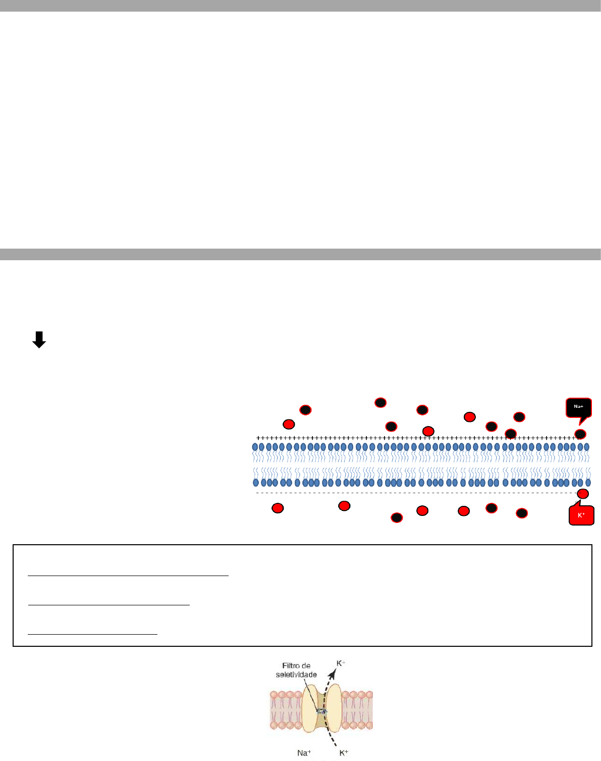 Kaique Antônio Moreno Leão de Azevedo – Medicina 3º Período RESUMO POTENCIAL DE MEMBRANA E POTENCIAL DE AÇÃO INTRODUÇÃO - A membrana plasmática de alguns tipos celulares apresenta a propriedade de excitabilidade. - Nas células ditas excitáveis, uma alteração ambiental (estímulo) pode modificar a permeabilidade iônica da membrana alterando seu potencial elétrico. - Células nervosas, musculares e glandulares são os três principais tipos de células excitáveis têm capacidade de produzir mudanças rápidas e transientes em seu potencial de membrana quando excitadas. - Potencial de membrana é a separação de cargas opostas pela membrana plasmática diferença do número relativo de cátions e ânions no LIC e LEC. - De modo geral Os potenciais de ação são dependentes da ativação de canais de Na+, que se abrem em resposta a variações no potencial de membrana: dependentes de voltagem. - Células excitáveis uma despolarização aumenta a permeabilidade da membrana ao Na+ - A permeabilidade do K+ também depende do potencial de membrana. - Em outras palavras: a condutância da membrana excitável é alterada com a voltagem. - O potencial constante quando estão em repouso é conhecido como potencial de membrana de repouso. POTENCIAL DE MEMBRANA - Todas as células possuem íons distribuídos em diferentes concentrações entre os meios intra e extracelular! - Isso gera potenciais de membranas em praticamente todas as células do corpo. - A distribuição desigual de alguns íons principais entre o LIC e LEC e seu movimento seletivo através da membrana são responsáveis pelas propriedades elétricas da membrana. - Íons primariamente responsáveis pela geração do potencial de membrana em repouso = Na+, K+ e A-. - A diferença nessa distribuição dos íons ocasiona uma diferença de potencial elétrico (DDP) entre os lados intra e extracelular. - Esta diferença pode ser medida através de um voltímetro e é chamada de potencial de membrana ou potencial de repouso (PR). Cada íon que atravessa a membrana procura impulsionar o potencial de membrana em direção ao seu potencial de equilíbrio. Os íons com as maiores permeabilidades darão a maior contribuição. - Seu valor depende do tipo de célula. O sinal negativo indica que o interior é mais negativo que o exterior da célula. Qual a razão? - Presença de ânions orgânicos no meio intracelular: esses ânions não perpassam a membrana plasmática, favorecendo para que o interior celular tenha carga negativa; - Presença do canal de vazamento do K+: porque o seu potencial de equilíbrio (Ek) é negativo, ou seja, o K+ só estará em equilíbrio em um meio carregado negativamente por seu cátion. - Presença da bomba de Na+- K+: visto que a bomba envia 3 átomos de Na+ para o meio extracelular e 2 de K+ para o meio intracelular. - Vazamento do K+ através da membrana nervosa: Canal de vazamento de K+ Kaique Antônio Moreno Leão de Azevedo – Medicina 3º Período - Bomba eletrogênica: Mais cargas + são transportadas para fora. Produz grande gradiente de concentração. - Potencial de difusão: É a diferença de potencial gerada através de uma membrana devido a uma diferença de concentração de determinado íon. - Potencial de equilíbrio: É o potencial de difusão que equilibra (se opõe) exatamente a tendência à difusão causada por uma diferença de concentração. A diferença de potencial que contrabalança exatamente a difusão do íon a favor de seu gradiente de concentração é o potencial de equilíbrio. - O valor do potencial de equilíbrio, em toda a membrana, que se opõe exatamente ao da difusão efetiva de um íon é conhecido como potencial de Nerst. Ela informa qual o potencial equilibrará exatamente a tendência à difusão a favor do gradiente de concentração. - OBS: Cada íon que atravessa a membrana procura impulsionar o potencial de membrana em direção ao seu potencial de equilíbrio. - Força impulsionadora: É a diferença entre o potencial da membrana verdadeiro e o potencial de equilíbrio. - Fluxo de corrente: Ocorre se houver uma força propulsora no íon e a membrana for permeável ao íon. A magnitude do fluxo de corrente será determinada pela grandeza da força propulsora e pela permeabilidade do íon. - Membrana polarizada: TIPOS DE CANAIS IÔNICOS - Canais abertos: Canal de vazamento de K+ - Canais controlados por comportas: Canal dependente de voltagem: podem ser abertos a partir de alterações de voltagem da membrana; Canal dependente de ligantes: abrem-se a partir de substâncias específicas, como neurotransmissores, neuromoduladores e hormônios; Canais mecânicos: sua abertura depende de uma energia mecânica, como estiramento; Canais térmicos: reagem a alteração de temperatura, realizando sua abertura. - Canais iônicos: Proteínas integrais que atravessam toda a membrana e, quando abertas, possibilitam a passagem de determinados íons. São seletivos: permitem a passagem de alguns íons, mas não de outros. A seletividade baseia-se no tamanho do canal e na distribuição das cargas que o revestem. Podem estar abertos ou fechados: controlado por comportas Kaique Antônio Moreno Leão de Azevedo – Medicina 3º Período POTENCIAL DE AÇÃO - Propriedades de células excitáveis. - É conhecido há mais de um século que o impulso nervoso é um fenômeno elétrico. - Os sinais nervosos são transmitidos por potenciais de ação que são rápidas alterações do potencial de membrana. - Cada potencial de ação começa com alteração súbita do potencial de membrana normal negativo para um positivo, terminando então com retorno quase tão rápido para o potencial negativo: Ex: -90mV - +35mV - -90mV - São sinais confiáveis de longa duração. - Experimentos iniciais demonstraram que a despolarização aumenta a permeabilidade da membrana celular ao Na+ e, mais tardiamente, ao K+. - A magnitude e o curso temporal das alterações na permeabilidad