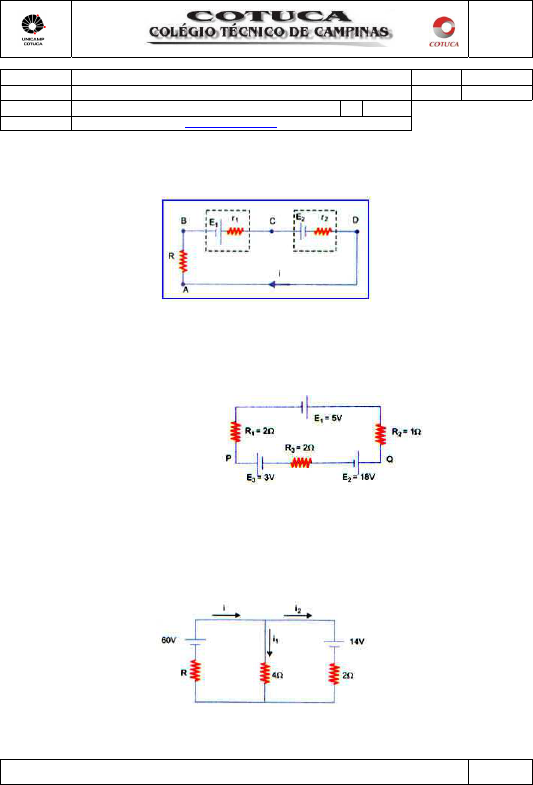 Página 1 de 3 Colégio Técnico de Campinas e da UNICAMP - COTUCA Impressão 26/5/2010 CURSO Eletroeletrônica - DATA ___ / ___ / ___ COMPONENTE Eletricidade Básica ALUNO RA: DOCENTE Prof. Romeu Corradi Júnior [www.corradi.junior.nom.br] Assunto: Exercícios – Leis de Kirchhoff – Apenas com duas malhas. 01. (UFPA) No circuito abaixo, I = 2A, R = 2Ω, E1 = 10V, r1 = 0,5Ω, E2 = 3,0V e r2 = 1,0Ω. Sabendo que o potencial no ponto A é de 4V, podemos afirmar que os potenciais, em volts, nos pontos B, C e D são, respectivamente: a) 0, 9 e 4 b) 2, 6 e 4 c) 8, 1 e 2 d) 4, 0 e 4 e) 9, 5 e 2 RESPOSTA: A 02. (UFSC) Considere o circuito da figura abaixo, onde estão associadas três resistores (R1, R2 e R3) e três baterias (E1, E2, E3) de resistência internas desprezíveis: Um voltímetro ideal colocado entre Q e P indicará: a) 11V b) 5V c) 15V d) 1V e) zero RESPOSTA: A 03. (MACKENZIE) No circuito acima, o gerador e o receptor são ideais e as correntes têm os sentidos indicados. Se a intensidade da corrente i1 é 5A, então o valor da resistência do resistor R é: a) 8Ω b) 5Ω c) 4Ω d) 6Ω e) 3Ω RESPOSTA: B 04. (CESESP-PE) No circuito a seguir, o valor em ohms da resistência R, que deve ser colocada entre os pontos A e B para que circule no resistor de 10Ω uma corrente de 0,6A,é: a) 10 b) 6 c) 15 d) 20 e) 12 RESPOSTA: C 05. Para o circuito abaixo, determine a intensidade da corrente em cada ramo. RESOLUÇÃO: 06. (FEI) No trecho do circuito dado abaixo, os valores em miliampère das correntes i3, i4, i5 são respectivamente: a) 0, 200, 100 b) 100, 100, 20 0 c) -100, 300, 0 d) 200, 0, 300 e) -200, 400, -100 Página 3 de 3 Colégio Técnico de Campinas e da UNICAMP - COTUCA Impressão 26/5/2010 RESPOSTA: B 07. (UNISA) No circuito abaixo, as intensidades das correntes i1, i2 e i3, em ampères, valem, respectivamente: a) 1,0; 2,5; 3,0 b) 1,0; 1,5; 2,0 c) 1,0; 2,0; 2,5 d) 1,0; 2,0; 3,0 e) 2,0; 3,0; 1,0 RESPOSTA: D 08. Determine a ddp entre os pontos A e B do circuito abaixo. RESOLUÇÃO: 2,4 V 9) Usando a Lei de Kirchhoff para as correntes encontre io na figura abaixo: 10) Usando a Lei de Kirchhoff para as tensões, achar I para o circuito abaixo: 11) Determine e4 e i no circuito abaixo. (Sugestão: determine primeiro a tensão e4 usando divisão de tensão). e4 = 0 V i = 1,8 A I = 4 A io = -3 A Lista de Exercícios – Kirchhoff Prof. Corradi pag.1 1. (Fuvest-gv) No circuito esquematizado a seguir, o amperímetro acusa uma corrente de 30mA. a) Qual o valor da força eletromotriz fornecida pela fonte E? b) Qual o valor da corrente que o amperímetro passa a registrar quando a chave k é fechada? 2. (Ufpe) Calcule o potencial elétrico no ponto A, em volts, considerando que as baterias têm resistências internas desprezíveis e que o potencial no ponto B é igual a 15 volts. 3. (Mackenzie) No circuito anterior, os geradores são ideais. A d.d.p entre os pontos A e B é: a) zero b) 6,0 V c) 12 V d) 18 V e) 36 V Lista de Exercícios – Kirchhoff Prof. Corradi pag.2 4. (Mackenzie) No circuito a seguir, onde os geradores elétricos são ideais, verifica-se que, ao mantermos a chave k aberta, a intensidade de corrente assinalada pelo amperímetro ideal A é i=1A. Ao fecharmos essa chave k, o mesmo amperímetro assinalará uma intensidade de corrente igual a: a) 2/3 i b) i c) 5/3 i d) 7/3 i e) 10/3 i 5. (Puccamp) No circuito elétrico representado no esquema a seguir, as fontes de tensão de 12 V e de 6 V são ideais; os dois resistores de 12 ohms, R e R‚, são idênticos; os fios de ligação têm resistência desprezível. Nesse circuito, a intensidade de corrente elétrica em R é igual a a) 0,50 A no sentido de X para Y. b) 0,50 A no sentido de Y para X. c) 0,75 A no sentido de X para Y. d) 1,0 A no sentido de X para Y. e) 1,0 A no sentido de Y ara X. 6. (Uel) Considere o circuito e os valores representados no esquema a seguir. O amperímetro ideal A deve indicar uma corrente elétrica, em ampéres, igual a a) 1,3 b) 1,0 c) 0,75 d) 0,50 e) 0,25 Lista de Exercícios – Kirchhoff Prof. Corradi pag.3 7. (Uem) Relativamente ao circuito elétrico representado na figura a seguir, assuma que R = 10,0 ², R‚ = 15,0 ², Rƒ = 5,0 ², ” = 240,0 mV e ”‚ = 100,0 mV. Assinale o que for correto. 01) No nó b, i‚ = i - iƒ. 02) A corrente elétrica i‚ que atravessa o resistor R‚ é menor do que a corrente iƒ que atravessa o resistor Rƒ. 04) O valor da potência elétrica fornecida ao circuito pelo dispositivo de força-eletromotriz ” é 2,88 mW. 08) Aplicando a Lei das Malhas (de Kirchhoff) à malha externa 'abcda' do circuito, obtém-se a equação ” + ”‚ = Ri + Rƒiƒ. 16) A diferença de potencial elétrico Vb - Vd entre os pontos b e d do circuito vale 150,0 mV. 32) A potência dissipada no resistor R‚ vale 1,50 mW. 64) O valor da potência elétrica dissipada pelo dispositivo de força-contra-eletromotriz ”‚ é 0,40 mW. 8. (Ufrrj) Na figura a seguir observa-se um circuito elétrico com dois geradores (E e E‚) e alguns resistores. Utilizando a 1 lei de Kircchoff ou lei dos nós, pode-se afirmar que a) i = i‚ - iƒ b) i‚ + i„ = i… c) i„ + i‡ = i† d) i‚ + iƒ = i. e) i + i„ + i† = 0. Lista de Exercícios – Kirchhoff Prof. Corradi pag.4 GABARITO 1. a) 12 V b) 24 mA 2. VÛ = 5,0 V 3. [C] 4. [E] 5. [B] 6. [D] 7. 69 8. [D]