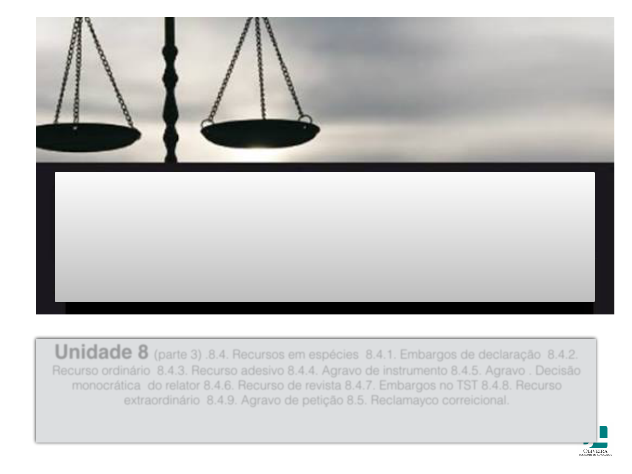 DIREITO PROCESSUAL DO TRABALHO de acordo com o novo CPC (2017.1) Unidade 8 (parte 3) .8.4. Recursos em espécies 8.4.1. Embargos de declaração 8.4.2. Recurso ordinário 8.4.3. Recurso adesivo 8.4.4. Agravo de instrumento 8.4.5. Agravo . Decisão monocrática do relator 8.4.6. Recurso de revista 8.4.7. Embargos no TST 8.4.8. Recurso extraordinário 8.4.9. Agravo de petição 8.5. Reclamaусo correicional. 2 3 4 5 6 STF ACÓRDÃO (tramitação CPC) FIM TRÂNSITO JULGADO TIPOS DE AGRAVOS NA JUSTIÇA DO TRABALHO 1. AGRAVO DE INSTRUMENTO - art. 897, alínea B, CLT. 2. AGRAVO DE PETIÇÃO - art. 897, alínea A CLT 3.AGRAVO - art. 932, do CPC e Art. 896,par. 12o. CLT 4. AGRAVO REGIMENTAL 1. AGRAVO DE INSTRUMENTO - art. 897, alínea B, CLT. • Recurso cabível contra as decisões que denegarem seguimento aos recursos ordinário e de revista, agravo de petição, recurso extraordinário e ao próprio AÍ. • o julgamento do agravo de instrumento será feito pelo tribunal competente para apreciar o recurso cujo seguimento foi denegado (art. 897, §4º, da CLT); 1.Instruído com documentos do § 5º, do art. 897, da CLT e não há custas. 2.CONTRAMINUTA AI e CONTRARRAZÕES ao Recurso denegado (§ 6º, do art. 897, CLT); 3.IN 16 do TST- interpretação do AI e sua autuação. 4.Não cabe AI nos casos de negar seguimento aos EMBARGOS no TST. 5.Juízo de retratabilidade. 6.Cabível das decisões que denegarem recursos quando realizado o 1o Juízo de admissibilidade nos Tribunais. 1. AGRAVO DE INSTRUMENTO - art. 897, alínea B, CLT. 7.Depósito judicial: 50% do valor do recurso trancado. Não tem custas. Art. 899, § 8º Quando o agravo de instrumento tem a finalidade de destrancar recurso de revista que se insurge contra decisão que contraria a jurisprudência uniforme do Tribunal Superior do Trabalho, consubstanciada nas suas súmulas ou em orientação jurisprudencial, não haverá obrigatoriedade de se efetuar o depósito referido no § 7º deste artigo. Art. 899, § 7º No ato de interposição do agravo de instrumento, o depósito recursal corresponderá a 50% (cinquenta por cento) do valor do depósito do recurso ao qual se pretende destrancar. 8.Inexigibilidade do Depósito judicial de 50% : Três hipóteses em que não se exige o depósito: 1. Jurisprudência uniforme do TST. 2. Súmula do TST 3. OJ,S da SDI do TST IN 40 TST. 1° Admitido apenas parcialmente o recurso de revista, constitui ônus da parte impugnar, mediante agravo de instrumento, o capítulo denegatório da decisão, sob pena de preclusão. 2. AGRAVO DE PETIÇÃO - art. 897, alínea A! CLT • Está previsto nos arts. 893, IV e 897, alínea “a”, da CLT; • É o recurso cabível das decisões proferidas no processo de execução (art. 897, alínea “a” e § 3º, da CLT); • possui como pressuposto específico de admissibilidade a delimitação justificada da matéria e dos valores impugnados (art. 897, § 1º, da CLT); • Não se exige custas e depósito judicial, quando o juízo estiver garantido. 3.AGRAVO(interno) 1021 em razão das decisões do art. 932., CPC eDO ART. 896,par.12o.CLT NO TST NO TRT 1.art. 243, VII do Regimento Interno - cabe Agravo ao órgão colegiado competente para o julgamento do respectivo, no prazo de 8 dias: A) da decisão do Relator com base no par. 12do art. 896 da CLT. B) da decisão do Relator dando ou negando provimento ou negando ainda seguimento a recurso, nos termos do art. 557 par. 1-A do CPC. A) da decisão do Relator dando ou negando provimento ou negando ainda seguimento a recurso, nos termos do art. 932 do CPC. B) O prazo é de 8 dias. C) Há na doutrina dúvidas sobre a possibilidade do relator no RO aplicar o referido artigo do CPC nos casos de súmula impeditiva de recurso. 4. AGRAVO REGIMENTAL 1. Recurso utilizado para Impugnar decisões na forma dos Regimentos Internos dos Tribunais. 2. No TST o prazo é de 8 dias. 3. Nos TRTS depende dos Regimentos (no TRT/RIO é de 8 ( cinco ) dias. 4. Será encaminhado para o Órgão Colegiado, nos autos principais. 5. Não há previsão para custas ou deposito judicial. 6. Se for negado seguimento ao Recurso de Embargos para SDI ou SDC o recurso será o Agravo Regimental. MACETE: Mandado Segurança Embargos para SDI Liminar Embargos para SDC Correição parcial Ação rescisória 4.1. AGRAVO REGIMENTAL A. Decisão monocrática do relator que indefere petição de ação de Competência originária dos Tribunais, tais como MS e AÇÃO RESCISÓRIA. B. Dos despachos e decisões do juízo corregedor. C. Do despacho denegatório de seguimento de recurso de Embargos pelo Presidente do TST IN 39 TST.. 6° Aplica-se ao Processo do Trabalho o incidente de desconsideração da personalidade jurídica regulado no Código de Processo Civil (arts. 133 a 137), assegurada a iniciativa também do juiz do trabalho na fase de execução (CLT, art. 878). § 1o Da decisão interlocutória que acolher ou rejeitar o incidentel: II – na fase de execução, cabe agravo de petição, independentemente de garantia do juízo III – cabe agravo interno se proferida pelo Relator, em incidente instaurado originariamente no tribunal (CPC, art. 932, inciso VI)