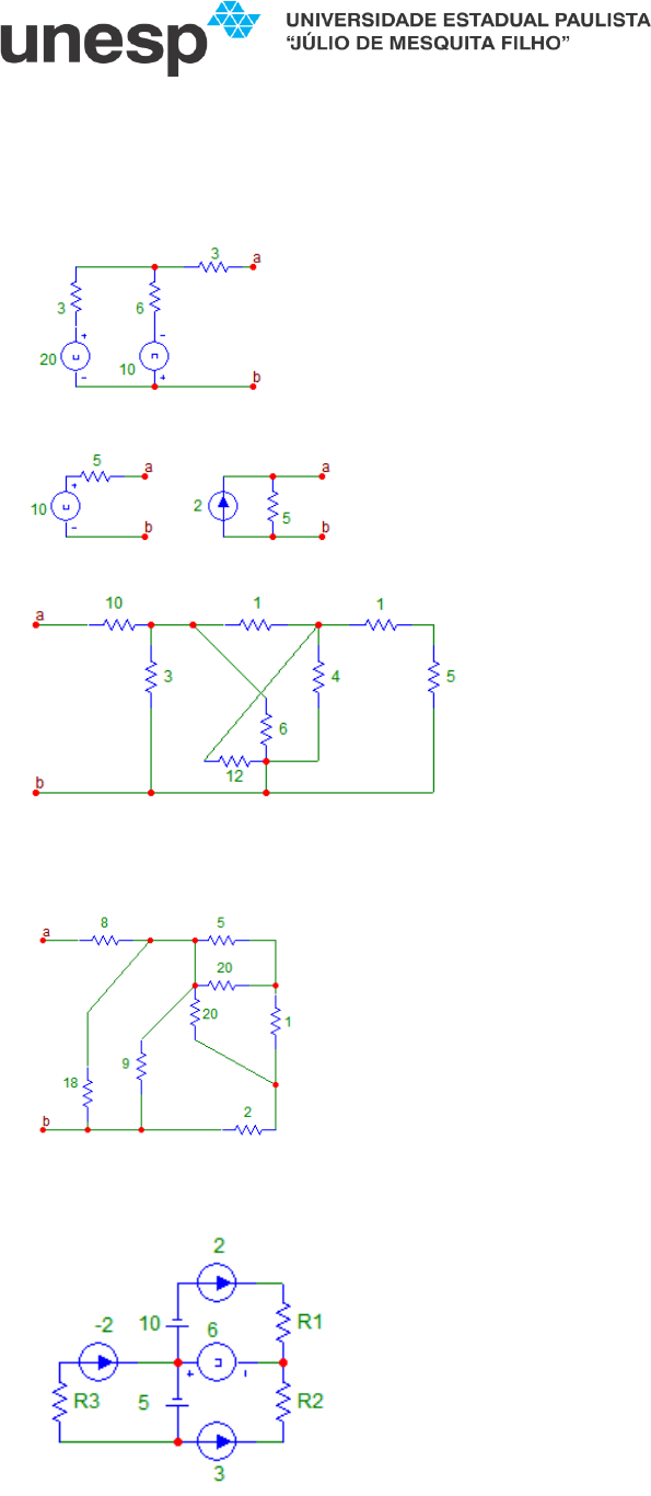 Atividade 1 Série de Exercícios 1) Obtenha os circuitos equivalentes de Thévenin e Norton do seguinte circuito. . :R 2) Determine a resistência equivalente Rab vista dos terminais ab do circuito abaixo. . :R R=11,2 3) Determine a resistência equivalente Rab vista dos terminais ab do circuito abaixo. . :R R=11 4) No circuito abaixo, determine a potência gerada pela bateria de 5 V. . : 5vR P =-5 W Campus Experimental de Rosana Curso de Engenharia de Energia 5) Calcule a potência de saída de um motor cc de 250 V, caso o rendimento seja de 92% quando a corrente de entrada for de 12 A. . : saídaR P =2760 W 6) Determine o valor da fonte de tensão Vs a qual resulta em uma corrente de 7,5 mA no resistor de 3 , como mostrado no circuito abaixo. . :R Vs=0,705 V 7) Determine a corrente I no circuito abaixo: . :R I=-5 A 8) Determine o valor de R que permite a máxima transferência de potência pelo terminais ab do circuito abaixo. . :R R= 11 9) Determine a corrente gerada pela fonte de 60 V no circuito abaixo: a) por corrente de ramos b) por corrente de malhas c) por tensão de nós. . :R I= 6 A 10) Calcule a resistência interna de uma bateria que tem uma tensão em aberto de 12 V e fornece 100 A para uma resistência de 0,10 . . :R R=0,02 11) Medidas feitas em uma fonte prática cc mostram uma tensão de 100 V para uma carga de 100 e 105 V para uma resistência de 210 . Obtenha o modelo do circuito para esta fonte. . :R V=110 V, R=10 12) Obtenha a potência total fornecida por uma fonte de 60 V e potência absorvida por cada resistor. . : fonteR P =360 W 13) Calcule a corrente no resistor de 23 pela aplicação do princípio da superposição. . : R=23R i =11,23 A 14) Dois resistores de 1 , nominais de 25 W e 50 W, são disponíveis para o uso no circuito abaixo. A) Ambos os resistores podem ser aplicados no circuito? B) Determine as potências absorvidas por cada elemento. . : 70 R=1 10V 7A R P =49 - logo o resistor com potência 25 W não pode ser utilizado. P W, P =21 W 15) Para o circuito abaixo determine: a) v1 e v2 b) a potência dissipada nos resistores de 3 k e 20 k c) a potência dissipada na fonte de corrente. . : 1 2R a) v =15 V v =20 V b) 75 mW, 20 mW c) 200 mW 16) Determine Rab e i no circuito abaixo. . : ,abR R =40 i=2,5 A 17) 3 lâmpadas estão ligadas conforme a figura abaixo. Calcule a) corrente total fornecida pela bateria, b) corrente em cada lâmpada e c)a resistência de cada lâmpada. . : , 4,05 1,945 1,297bat 1 2 3 1 2 3R a)I =5 A b) i =2,222 A i =i =2,778 A c) R R R 18) Sabendo que a fonte de tensão é de 40V e que todas as resistências são de 1 Ohm. Determine a corrente i: . : 5R i A 19) Calcule as tensões de nó do circuito abaixo. . : 13,33 201 2R v V, v V 20) Calcule as tensões de nó do circuito abaixo. . : 2 141 2R v V, v V 21) Calcule as tensões de nó do circuito abaixo. . : 4,8 2,4 2,41 2 3R v V, v V, v V 22) Calcule as tensões de nó do circuito abaixo. . : 7,333 5,3331 2R v V, v V 23) Calcule as tensões de nó do circuito abaixo. . : 26,667 6,667 173,333 46,6671 2 3 4R v V, v V, v V, v V 24) Calcule as correntes de malha do circuito abaixo. . : 2 /3 01 2R i A, i A 25) Calcule a corrente io por análise de correntes de malha no circuito abaixo. . : 5oR i A 26) Calcule as correntes de malha do circuito abaixo. . : 3,474 0,4737 1,10521 2 3R i A, i A, i A 27) Determine a tensão Vab abR.: V =40,5 V 28) Determine a tensão vo utilizando o teorema da superposição de efeitos. oR.: V =12 V 29) Calcule io utilizando a) transformação de fontes e b) teorema da superposição de efeitos. oR.: i =1,78 A 30) Calcule o circuito equivalente da esquerda dos terminais ab do circuito abaixo utilizando o teorema de a) Thevenin e b) Norton, e finalmente c) calcule a corrente i. R.: i=1,5 A 31) Calcule o equivalente Thévenin dos terminais ab do circuito abaixo , 20Th ThR.: R =6 V V 32) Calcule o equivalente a) Thévenin e b) Norton para o circuito abaixo a partir dos terminais ab. , 4 1Th Th NR.: R =4 V V, I A 33) Calcule o equivalente Norton para os terminais ab do circuito abaixo. , 10N NR.: R =1 I A 34) Determine I e R para que os dois circuitos sejam equivalentes: R.: I=2 A, R=5 35) Determine o valor R para Vab=4 Volts: R.: R=2 36) Simplifique a rede com relação aos terminais A e B: R.: 37) Determine os valores de R e E sabendo-se que o equivalente Thevenin para os terminas AB é: R.: R=3 , E=10 V 38) Sabendo que o amperímetro indica 3 A, determine o valor da fonte I no circuito abaixo. R.: I=10/3 A 39) No circuito abaixo foram feitos testes que estão descritos na tabela ao lado. Com base nestes resultados, determine a leitura do amperímetro quando R=9, I=2 e E=8. 40) No circuito abaixo, quando E=20 I=1 R=6 temos i=1 . Quando E=40 I=1 R=7 então i=2. Quando E=20 I=4 R=2 temos i=0,5. Calcule i quando R=0 E=10 e I=5. 41) No circuito abaixo, calcule o valor lido no amperímetro quando a chave S está na posição 2, sabendo que quando S está na posição 1 o circuito da esquerda (dentro da caixa maior) transfere a máxima potência possível. R.: Valor lido no Amp=9 A R E I V A 3 -2 4 12 x 2 5 2 x 0 7 10 2 x 1 9 8 2 x ?