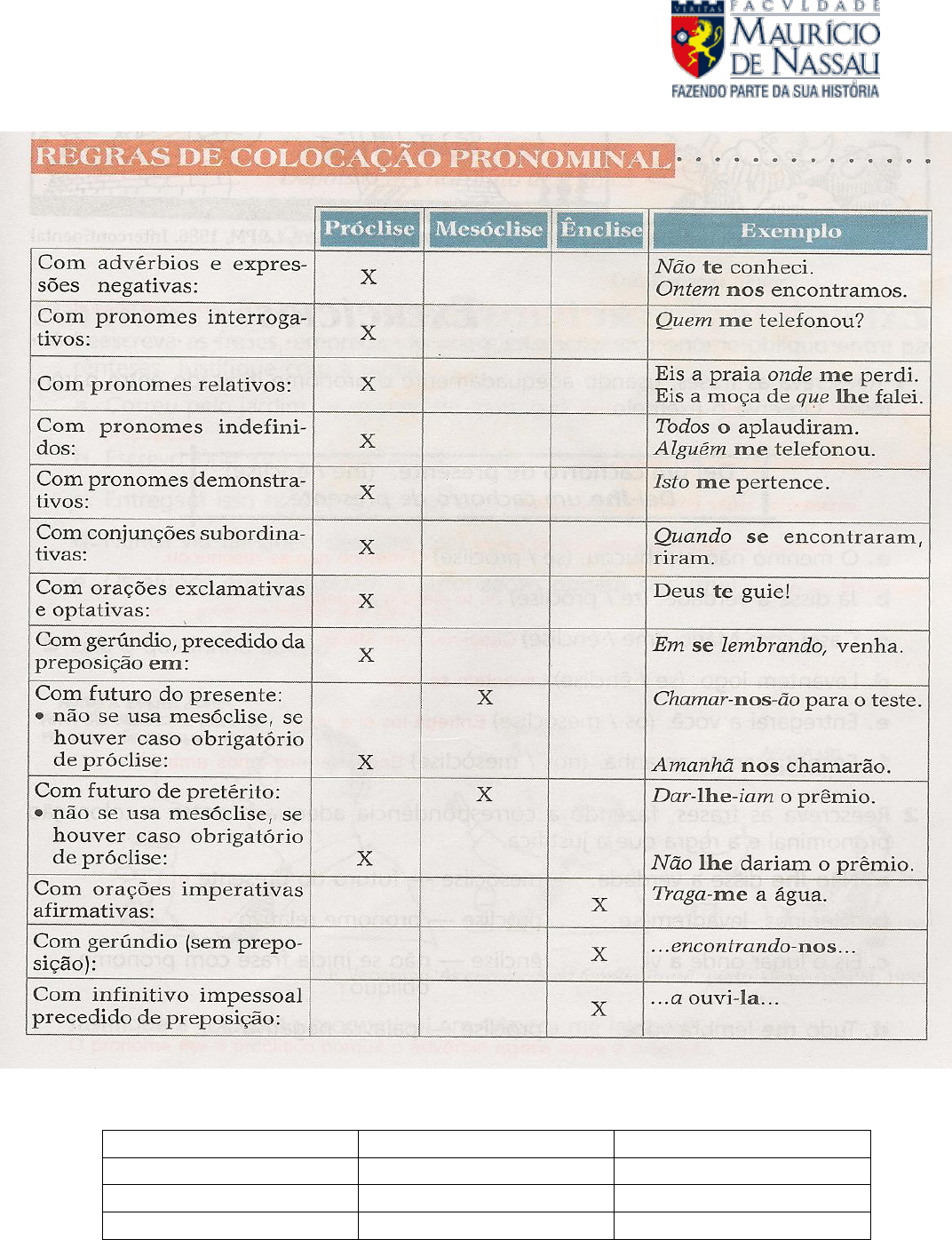 Disciplina: Comunicação e Expressão Assunto : Colocação Pronominal Veja a tabela dos pronomes oblíquos átonos: singular plural Primeira pessoa me nos Segunda pessoa te vos Terceira pessoa o,a,se,lhe os,as,se,lhes Exercícios Para as perguntas de 01 a 29 você deverá assinalar com “C “ o que estiver correto e com “I” os incorretos: 01) ( ) Não se permitiam mulheres na política. 02) ( ) Nossa vocação molda-se às necessidades. 03) ( ) Se não fosse a chuva, acompanhar-te-ia. 04) ( ) Macacos me mordam! 05) ( ) Ninguém socorreu-nos naqueles momentos difíceis. 06) ( ) As informações que se obtiveram, chocavam-se entre si. 07) ( ) Quem te falou a respeito do caso? 08) ( ) Não só me trouxe o livro, mas também me deu presente. 09) ( ) Ele chegou e perguntou-me pelo filho. 10) ( ) Em se tratando de esporte, prefere futebol. 11) ( ) Vamos, amigos, cheguem-se aos bons. 12) ( ) O torneio iniciar-se-á no próximo Domingo. 13) ( ) Amanhã dizer-te-ei todas as novidades. 14) ( ) Para não falar- lhe, resolveu sair cedo. 15) ( ) A turma havia convidado-o para sair. 16) ( ) Algumas haviam-nos contado a verdade. 17) ( ) As meninas não tinham nos convidado para sair. 18) ( ) Alguém se interessou pelo caso. 19) ( ) Hoje nos alegramos com tantas conquistas. 20) ( ) Em se tratando de computador, entendo do assunto. 21 ( ) Espero que te interesses por nossa causa. 22. ( ) A resposta que deram-nos já era esperada. 23. ( ) Deus perdoe-lhe estas palavras! 24. ( ) Justificou-nos a sua ausência à reunião. 25. ( ) Deixe-o na gaveta do armário. 26) ( ) Não se explicou, nos deixando apreensivos. 27) ( ) Vai me acompanhar até o aeroporto? 28) ( ) Conceder-nos-ia alguns minutos, senhor? 29 ( ) Os sonhos encorajá-lo-ão na busca da felicidade.