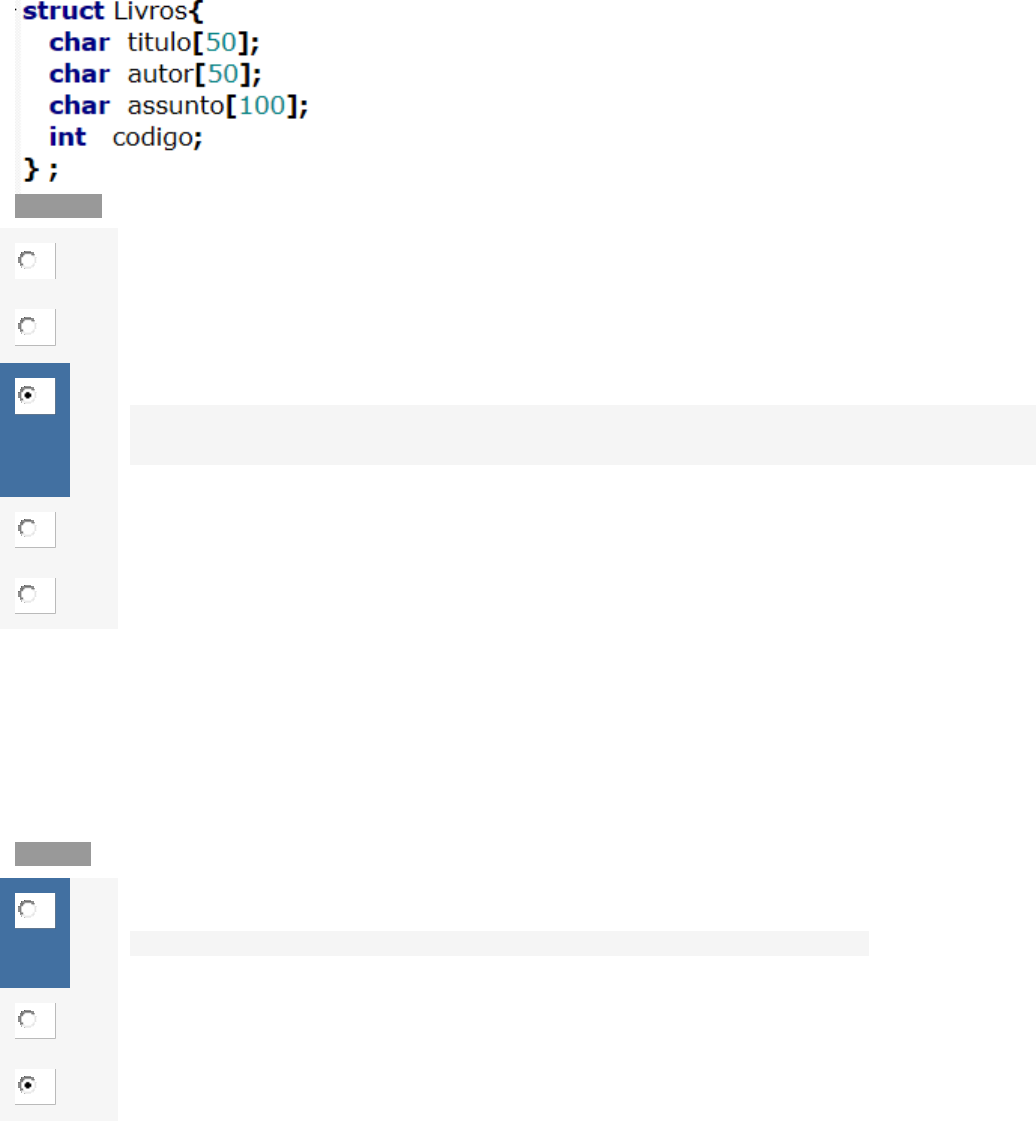 APOL 5 – Linguagem de Programação – Uninter – Nota 80 Questão 1/5 - Linguagem de Programação Observe que ao definirmos uma struc na linguagem de programação C/C++ estamos, na verdade, definindo um novo tipo de dado, que existirá na memória, enquanto o seu programa for executado. Sendo assim, podemos criar estruturas de dados contendo este tipo recém criado. Considerando esta afirmação. Indique, nas opções a seguir, qual declara corretamente um array, ou vetor, de structs, considerando a struct a seguir: Nota: 20.0 A int A[20] struct Livros; B double B[5] Livros struct; C struct Livros C[10]; Você acertou! struct Livros define o tipo do array C D struct[10] Livros D; E E[9] Livros Questão 2/5 - Linguagem de Programação No que diz respeito a manipulação de arquivos na linguagem de programção C, como estamos estudando nesta disciplina, podemos afirmar que a maior parte da funções prédefinidas para o uso em programas que manipularão arquivos estão disponíveis na biblioteca: Nota: 0.0 A stdio.h Conteúdo abordado na Aula 6 (slide 6). B conio.h C stdlib.h D arquivo.h E file.h Questão 3/5 - Linguagem de Programação Um programador desejava fazer um programa para somar dois números reais. Infelizmente, por questões internas a sua empresa, o supervisor exigiu que o programa usasse apenas variáveis inteiras. Considerando o código a seguir, assinale a alterantiva que expressa o que será impresso na tela se o programa for executado, considerando que serão digitados os números 1,89 e 2,35. Cabe a você determinar exatamente o que seria impresso na tela considerando o código apresentado acima. Nota: 20.0 A O resultado= 4,24 B O resultado= 4,25 Você acertou! Para que o resultado apresente a soma correta teríamos que substituir a linha d3.cen = d3.cen - 99; por : d3.cen = d3.cen - 100; C O resultado= 2,25 D O resultado= 4,26 E O resultado= 1,89 Questão 4/5 - Linguagem de Programação Considerando a definição da struc livro, a seguir. Indique nas alternativas qual define uma variável deste tipo corretamente. Nota: 20.0 A principe struct Livros; B Livros struct principe; C struct Livros principe; Você acertou! Usamos primeiro a palavra reservads struct, seguida do nome dado a estrutura e finalmente criamos um nome para a variável deste tipo. Observe que as letras minúsculas e maiúsculas são importantes. D struct principe Livros; E struct livros principe; Questão 5/5 - Linguagem de Programação Você deve fazer um programa capaz de armazenar os pontos obtidos em uma campeonato de lançamento de dardos com 4 jogadores. Seu programa deverá armazenar o primeiro nome de cada jogador com até 29 caracteres e os pontos que este fizer sabendo que no máximo é possível fazer 9999 pontos em cada jogada. Ao final de cada rodada você deverá imprimir uma tabela contendo o nome do jogador, na ordem que este jogou, e seus pontos. Observe que cada vez que o programa for executado deverá armazenar apenas os dados referentes a uma rodada com os pontos obtidos por cada jogador. Considerando isso, qual das opções a seguir contém um código capaz de atender esta solicitação? Nota: 20.0 A B C D E Você acertou!