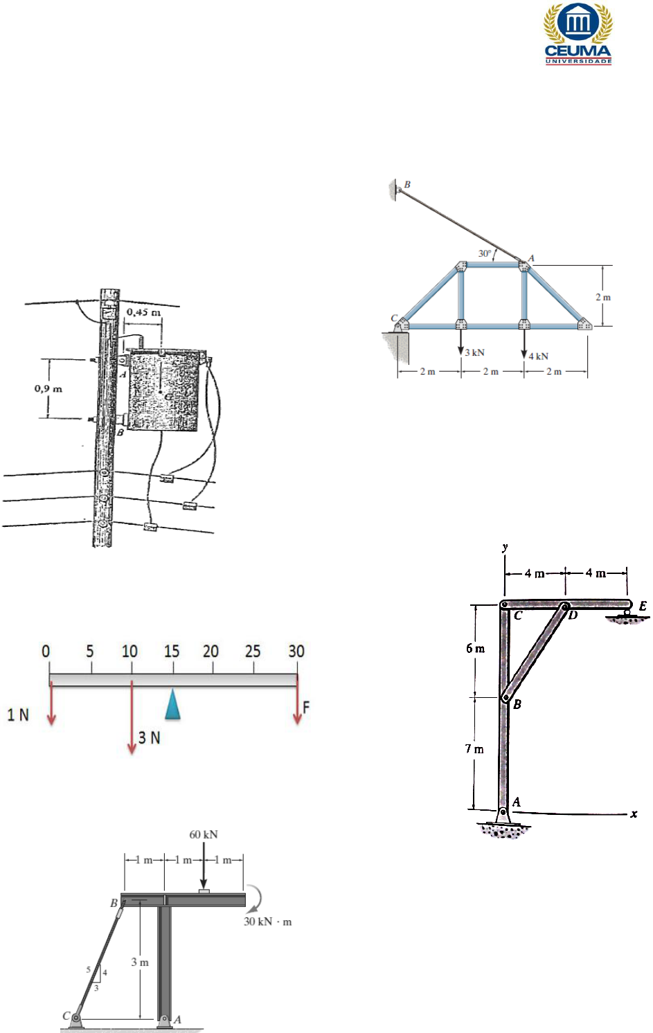 UNIVERSIDADE CEUMA Disciplina: Mecânica Geral. Curso de Engenharia civil – 3º Período. Prof. Wesdney Melo LISTA DE EXERCÍCIOS 02 1ª) O transformador elétrico de 1500 N com centro de gravidade em G é sustentado por um pino em A e um apoio em B. Determine as componentes horizontal e vertical da reação no pino A e a reação do apoio B sobre o transformador. 2ª) A régua abaixo é homogenia e está em equilíbrio estático. Calcule o valor de F. 3ª) Encontre a tração no pino A desenvolvida no cabo BC usado para sustentar a estrutura de aço. 4ª) Determine as componentes horizontal e vertical no pino C e a tração no cabo AB da treliça da figura. 5ª) Cada um dos três elementos da estrutura tem massa por unidade de comprimento de 6 kg/m. Localize a posição (x,y) do centro de gravidade. Despreze as dimensões dos pinos nas juntas e a espessura dos elementos. Calcule também as reações no pino A e no rolete E. 6ª) A barragem de gravidade é feita de concreto. Determine a localização do centro de gravidade G para a parede. 7ª) Localize o centroide y da seção transversal do pedestal. 8ª) As placas de aço e alumínio estão montadas com parafusos e estão montadas com parafusos e estão presas na parede. Cada placa tem largura constante na direção z igual a 200 mm e espessura de 20 mm. Sendo as densidades de A e B iguais a ρaço = 7850 kg/m 3 e, para C, ρal=2710 kg/m 3, determine a localização X do centro de massa. Despreze as dimensões dos parafusos. 9ª) Localize o centróide (x,y,z) do fio. 10ª) Localize o centróide (x,y,z) do fio que está dobrado na figura abaixo. 11ª) A treliça composta de sete membros, cada um tendo uma massa por unidade de comprimento de 6kg/m. Localize a posição (x,y) do centro de massa. Despreze a massa das placas de ligação das juntas. 12ª) Localize o centróide (x,y) da área da seção transversal do canal. 13ª) Localize o centróide x da área composta da figura abaixo. 14ª) Resolva a questão anterior para r0=5mm e ri=3mm. 15ª) Localize o centróide x e y da área composta da figura a seguir. 16ª) Determine o momento de inercia em relação ao eixo y da figura abaixo. 17ª) Determine a distância y até o centróide da área da seção transversal da viga, depois encontre o momento de inércia em relação ao eixo x’. 18ª) Determine o momento de inércia da área composta em relação aos eixos x e y.