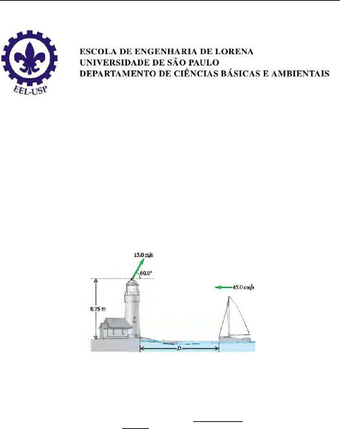 Turma 20141A2 Fı´sica I Prof. Dr. B. Cuadros-Melgar Lista de Exercı´cios: Cinema´tica e Leis de Newton 1. O Homem Aranha salta do topo de um edifı´cio alto. Ele cai em queda livre, a partir do repouso ate´ o solo, por uma distaˆncia de h. Ele cai uma distaˆncia de h/4 no u´ltimo 1, 0 s da sua queda. Qual e´ a altura h do pre´dio? 2. Na selva, um veterina´rio com uma arma carregada com um dardo tranqu¨ilizante e um macaco astuto de 1, 5 kg esta˜o 25 m acima do solo, cada qual em uma a´rvore a 90 m de distaˆncia uma da outra. Assim que o cac¸ador atira horizontalmente no macaco, este se solta da a´rvore na tentativa de escapar do tiro. Qual deve ser a velocidade mı´nima do dardo no cano da arma para que o cac¸ador atinja o macaco antes que ele chegue ao cha˜o? 3. Um navio se aproxima do porto a 45, 0 cm/s e uma importante pec¸a do equipamento de ancoragem precisa ser lanc¸ada, para que ele possa aportar. Esse equipamento e´ lanc¸ado a 15, 0 m/s e 60, 0o acima da horizontal, do topo de uma torre, a` beira da a´gua, 8, 75 m acima do conve´s do navio (Fig.1). Para esse equipamento cair na frente do navio, a que distaˆncia D da doca deve estar o navio quando o equipamento for lanc¸ado? Despreze a resisteˆncia do ar. Figura 1: Problema 3 4. Um proje´til e´ lanc¸ado com velocidade v0 formando um aˆngulo α0 com a horizontal. O ponto de lanc¸amento esta´ situado a uma altura h acima do solo. a) Desprezando a resisteˆncia do ar, mostre que a distaˆncia horizontal percorrida pelo proje´til antes de ele atingir o solo e´ dada por x = v0 cosα0 g (v0 sinα0 + √ v20 sin 2 α0 + 2gh) . (1) Verifique que, se o ponto de lanc¸amento estivesse situado no mesmo nı´vel do solo, isto e´, h = 0, essa expressa˜o se reduziria ao alcance horizontal R. 1 Turma 20141A2 Fı´sica I Prof. Dr. B. Cuadros-Melgar 5. Uma mangueira de a´gua e´ usada para encher um grande tanque cilı´ndrico com diaˆmetro D e altura 2D. O jato de a´gua sai da mangueira a 45o acima da horizontal, a partir do mesmo nı´vel da base do tanque, e esta´ a uma distaˆncia 6D (Fig.2). Para qual alcance de velocidade de lanc¸amento (v0) a a´gua entrara´ no tanque? Despreze a resisteˆncia do ar e expresse sua resposta em termos de D e g. Figura 2: Problema 5 6. Uma bola de neve rola do telhado de um celeiro que possui uma inclinac¸a˜o para baixo igual a 40o (Fig.3). A extremidade do telhado esta´ situada a 14, 0 m acima do solo e a bola de neve possui velocidade de 7, 0 m/s quando ela abandona o telhado. Despreze a resisteˆncia do ar. a) A que´ distaˆncia do celeiro a bola de neve atingira´ o solo caso na˜o colida com nada durante sua queda? b) Um homem de 1, 9 m de altura esta´ parado a uma distaˆncia de 4, 0 m da extremidade do celeiro. Ele sera´ atingido pela bola de neve? Figura 3: Problema 6 7. Henriqueta esta´ indo para a aula de fı´sica e corre pela calc¸ada a 3, 05 m/s. De repente, seu marido Bruno percebe que ela saiu com tanta pressa que esqueceu o sanduı´che. Ele corre para a janela do apartamento, que esta´ 43, 9 m acima do nı´vel da rua e se projeta sobre a calc¸ada, pretendendo jogar o lanche para a esposa. Bruno joga o pacote horizontalmente 9, 0 s apo´s Henriqueta passar sob a janela e ela consegue apanha´-lo sem parar de correr. Despreze a resisteˆncia do ar. a) Com que velocidade inicial Bruno deve jogar o sanduı´che para que Henriqueta possa apanha´-lo antes que caia no cha˜o? b) Onde esta´ Henriqueta quando apanha o sanduı´che? 8. Uma pedra amarrada em uma corda se move no plano xy. Suas coordenadas sa˜o dadas em func¸a˜o do tempo por x(t) = R cosωt y(t) = R sinωt , (2) onde R e ω sa˜o constantes. a) Mostre que a distaˆncia da pedra ate´ a origem e´ constante e igual a R, ou seja, sua trajeto´ria e´ uma circunfereˆncia de raio R. b) Mostre que em cada ponto o vetor velocidade e´ perpendicular ao vetor posic¸a˜o. c) Mostre que o vetor acelerac¸a˜o e´ sempre oposto ao vetor posic¸a˜o e possui mo´dulo igual aω2. d) Mostre que o mo´dulo da velocidade da pedra e´ constante e igual a ωR. e) Combine os resultados das partes (c) e (d) para mostrar que a acelerac¸a˜o da pedra possui mo´dulo constante igual a v2/R. 2 Turma 20141A2 Fı´sica I Prof. Dr. B. Cuadros-Melgar 9. Uma partı´cula se move em um plano xy. Suas coordenadas sa˜o dadas em func¸a˜o do tempo por x(t) = R(ωt− sinωt) y(t) = R(1− cosωt) , (3) onde R e ω sa˜o constantes. Determine os componentes da velocidade e da acelerac¸a˜o da partı´cula em qualquer tempo t. 10. Voceˆ acabou de pousar no Planeta X e apanha uma bola de 100 g. Voceˆ a deixa cair, a partir do repouso, de uma altura de 10, 0 m e cronometra que ela leva 2, 2 s para atingir o solo. Ignore qualquer forc¸a sobre a bola exercida pela atmosfera do planeta. Quanto a bola de 100 g pesa na superfı´cie do Planeta X? 11. Duas caixas, uma de massa de 4, 0 kg e outra de 6, 0 kg esta˜o em repouso sobre a superfı´cie sem atrito de um lago congelado, ligadas por uma corda leve (Fig.4). Uma mulher usando um teˆnis de solado a´spero (de modo que ela possa exercer trac¸a˜o sobre o solo) puxa horizontalmente a caixa de 6, 0 kg com uma forc¸a F que produz uma acelerac¸a˜o de 2, 5 m/s2. a) Qual e´ a acelerac¸a˜o da caixa de 4, 0 kg? b) Ache a tensa˜o T na corda que conecta as duas caixas. c) Qual e´ a direc¸a˜o da forc¸a resultante sobre a caixa de 6, 0 kg? d) Calcule o mo´dulo da forc¸a F. Figura 4: Problema 11 12. Os dois blocos indicados na Fig.5 esta˜o ligados por uma corda uniforme e pesada, com massa de 4, 0 kg. Uma forc¸a de 200 N e´ aplicada de baixo para cima conforme indicado. a) Qual e´ a acelerac¸a˜o do sistema? b) Qual e´ a tensa˜o no topo da corda pesada? c) Qual e´ a tensa˜o no meio da corda? Figura 5: Problema 12 13. A posic¸a˜o de um helico´ptero de treinamento de 2, 75× 105 N e´ dada por ~r = (0, 020 m/s3)t3~i+ (2, 2 m/s)t~j− (0, 060 m/