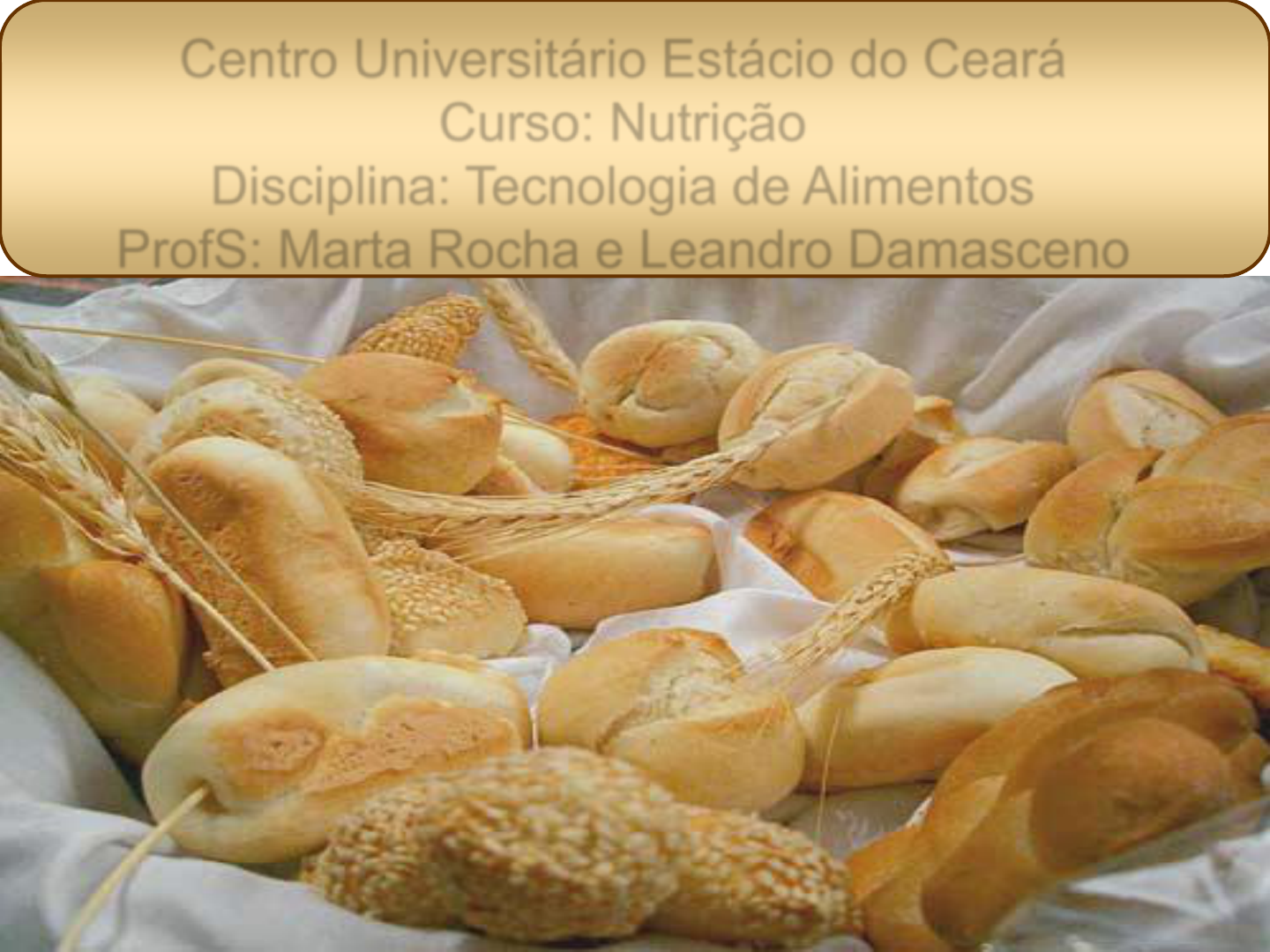 Centro Universitário Estácio do Ceará Curso: Nutrição Disciplina: Tecnologia de Alimentos ProfS: Marta Rocha e Leandro Damasceno Panificação Introdução 10.000 a.C Pão = farinha + água Cozimento em pedras quentes Resultado – achatado, duro por fora e macio por dentro Pão fermentado Descoberta ao acaso - Egito Massa crua esquecida fora do fogo Resultado – crescimento da massa Pão com textura fina Século XIX – Louis Pasteur – provou que a causa das fermentações era a ação de microrganismos Matérias-primas Dividem-se em dois grandes grupos: Essenciais • Farinha de trigo • Água • Fermento biológico • Sal Não essenciais • Açúcar • Gordura Matérias-primas Farinha de trigo É o componente estrutural da massa Ingrediente fundamental para obtenção do pão Glúten – farinha de trigo + água + trabalho mecânico (amassamento) Constituintes % Umidade 10 a 14 Proteína 7 a 13 Gordura 1 a 2 Amido 50 a 70 Outros açúcares 1 a 2 Matérias-primas Farinha de trigo Composição do glúten: • Gliadina – consistência e viscosidade da massa • Glutenina – responsável pela elasticidade e extensibilidade Importância do glúten nos processos de panificação: •GLÚTEN : retém bolhas de gás (gás carbônico) produzido pelo fermento + calor: crescimento e produto crocante. •Farinhas integrais: Redução na formação do glúten e à diminuição da capacidade de retenção de gases. Matérias-primas Farinha de trigo Amido • Polissacarídeo complexo composto por unidades de glicose • Dois polímeros: AMILOSE e AMILOPECTINA Matérias-primas Farinha de trigo Amido • Função na panificação – desdobram o amido em dextrina e maltose • Maltose – desdobrada em glicose • Dextrina – importante na coloração da crosta do pão •Auxilia na manutenção da estrutura do pão durante o cozimento – retenção dos gases produzidos na fermentação Maltose Dextrina Matérias-primas Água Funções da água na panificação: • Possibilita a formação do glúten • Controla a consistência da massa • Controla a temperatura da massa, aquecendo-a ou resfriando-a • Dissolve os sais • Umedece e intumesce o amido, deixando-o mais digerível • Possibilita a ação das enzimas • Controla a maciez e palatabilidade do pão Matérias-primas Fermento biológico Saccharomyces cerevisiae Funções na panificação: • Fazer a conversão de açúcares em CO2 e etanol – crescimento do pão • Exerce influência sobre as propriedades da massa, tornando-a mais elástica e porosa Existem no mercado dois tipos de fermento biológico que são comercializados: • Fermento fresco • Fermento seco (granulado) Matérias-primas Sal Funções na panificação: • Controlar a fermentação • Fortificar o glúten das farinhas – gliadina tem maior solubilidade na água com sal • Ação bactericida • Ressaltador de sabores • Clareamento do miolo do pão Matérias-primas Açúcar Funções na panificação: • Serve como fonte auxiliar de carboidratos fermentescíveis para as leveduras • Contribui para melhorar o sabor, o aroma e a cor do pão • Reação de Maillard e Caramelização Matérias-primas Gorduras Funções na panificação: • Exibem a capacidade de se posicionarem entre camadas de glúten, facilitando o deslizamento entre as proteínas – lubrificam o glúten, o que resulta em maior extensibilidade das massas • Proporcionam pães com maiores volumes – aumento em torno de 10 % • Tornam a massa mais macia, melhorando a textura do miolo • Contribuindo para retardar o envelhecimento do pão • Atuam ainda sobre o sabor e sobre o valor nutricional Aditivos Emulsificantes Os principais emulsificantes utilizados em panificação são os polisorbatos Efeitos: • Lubrificação da massa • Substituição parcial ou total da gordura • Diminuição da taxa de retrogradação do amido – maior vida de prateleira do produto panificado • Interação com o glúten – pães com maior volume e melhor estrutura • Influência benéfica sobre a crosta e a crocância dos pães Aditivos Agentes oxidantes Reforçam a rede de glúten Exemplo: ácido ascórbico Efeitos: • Aumento da resistência à extensão - diminui a extensibilidade • A capacidade de retenção de gases é aumentada – pães com maior volume • Aumentam o “oven-rise” – aumento rápido de volume que ocorre nos primeiros minutos após a massa entrar no forno. Aditivos Agentes branqueadores O único branqueador previsto pela legislação brasileira é o peróxido de benzoíla. Atuam sobre os pigmentos carotenóides da farinha de trigo, oxidando-os – pães com miolo mais branco Aditivos Enzimas Mais comumente utilizadas: amilases Habilidade em retardar o ressecamento – inibição do endurecimento do pão, devido a alterações que inclui a retrogradação do amido Tipos: • α-amilase (aumento do poder redutor) • β-amilase (aumento da doçura) Processamento do pão Fermentação principal Divisão Boleamento Fermentação secundária Moldagem Mistura/Amassamento Processamento do pão Cozimento Fermentação final Processamento do Pão Mistura/Amassamento Importância: • Misturar os ingredientes da massa - homogeneizar • Assegurar um trabalho mecânico sobre a mesma – iniciando o desenvolvimento do glúten • Obtenção de uma massa com propriedades viscoelásticas adequadas • Incorporação de ar: bolhas de ar que serão a base para a estrutura do miolo do pão. Temperatura de 26-28ºC – inibir a produção excessiva de gases Processamento do Pão Mistura/Amassamento Processamento do Pão Fermentação principal É uma fermentação alcoólica e anaeróbica produzida pela ação do fermento biológico (levedura) sobre os açúcares presentes na massa. Há a produção de CO2 Formação do sabor e aroma do pão Contribui para sua conservação Duração de até 3 horas, interrompida por uma a duas sovas Resumo da fermentação alcoólica