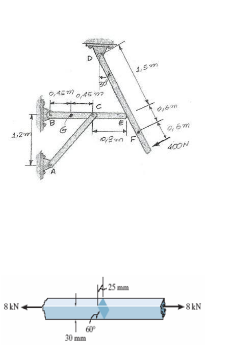 ACQF Semana 1 1 - Determine as cargas internas resultantes que agem na seção transversal da estrutura nos pontos F e G. O contato em E é liso. ( )MF = 140 N.m; NF = 0 N; VF = 200 N; MG = - 162 N.m; NG = 80,54 N; VG = 160 N ( )MF = 240 N.m; NF = 0 N; VF = 400 N; MG = - 16 N.m; NG = 83,54 N; VG = 36 N ( )MF = 240 N.m; NF = 0 N; VF = 400 N; MG = - 162 N.m; NG = 183,54 N; VG = 160 N (X)MF = 240 N.m; NF = 0 N; VF = 400 N; MG = - 162 N.m; NG = 83,54 N; VG = 360 N ( )MF = 240 N.m; NF = 0 N; VF = 40 N; MG = - 102 N.m; NG = 83,54 N; VG = 360 N 2 - Os dois elementos de aço estão interligados por uma solda de topo angulada de 60º. Determine a tensão de cisalhamento média e a tensão normal média suportada no plano da solda. ( )σ = 10 MPa; Т = 5,24 MPa (X)σ = 8 MPa; Т = 4,62 MPa ( )σ = 5,24 MPa; Т = 10 MPa ( )σ = 4 MPa; Т = 2,31 MPa ( )σ = 4,62 MPa; Т = 8 MPa 3 - A viga composta de madeira está interligada por um parafuso em B. Considerando que os acoplamentos em A, B, C e D exerçam somente forças verticais na viga, determine o diâmetro exigido para o parafuso em B se a tensão de tração admissível para o parafuso for 150 Mpa e a tensão de apoio admissível para a madeira for 28 Mpa. (X)dp = 6,11 mm ( )dp = 3,14 mm ( )dp = 5,12 mm ( )dp = 15,4 mm ( )dp = 8,75 mm 4 - As hastes AB e CD são feitas de aço cuja tensão de ruptura por tração é 510 MPa. Usando um fator de segurança de 1,75 para tração, determine o menor diâmetro das hastes de modo que elas possam suportar a carga mostrada. Considere que a viga está acoplada por pinos em A e C. ( )dAB = 3.01 mm; dCD = 2.70 mm ( )dAB = 6.02 mm; dCD = 5.41 mm ( )dAB = 5,41 mm; dCD = 5.46 mm (X)dAB = 6.02 mm; dCD = 6.41 mm ( )dAB = 5.02 mm; dCD = 6.41 mm 5 - A coluna está submetida a uma força axial de 44 kN no seu topo. Supondo que a seção transversal tenha as dimensões mostradas na figura, determinar a tensão normal média que atua sobre a seção a-a. ( )2,0 Mpa ( )1,0 MPa ( )0,2 MPa (X)10,0 MPa ( )0,1 MPa 6 - Os dois cabos de aço AB e AC são usados para suportar a carga. Se ambos tiverem uma tensão de tração admissível de 200 MPa, determine o diâmetro exigido para cada cabo se a carga aplicada for P = 5 kN. ( )Dab = 15,62 mm ; Dac = 15,84 mm ( )Dab = 4,36 mm ; Dac = 4,48 mm ( )Dab = 6,26 mm ; Dac = 6,48 mm ( )Dab = 10,52 mm ; Dac = 10,96 mm (X)Dab = 5,26 mm ; Dac = 5,48 mm 7 – A junta está presa por dois parafusos. Determine o diâmetro exigido para os parafusos se a tensão de ruptura por cisalhamento para os parafusos for de 350 MPa. Use um fator e segurança por cisalhamento de 2,5. ( )d = 12,39 mm ( )d = 15,40 mm (X)d = 13,49 mm ( )d = 12,10 mm ( )d = 14,39 mm ACQF Semana 2 1 – Uma barra de comprimento 5 m e seção transversal circular de diâmetro 60 mm é submetida a uma força axial de tração de 100 KN. Sabe-se que o módulo de elasticidade do material da barra é de E = 120 GPa e que após a carga ser aplicada houve uma variação de temperatura de 60 oC. Qual a deformação desta barra? Adote α= 12x 10-6 ºC . ( )d = 7,35 mm ( )d = 7,07 mm ( )d = 3,17 mm ( )d = 4,37 mm (X)d = 5,07 mm 2 - Em ensaios de tração realizados com três materiais, foram encontrados os seguintes valores de deformação (∂) correspondentes aos respectivos comprimentos iniciais (L): Ao se analisar a deformação específica normal (ε) de cada material, tem-se que: (X)ε 3 > ε 2 > ε1 ( )ε1 > ε 3 > ε 2 ( )ε1 > ε 2 > ε 3 ( )ε 2 > ε 1 > ε 3 ( )ε 2 > ε 3 > ε1 3 – Determine o Módulo de Elasticidade de uma barra, que tem 1000 mm de comprimento e seção transversal retangular de 90 x 30 mm, sabendo-se que, ao aplicar uma carga axial de tração de 350 KN o seu comprimento aumenta 0,5 mm e a Deformação Específica Transversal é igual a 0,0005 . ( )159,26 GPa ( )129,63 GPa (X)259,26 GPa ( )239,62 GPa ( )229,26 GPa 4 – Qual o valor da deformação especifica normal de uma barra de comprimento inicial 1,75m, que após a aplicação de uma força passa a medir 1,762 m? ( )0,000476 (X)0,00686 ( )0,000506 ( )0,00706 ( )0,000214 5 - O cabeçote H está acoplado ao cilindro de um compressor por seis parafusos de aço. Se a força de aperto de cada parafuso for 4 kN, determine a deformação normal nos parafusos. Cada um deles tem 5 mm de diâmetro. Se σe=280 Mpa e Eaço=200 GPa, qual é a deformação em cada parafuso quando a porca é desatarraxada, aliviando, assim, a força de aperto. ( )1,008 mm ( )0,005 mm ( )0,025 mm (X)0 (zero) mm ( )0,008 mm 6 - Os eixos A e B são feitos de mesmo material e têm seção transversal conforme indicada na figura, de mês a dimensão “b”. Qual é a relação entre os máximos torques T que podem ser aplicados na seção quadrada e na seção circular (T quadrado/ T circunferência)? ( )0,95 ( )1,40 ( )0,50 ( )2,10 (X)1,06 ACQF Semana 3 1 – A barra de cobre da Figura está submetida a um carregamento uniforme ao longo de suas bordas como mostrado. Se ela tiver comprimento a=300 mm, largura b=50 mm e espessura t= 20 mm antes de a carga ser aplicada, determinar seus novos comprimento, largura e espessura após o carregamento. Adotar Ecu= 120 GPa, ν cu = 0,34. ( )a’ = 302,4 mm, b’ = 48,69 mm, t’ = 19,98 mm ( )a’ = 301,4 mm, b’ = 48,69 mm, t’ = 18,98 mm ( )a’ = 302,4 mm, b’ = 49,68 mm, t’ = 18,98 mm ( )a’ = 301,4 mm, b’ = 49,68 mm, t’ = 19,98 mm (X)a’ = 302,4 mm, b’ = 49,68 mm, t’ = 19,98 mm 2 – Um ensaio de tração foi executado em um corpo de prova de aço com diâmetro original 15 mm e um comprimento nominal de 30 cm. Quando uma força axial de tração de 150 kN é aplicada, a barra sofre um alongamento de 2,25 mm. Qual o módulo de elasticidade do material? Considere G = 75 GPa. ( )110,16 GPa ( )125,16 GPa ( )107,35 GPa ( )111,74 GPa (X)113,18 GPa 3 – Um cilindro de aço, de comprimento Lo = 56 mm e diâmetro do = 24 mm, é comprimido entre duas placas rígidas, com uma força P = 45 kN. Se a redução medida no comprimento f