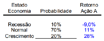 Decisões de Investimento EXERCÍCIOS – Risco e Retorno 1 - Considere uma loteria com três possíveis resultados: uma probabilidade de 0,1 para o recebimento de $100, uma probabilidade de 0,2 para o recebimento de $50 e uma probabilidade de 0,7 para o recebimento de $10. Qual é o valor esperado dessa loteria? VE = (0.1)($100) + (0.2)($50) + (0.7)($10) VE = 10 + 10 + 7 = 27 O valor esperado da loteria é de R$ 27,00 2 - Você possui uma carteira que tem 40% investidos na ação X, 35% na ação Y e 25% na ação Z. Os retornos esperados dessas três ações são iguais a 10%, 16% e 23%, respectivamente. Qual é o retorno esperado dessa carteira? X – 40% x 10% (0,10) = 4 Y – 35% x 16% (0,16) = 5,6 Z – 25% x 23% (0,23) = 5,75 4+5,6+5,75= 15,35 O retorno esperado da carteira é de 15,35% 3 - Com base nas informações a seguir, calcule o retorno esperado. Calcule o retorno esperado. 10% x -9,% (-0,09) - (0,90) 70% x 11% (0,11) - 7,70 20% x 28% (0,28) - 5,60 -0,90 + 7,70 + 5,60 = 12,40 O retorno esperado é de 12,4% 4 - Com base nas seguintes informações, calcule os retornos das duas ações. 0,20x4= 0,80 0,20x(-20)= -4 0,60x8= 4,80 0,60x20= 12 0,20x16= 3,20 0,20x60=12 0,80+4,80+3,20= 8,8% (-4)+12+12= 20% O retorno de A é de 8,8%, enquanto o de B é de 20%, logo a ação B terá um risco mais que o dobro da ação A. 5 - Uma carteira tem 40% investidos na ação G, 40% na ação J e 20% na ação K. Os retornos esperados dessas ações são iguais a 12%, 18% e 34%, respectivamente. Qual é o retorno esperado da carteira? Como você interpreta sua resposta, considerando os riscos das ações equivalentes? G 40% 12% (0,12) = 4,80 J 40% 18% (0,18) = 7,20 K 20% 34% (0,34) = 6,80 4,80+7,20+6,80= 18,80% As ações ‘G’ e ‘J’ possuem menor risco, por isso foi investido mais. A ação ‘K’, por ter maior risco, por isso o investimento nela foi menor. O investidor é prudente e conservador. 6 - Uma empresa está tentando avaliar dois possíveis portfólios – ambos constituindo-se dos mesmos cinco ativos, mas mantidos em diferentes proporções. Ela está particularmente interessada em usar o conceito de beta para comparar o risco dos portfólios e nesse sentido montou a seguinte tabela: A. Calcule os retornos para os portfólios A e B; 1,30 10% = 13,00 30% = 39,00 0,70 30% = 21,00 10% = 7,00 1,25 10% = 12,50 20% = 25,00 1,10 10% = 11,00 20% = 22,00 0,90 40% = 36,00 = 93,5% 20% = 18,00 = 111% Retorno do portfólio A é de 93,5% enquanto o de B é 111%. B. Compare o risco de cada portfólio com o do mercado, entre um e outro e diga qual é o mais arriscado. O portfólio B é o mais arriscado, por ter retorno quase que o dobro, também em risco dobrado, e seria um retorno irreal de acordo com o mercado. 7 - Um investidor possui o seguinte portfolio de ações. Qual será o retorno de seu portfólio? A - $4,000 7,5% = 300 B - $2,000 11% = 220 C - $6,000 9,3% = 558 300 + 220 + 558 = 1078 – O retorno do portfólio será de R$1078,00. 8 - Qual dos ativos abaixo um gerente financeiro avesso ao risco deveria preferir? A = 6% B = 8% C = 12% D = 3% Ele deveria preferir o Ativo A, pois o risco ainda é baixo, porém nem tanto. 9 - Um consultor de investimentos recomendou um portfolio de $50.000 contendo ativos R, J e K. $25.000 serão investidos no ativo R, esperando-se um retorno anual de 12%; $10.000 serão investidos no ativo J, esperando-se um retorno anual de 18% e $15.000 serão investidos no ativo K, esperando-se um retorno anual de 8%. Qual é o retorno anual esperado deste portfólio? E (R) = (25.000 x 12%) + (10.000 x 18%)+ (15.000 x 8%) E (R) = 3000 + 1800 + 1200 E (R) = 6000 O retorno anual esperado do portfólio será de R$ 6000,00. 10 - Suponha que um investidor esteja preocupado com uma escolha de investimentos envolvendo três alternativas possíveis, cujas respectiva probabilidade e retornos são os seguintes: Qual é o valor esperado do investimento incerto? VE = (0,2)(100) + (0,4)(50) + (0,4)(-25) VE = 20 + 20 + (-10) = 30 O valor esperado será de R$ 30,00
