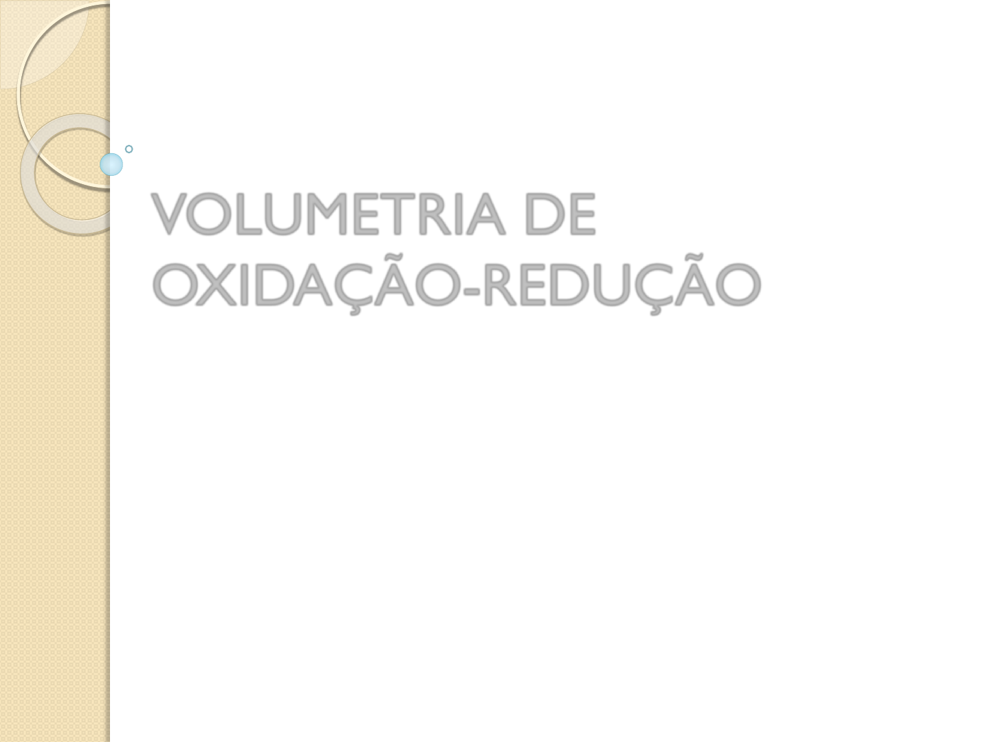 VOLUMETRIA DE OXIDAÇÃO-REDUÇÃO Dra. Ruth Vidal Natureza das reações de oxidação-redução Envolvem transferência de elétrons. Se desdobram em dois processos elementares ou reações parciais: Oxidação: doação de elétrons – agente redutor (valor do nox). Redução: ganho de elétrons – agente oxidante (valor do nox). Fe2+ Fe3+ + e- (oxidação) Ex.: Fe2+ + Ce4+ Fe3+ + Ce3+ Ce4+ + e- Ce3+ (redução) Obs.: a relação entre os participantes é tal que o número de mols de elétrons doados por uma espécie é exatamente igual ao número de mols de elétrons recebidos pela outra espécie. Reações de Oxi-Redução Transferência de elétrons de um reagente para outro 2 Ag + + Cu(s) Ag(s) + Cu 2+ Esta reação pode ser realizado por dois caminhos fisicamente diferentes. 1 - Colocar os reagentes em contato direto Cuo Ag+ Ag + Cuo Ago Cu2+ Célula Eletroquímica ou galvânica 2- Separar os reagentes em um arranjo apropriado. Eletrodo de Cobre e - e - Eletrodo de Prata Ponte Salina (KCl sat.) Cu(s) Cu 2+ + 2e - Ag + + e - Ag(s) [Cu 2+ ] = 1.00 mol/L [Ag + ] = 1.00 mol/L Ânodo (oxidação) Cátodo (redução) E REAÇÃO = E CÁTODO – E ÂNODO Energia Livre e Equação de Nernst A ddp é uma medida da tendência da reação e sua relação com a energia livre é dada por: Go = -nFEo cel ou Go = -RTlnK eq Assim para uma célula onde ocorre a reação de oxidação-redução hipotética: Oxid - ne _ Red Teremos: E REAÇÃO = E 0 REDUÇÃO – 0,0592 x Loga red /a oxid n para soluções diluídas: a = [X] Obs.: Em soluções concentradas, cálculos utilizando-se concentrações molares ao invés de atividades leva a erros consideráveis. Equação de Nernst Visualização do ponto final a) Quando o reagente é fortemente corado, ele próprio pode, então atuar como indicador (Ex.: KMnO4) b) Indicadores específicos - São substâncias que reagem especificamente com uma das espécies participantes da reação. (Ex.:Amido - reage com I-3) c) Corantes - São substâncias que mudam de cor irreversivelmente. (Ex.: Alaranjado de metila com bromato de potássio) d) Indicadores de oxidação-redução - São substâncias que se deixam oxidar ou reduzir, reversivelmente, com mudança de coloração. INDICADORES REDOX Um indicador pode ser utilizado para detectar o ponto final de uma titulação redox, exatamente como numa titulação ácido-base. Um indicador redox muda de cor quando passa de seu estado oxidado para seu estado reduzido. VIRAGEM DO INDICADOR Para prever a faixa de potencial na qual ocorrerá a mudança de cor, primeiro escrevemos a equação de Nernst. Quanto maior for a diferença de potencial padrão entre o titulado e o titulante, mais acentuada a mudança de direção presente na curva de titulação no ponto de equivalência. INDICADORES Curvas de titulação Nas titulações oxidimétricas há variação de potenciais dos sistemas participantes da reação de oxidação-redução. Os dois sistemas entram em equilíbrio em qualquer ponto da titulação, e seus potenciais são numericamente idênticos em cada ponto. Ex.: Seja a titulação de 100mL de ferro (II) 0,l mol.L-1 com permanganato de potássio 0,1 mol.L-1. ([H+] = cte). Reação global: MnO4 - + 5 Fe +2 + 8H+ 5 Fe+3 + Mn+2 + 4 H2O Sistemas envolvidos: MnO4 - + 8 H++ 5e- Mn+2 + 4 H2O Eº = 1,51 volts Fe+3 + e- Fe+2 Eº = 0,77 volts 1) No início da titulação: * Uma vez iniciada a titulação, coexistem na solução os dois sistemas, cujos potenciais, são dados pelas seguintes equações: E = Eº MnO4 - + 0,0591 log [MnO4 -] [H+] n [Mn+2] E = Eº Fe+3 + 0,0591 log [Fe+3] [H+] n [Fe+2] *Antes do ponto de equivalência, o potencial é calculado em função do sistema ferro (III). 2) Após a adição de 10 mL de KMnO4 0,1 [Fe+3] = 10 = 1 E = 0,77 + 0,0591 log 1 = 0,71 volts [Fe+2] 90 9 1 9 5) No ponto de equivalência E = 0,77 + 5 (1,51) + 0,0591 log 18 = 1,39 volts 6 6 6) Apos a adição de 105 mL KMO4 0,1N E = 1,51 + 0,0591 log 5x 0,1 = 1,48 volts 5 105 MÉTODOS OXIDIMÉTRICOS Permanganimetria - É o mais importante método volumétrico de oxi-redução. Usa o permanganato de potássio como reagente volumétrico. a) Permanganimetria em meio ácido - É a mais importante técnica permanganimétrica. MnO4 - + 8H+ + 5e- Mn2+ + 4 H2O Permanganimetria com redução a manganês(III) 4Mn+2 + MnO4 - + 25 F- + 8 H+ 5 MnF5 - + 4 H2O c) Permanganimetria com redução a dióxido de manganês (MnO). MnO4 - + 4 H+ + 3 e- MnO2 + 2 H2O d) Permanganimetria em meio alcalino - O permanganato é reduzido em duas etapas: MnO4 - + e- MnO4 = e MnO4 = + 2 H2O + 2 e - MnO2 + 4 OH - PERMANGANIMETRIA Soluções padrões de permanganato de potássio - Na preparação de soluções de permanganato de potássio, é preciso remover o MnO2, presente como impureza ou formado através de reações com impurezas do solvente. Uma solução relativamente estável é obtida por meio de ebulição de uma solução recentemente preparada e posterior filtração através de meio não redutor (lã de vidro, asbesto ou vidro sinterizado). APLICAÇÕES: Determinação de: Ferro (II) e (III), H2O2, Nitrito, MnO2, Formiato, Hipofosfato, Fosfito, lodeto, Cianeto, Tiocianato, Metanol, Formaldeído,Acetona, etc. IODOMETRIA A iodometria se classifica em dois métodos: a) Método direto (iodimetria) - É um método em que se titula uma espécie fortemente redutora com uma solução padrão de iodo, com iodeto de potássio (espécie predominante I-3). APLICAÇÕES: Determinação de Antimônio, Tiossulfato, Sulfito, H2S, etc. b) Método indireto (iodometria) – É um método onde se trata a espécie oxidante a determinar com o excesso de KI e titula-se com uma solução padrão de tiossulfato de sódio (meio ácido ou neutro). APLICAÇÕES: Determinação de Permanganato, Dicromato, Cobre (II), Cério (IV), Ferro (III), Cloro e Bromo gasosos, etc. Causas de erros na iodometria 1) Volatilização do iodo - O iodo volatiliza facilmente de suas soluções aquo