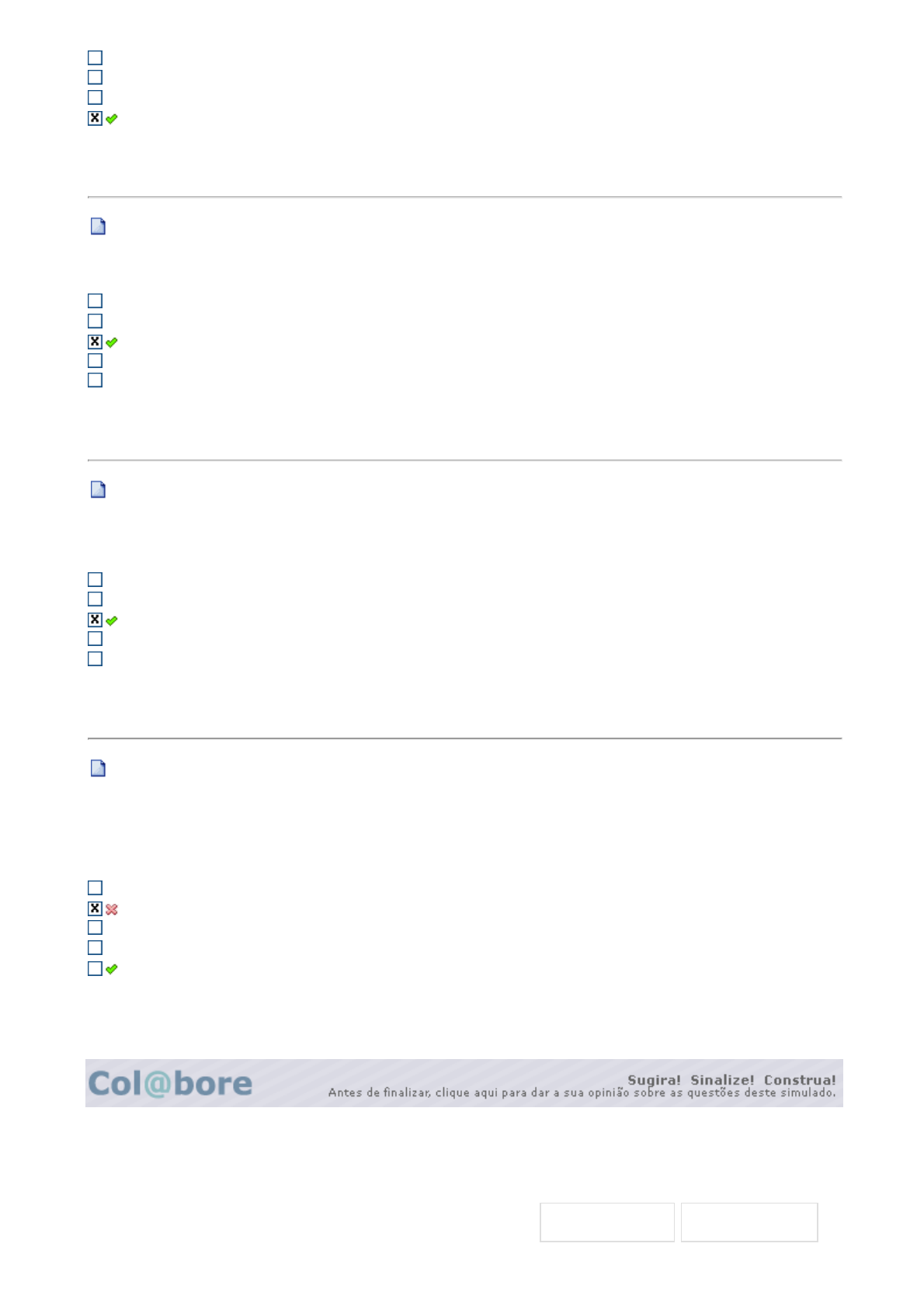 11/23/2017 Conteúdo Interativo http://estacio.webaula.com.br/Classroom/index.html?id=1178703&classId=855314&topicId=2610873&p0=03c7c0ace395d80182db07ae2c30f034&enableForu… 1/2 Tópico Anterior Próximo Tópico Cor escura. Odor característico. Solo de baixa compacidade. Definição clara das diversas camadas constituintes. 3a Questão (Ref.: 201301666711) Pontos: 0,1 / 0,1 Assinale a alternativa que contém equipamentos e utensílios empregados para a realização do ensaio de granulometria. Picnômetro, balança hidromática e banhomaria. Bandejas, soquete compactador e permeâmetro. Peneiras, bandejas, densímetro e estufa. Balança hidrostática, soquete metálico e molde metálico. Mão de Gral, compactador mecânico e molde metálico. 4a Questão (Ref.: 201301666723) Pontos: 0,1 / 0,1 Uma amostra de solo úmido. Com volume de 600 cm³ apresentou massa de 1.000 g, que passou para 900 g após secagem em estufa a 105 °C. Sabendo que a massa específica dos sólidos é igual a 2,6 g/cm³, assinale a alternativa que corresponde ao grau de saturação da amostra. 15,4% 10% 39,5% 89,2% 25,8% 5a Questão (Ref.: 201301666683) Pontos: 0,0 / 0,1 "É um tipo de prospecção ¿ sendo mais comuns as do tipo sísmica e elétrica que permite determinar o tipo e espessura das camadas, bem como detectar singularidades do terreno, como a presença de grandes blocos de rocha ou cavidades subterrâneas. O seu emprego pode reduzir o número de outros ensaios, conduzindo a uma economia nos estudos, particularmente quando se trata de áreas muito extensas a serem exploradas." (Adaptado de "Mecânica dos Solos", Homero Pinto Caputo, v. 4) A forma de prospecção descrita acima é denominada: térmica sondagem topográfica de auscultação geofísica 11/23/2017 Conteúdo Interativo http://estacio.webaula.com.br/Classroom/index.html?id=1178703&classId=855314&topicId=2610873&p0=03c7c0ace395d80182db07ae2c30f034&enableForu… 2/2