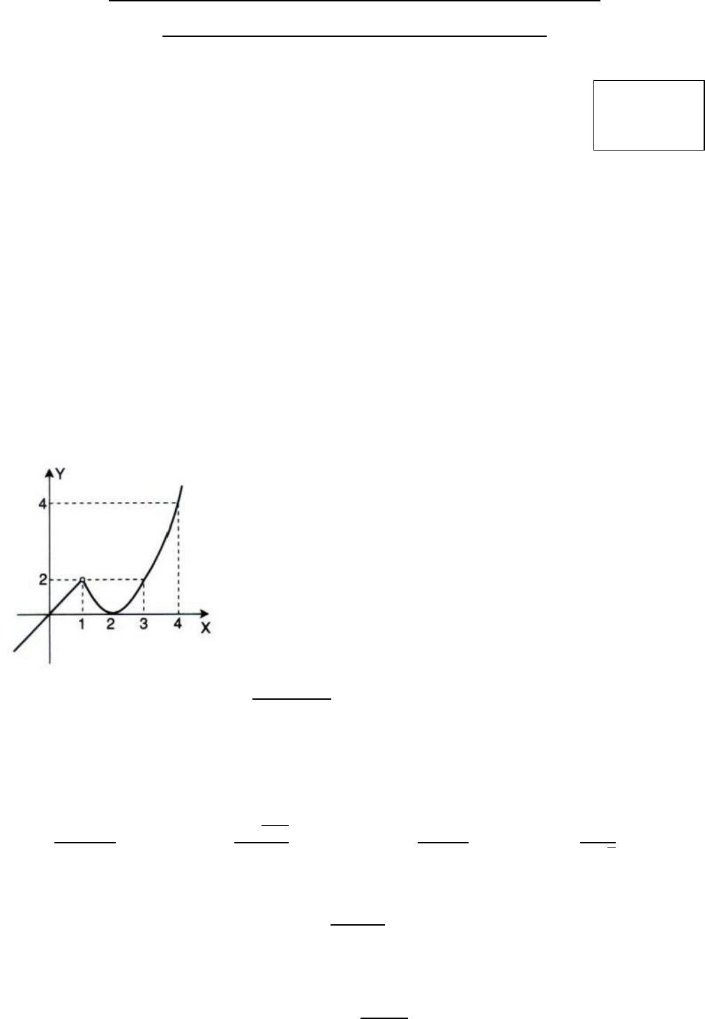 ___________ __ UNIVERSIDADE TECNOLÓGICA FEDERAL DO PARANÁ - UTFPR 1° Avaliação de Cálculo I: Limite e Continuidade Prof. Marcelo Motta DAMAT/CT – 30/09/15 Nome: ________________________________________________Matrícula: _________________Nota: Observações: - A prova tem duração de 100 minutos; - Não é permitido entrar na sala após de 30 minutos do início da prova; - A resolução da prova é individual e sem consulta; - Só é permitido o uso de caneta, lápis e borracha; - Só é permitido o uso de calculadora não programável; - Não é permitido pegar objetos emprestados; - As respostas devem ser a caneta para serem consideradas válidas; Resoluções caóticas, confusas ou vagas não serão consideradas; As respostas devem ser a caneta. 01ª Questão: (1,5 ponto) Num processo industrial, a velocidade da reação que produz uma substância química S deve ser igual a (3 ± 0,2) (𝑚𝑜𝑙/𝑙. 𝑚𝑖𝑛). Sabe-se que a velocidade da reação depende da concentração 𝒄 (𝑚𝑜𝑙/𝑙) de acordo com a função: 𝑉(𝑐) = 0,4 + 12𝑐 (𝑚𝑜𝑙/𝑙. 𝑚𝑖𝑛) , 𝑐 ≥ 𝑜 Determine o valor da concentração do catalizador e a margem de erro admissível para que a velocidade de reação cumpra as condições do processo industrial. 02ª Questão: (2,0 pontos) Considere a função f definida pelo gráfico e determine: Item I – Determine: 𝑎) 𝑓(1) = b) lim 𝑥→1− 𝑓(𝑥) = c) lim 𝑥→1+ 𝑓(𝑥) = d) lim 𝑥→1 𝑓(𝑥) = Item II: Verifique se a função f é contínua no ponto x = 1. 03ª Questão: (1,0 ponto) A temperatura T (em °C) na qual a água ferve é dada, aproximadamente, pela função 𝑇(ℎ) = 100,862 − 0,0415 √ℎ + 431,03, onde h é a altitude (em metros, acima do nível do mar). Use o Teorema do Valor Intermediário (TVI) para mostrar que existe uma altitude entre 4000 e 4500 metros, em que a água ferve a 98ªC. 04ª Questão: (2,0 pontos) Calcule os limites: a) lim 𝑥→2 𝑥2−1 𝑥2+3𝑥+2 = b) lim 𝑥→1 2−√3+𝑥 𝑥−1 = c) lim 𝑥→−∞ 3𝑥−2 5𝑥2+3𝑥 = d) lim 𝑥→4 4−𝑥 2−√𝑥 = 05ª Questão: (1,0 ponto) Calcule o limite lim 𝑥→1 tg (𝑥−1) 𝑥2−1 06ª Questão: (1,5 ponto) Determine as assíntotas da função e esboce o gráfico. 𝑔(𝑥) = 2𝑥 + 1 𝑥 − 1