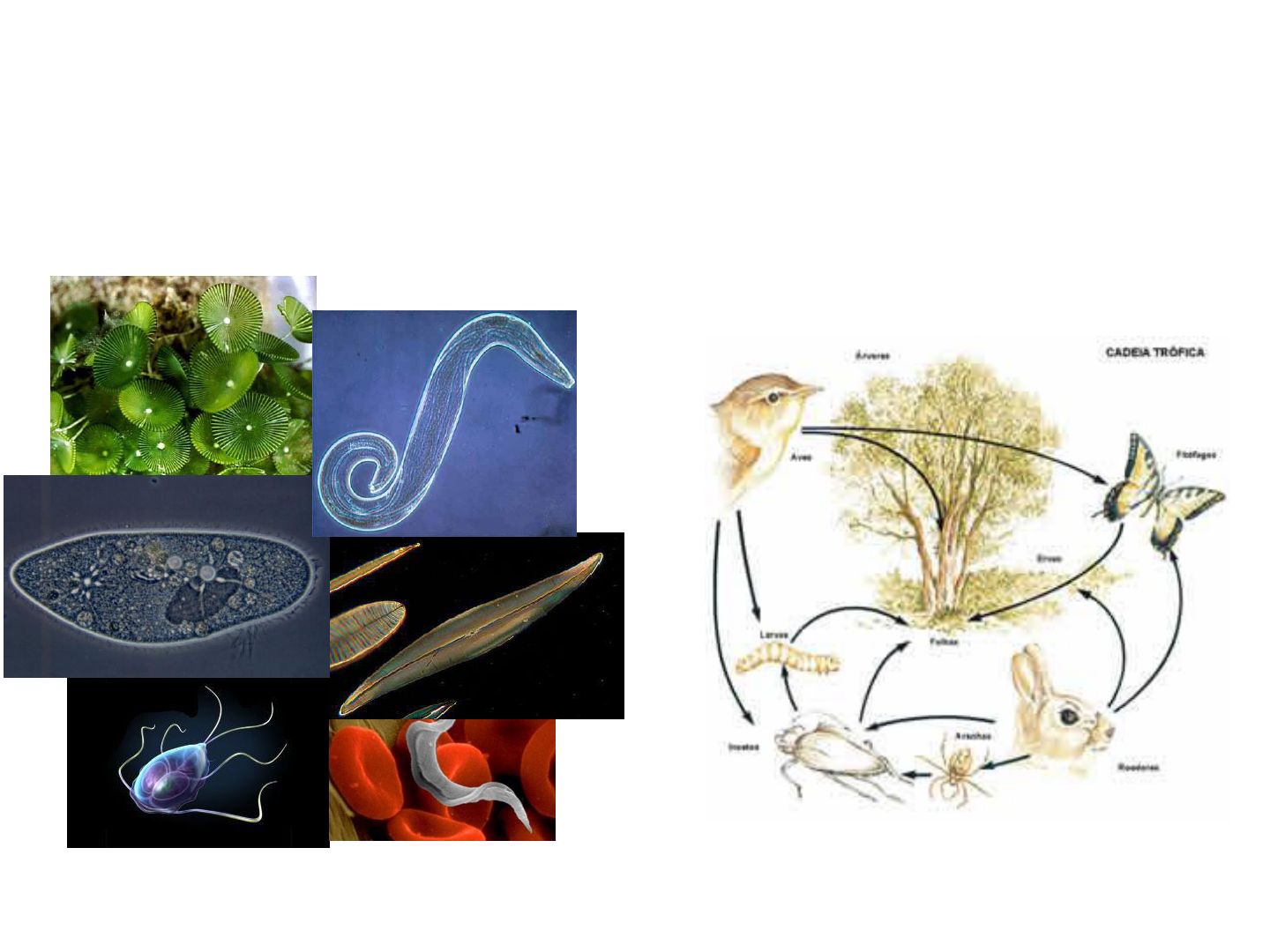 Biologia na Educação Básica IV UFFS – Laranjeiras do Sul 09/08/2016 Encontro 2: - Introdução a Autoecologia - Protozoários Introdução a Autoecologia Ecologia Autoecologia Sinecologia Auto-ecologia Ecologia das espécies Espécies Auto-ecologia Ecologia das espécies Espécies Grupos de organismos população comunidade ecossistema Glossário Ecológico - Influência de fatores ambientais sobre indivíduos da mesma espécie; - Desenvolvimento, comportamento e distribuição. Tolerância ecológica, reações próprias (taxonomia) Fatores ecológicos Qualquer elemento do meio ambiente capaz de atuar diretamente sobre os seres vivos. tempo – radiação – temperatura – umidade – luz – vento - alimento Autoecologia TEMPO Elementos físicos da atmosfera: clima = constante Período menor: tempo = variável RADIAÇÃO 1. Radiações eletromagnéticas omitidas pelo sol 2. Radiações ultravioleta, luz visível e infra-vermelho TEMPERATURA - Direta: desenvolvimento e comportamento - Indireta: alimentação Fatores Ecológicos UMIDADE ambiente muito seco: dessecação dos tecidos ambiente muito úmido: afogamento ou doenças ambiente favorável: 40-80% aquáticos ou estenoalinos higrófilos ou estenoídricos mesófilos xerófilos ou estenoídricos Fatores Ecológicos: Umidade LUZ - Ação sobre os animais - fotoperíodo: invariável em uma mesma localidade e afeta os ritmos biológicos; - comprimento de onda: ultravioleta ao infra-vermelho - Comportamento dos animais - inteligência, instinto e tropismo (+ e -) - fototropismo positivo - fototropismo negativo Fatores Ecológicos OUTROS TROPISMOS - Geotropismo positivo: larvas de besouros negativo: cigarrinhas - Fonotropismo positivo: atraentes sexuais - cigarras negativo: repelente – morcego x mariposas - Quimiotropismo (odor ou olfato) alimentação: mosca das frutas sexual: feromônio direcional: gás carbônico x pernilongo - Tigmotropismo: paralisação temporária Fatores Ecológicos VENTO Disseminação de animais Fatores Ecológicos ALIMENTO Distribuição e abundância processos biológicos, morfológicos e comportamento - Fecundidade - Longevidade - Velocidade de desenvolvimento Fatores Ecológicos Ecologia Autoecologia Sinecologia Auto-ecologia Ecologia das espécies Espécies Auto-ecologia Ecologia das espécies Espécies Grupos de organismos população comunidade ecossistema Glossário Ecológico - Estudo da comunidade como um todo, - Observamos o desenvolvimento, a população, a relação entre espécies, - Dispersão, adaptação e competição. - Compreende os estudos ecológicos das - populações - comunidades - ecossistemas Sinecologia Comunidade agrupamentos naturais de populações de diversas espécies, com capacidade de sobrevivência, sustentação própria e relativa independência dos agrupamentos adjacentes. Sinecologia Comunidades - associações biológicas estabelecidas entre organismos - agregação: associação de uma espécie em que há individualismo, gafanhotos - sociedade: associação sem individualismo, insetos sociais - simbiose: interação entre duas espécies diferentes de uma comunidade Biocenoses Sinecologia SINECOLOGIA Tipo de interação Efeito sobre a população Resultado da interação Sem interação Com interação A B A B Neutralismo (A e B independentes) 0 0 0 0 Uma população não afeta a outra. Competição (A e B competidores) 0 0 - - Uma população elimina a outra. Mutualismo (A e B mutualistas) - - + + Interação obrigatória para ambos. Protocooperação (A e B cooperadores) 0 0 + + Interação favorável mas não obrigatória. Comensalismo (A=comensal; B= hospedeiro) - 0 + 0 Obrigatória para A, e B não é afetado. Amensalismo (A=amensal; B= inibidor) 0 0 - 0 A é inibido e B não é afetado. Parasitismo (A=parasito; B=presa) - 0 + - Obrigatório para A e B é destruído. Predação (A=predador; B= presa) - 0 + - Obrigatório para A e B é destruído. Comunidades Simbiose Comunidades - camuflagem: insetos se assemelham ao meio em que vivem ou permanecem Proteção contra inimigos - Forma (homotipia) - Cor (homocromia) Sinecologia Comunidades - mimetismo: insetos se assemelham a outros insetos ou animais Proteção contra inimigos Sinecologia Ecossistemas Associação das comunidades bióticas e do meio ambiente - Rios - Mares - Desertos - Tundras - Campos - Floretas Sinecologia tempo radiação temperatura umidade luz vento alimento Ecologia Autoecologia Sinecologia Espécies Fatores ambientais Grupos de organismos - Populações: levantamento, formas de crescimento , etc; - Comunidades: cadeias alimentares, biocenoses, proteções, características; - Ecossistemas: mares, rios, desertos, tundras, campos e florestas Relembrando... Protozoários Como definimos os grupos de protozoários? Eucariotos Unicelulares ProtoZOArios: ausência de parede celular e presença de ao menos um estágio móvel no seu ciclo de vida. Entretanto, a distinção planta-animal = organismos unicelulares = alguns apresentam plastídios fotossintéticos. Características dos Protozoários 1. Unicelular; alguns coloniais e alguns com estágios multicelulares em seus ciclos de vida. Características dos Protozoários 2. Na maioria das vezes são microscópicos, apesar de alguns seres grandes o bastante para serem vistos a olho nu. Características dos Protozoários 3. Todos os tipos de simetria estão representados no grupo; forma variável ou constante (oval, esférica ou outras). Características dos Protozoários 4. Não há camada germinativa. 5. Não há órgãos nem tecidos, mas são encontradas organelas especializadas; núcleo único ou múltiplo. Características dos Protozoários 6. Vida livre, mutualismo, comensalismo e parasitismo estão representados nos grupos. Características dos Protozoários 7. Locomoção por pseudópodes, flagelos, cílios e movimentos celulares diretos; alguns sésseis. Características dos Protozoários 8. Alguns apresentam endoesqueleto simples ou exo