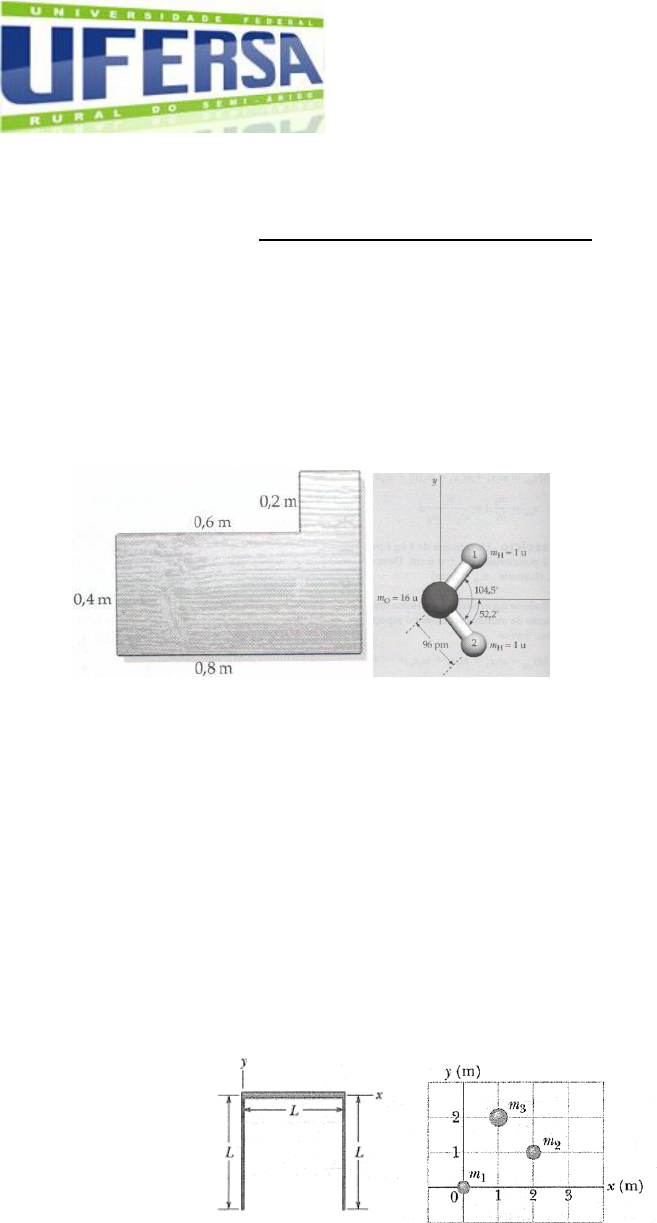 Lista III – Mecânica Clássica – 2016-2 1. Determine o centro de massa do compensado de madeira uniforme mostrado na figura 1. 2. Uma molécula de água consiste de um átomo de oxigênio e dois átomos de hidrogênio. O oxigênio tem uma massa de 16 unidades de massa unificadas (u), e o hidrogênio 1 u. Cada átomo de hidrogênio está a uma distância média de 96 pm (96 x 10 -12 m) do átomo de oxigênio, e estão separados um do outro por um ângulo de 104,5°. Determine o centro de massa de uma molécula de água. Figura 1 Figura 2 3. Você esta em pé sobre uma camada de gelo de um estádio de futebol em um país frio; despreze o atrito entre seus pés e o gelo. Um amigo joga para você uma bola de 0,400 kg que se desloca horizontalmente com velocidade 10 m/s. Sua massa é igual a 70 kg. (a) Se você agarra a bola, com que velocidade você e a bola se deslocarão logo a seguir? (b) Se a bola colide com você e rebate em seu peito, passando a adquirir uma velocidade horizontal de 8 m/s em sentido oposto ao inicial, com que velocidade você se desloca após a colisão? 4. Na figura abaixo, temos três barras finas e uniformes, cada uma de comprimento L = 22 cm, formam um U invertido. Cada barra vertical tem massa de 14 g; a barra horizontal tem massa de 42 g. Quais (a) a coordenada x e (b) a coordenada y do centro de massa do sistema? Figura Q. 4 Figura Q. 5 5. A figura Q.5 mostra um sistema de três partículas, com massas m1 = 3 kg, m2 = 4 kg e m3 = 8 kg. Quais são (a) a coordenada x e b) a coordenada y do centro de massa do Universidade Federal Rural do Semi-Árido – UFERSA Centro de Ciências Exatas e Naturais - CCEN Curso: Ciência e Tecnologia Disciplina: Mecânica Clássica Professora: Jusciane da Costa e Silva sistema? (c) Se m3 crescer gradualmente, o centro de massa do sistema se aproxima de m3, se afasta de m3 ou permanece onde está? 6. Um automóvel de 1000 kg está em repouso em um semáforo. No instante em que a luz fica verde, o automóvel acelera constantemente a 4 m/s 2 . No mesmo instante, um caminhão de 2000 kg, deslocando-se no mesmo sentido com velocidade constante de 8 m/s ultrapassa o automóvel. (a) Qual a distância entre o CM do sistema carro-caminhão e o semáforo em t = 3s? (b) Qual a velocidade do CM neste instante? 7. Um caminhão de 2100 kg viajando para o norte a 41 km/h vira para leste e acelera até 51 km/h. (a) Qual é a variação na energia cinética do caminhão? Quais são (b) o módulo e (c) o sentido da variação em seu momento? 8. A figura abaixo dá uma vista superior da trajetória descrita por uma bola de bilhar de 0,165 kg quando ela bate na borda de uma mesa. O módulo da velocidade inicial é 2,0 m/s e o ângulo é de 30°. A rebatida inverte a componente y da velocidade da bola mais não altera a componente x. Quais são (a) o ângulo 2 e (b) a variação no momento linear da bola em termos dos vetores unitários? (o fato de que a bola rola é irrelevante para o problema). 9. Uma força no sentido negativo de um eixo x é aplicada por 27 ms a uma bola de 0.40 kg inicialmente se movendo a 14 m/s no sentido positivo do mesmo eixo. A força varia em módulo e o impulso tem módulo igual a 32,4 N.s. Quais são (a) o módulo e (b) o sentido da velocidade da bola imediatamente após a aplicação da força? Quais são (c) a intensidade da força e (d) o sentido do impulso sobre a bola? 10. Uma bola de 1,2 kg cai verticalmente sobre um piso, atingindo-o com velocidade de 25 m/s. Ela é rebatida com uma velocidade inicial de 10 m/s. (a) Que impulso atua sobre a bola neste contato? (b) Se a bola fica em contato com o piso por 0,020 s, qual é a intensidade da força média da bola sobre o piso? 11. Um homem de 91 kg está inicialmente em repouso sobre uma superfície de atrito desprezível e arremessa uma pedra de massa de 68 g para longe de si com uma velocidade de 4 m/s. Que velocidade o homem adquire? 12. Uma bala de 5,20 g movendo-se a 672 m/s atinge um bloco de madeira de 700 g, inicialmente em repouso sobre uma superfície sem atrito. A bala atravessa o bloco e emerge, viajando no mesmo sentido, com sua velocidade reduzida a 428 m/s. (a) Qual a velocidade final do bloco? (b) Qual a velocidade do centro de massa do sistema bala- bloco? 13. Na situação “antes” da figura abaixo, o carro A (massa de 1100 kg) está parado em um semáforo é atingido na traseira pelo carro B (massa de 1400 kg). Os dois carros, então, deslizam com as rodas travadas até que a força de atrito com o asfalto (com coeficiente de atrito µ de 0,13) os leva ao repouso após as distâncias dA = 8,2 m e dB = 6,1 m. Quais são os módulos das velocidades (a) do carro A e (b) do carro B no início do deslizamento, imediatamente após a colisão?(c) suponha que o momento linear é conservado na colisão, encontre a velocidade do carro B imediatamente antes da colisão. 14. Um carinho de massa igual a 340 g movendo-se sobre um trilho de ar linear a uma velocidade inicial de 1,2 m/s sobre uma colisão elástica com outro carrinho inicialmente em repouso de massa desconhecida. Após a colisão, o primeiro carrinho continua no seu sentido original com 0,66 m/s. (a) Qual é a massa do segundo carrinho? (b) Qual é sua velocidade após a colisão? (c) Qual é a velocidade do centro de massa do sistema dos dois carrinhos? 15. Um projétil lançado no ar ao nível do solo apresenta um alcance de 55 m. No ponto mais alto de sua trajetória ele explode, fragmentando-se em duas partes de massa idênticas. Imediatamente após a explosão um de seus fragmentos apresenta uma velocidade instantaneamente nula, e cai em linha reta em direção ao solo. Onde o outro fragmento cairá? Despreze a resistência do ar. Figura Q.16. 16. Uma bola de beisebol possui massa igual a 0,145 kg. (a) Sabendo que a velocidade da bola arremessada é de 45 m/s e a velocidade da bola rebatida é de 55 m/s na mesma direção, mas em sentido contrário, calcule o módulo da variação do mom