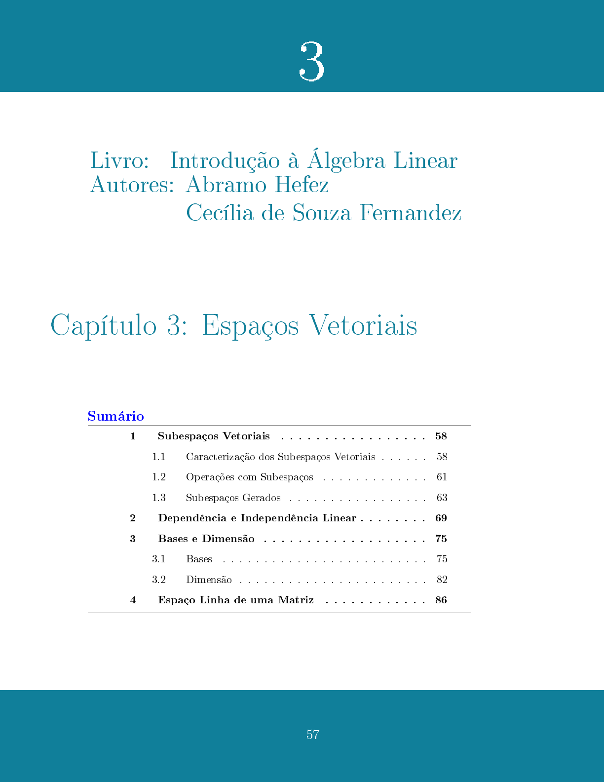 3 57 Livro: Introdução à Álgebra Linear Autores: Abramo Hefez Cecília de Souza Fernandez Capítulo 3: Espaços Vetoriais Sumário 1 Subespaços Vetoriais . . . . . . . . . . . . . . . . . 58 1.1 Caracterização dos Subespaços Vetoriais . . . . . . 58 1.2 Operações com Subespaços . . . . . . . . . . . . . 61 1.3 Subespaços Gerados . . . . . . . . . . . . . . . . . 63 2 Dependência e Independência Linear . . . . . . . . 69 3 Bases e Dimensão . . . . . . . . . . . . . . . . . . . 75 3.1 Bases . . . . . . . . . . . . . . . . . . . . . . . . . 75 3.2 Dimensão . . . . . . . . . . . . . . . . . . . . . . . 82 4 Espaço Linha de uma Matriz . . . . . . . . . . . . 86 58 CAPÍTULO 3. ESPAÇOS VETORIAIS Neste capítulo, desenvolveremos o conceito de espaço vetorial que intro- duzimos no Capítulo 1. Intimamente associadas à noção de espaço vetorial estão as noções de subespaço vetorial, de base e de dimensão, conceitos esses fundamentais que introduziremos neste capítulo e que nos permitirão enten- der melhor a estrututa desses espaços. A estrutura de espaço vetorial está presente em espaços importantes da Análise Matemática e da Geometria Di- ferencial, como os espaços de Banach e os espaços de Hilbert, que possuem muitas aplicações na Física moderna, entre outros. Neste texto enfatizaremos os espaços vetoriais sobre o corpo R dos nú- meros reais. Apesar do fato de muitos dos resultados que obteremos serem válidos no contexto mais geral dos espaços vetoriais sobre corpos abitrários, nos restringiremos aos espaços vetoriais reais. 1 Subespaços Vetoriais Na Subseção 1.3 do Capítulo 1, vimos que o conjunto solução Sh de um sistema de equações lineares homogêneo com n incógnitas forma um espaço vetorial contido no espaço Rn. Esta é uma situação típica da noção de subespaço de um espaço vetorial, que definiremos a seguir com maior generalidade. 1.1 Caracterização dos Subespaços Vetoriais Sejam V um espaço vetorial e W um subconjunto não vazio de V . Dize- mos que W é um subespaço vetorial de V , ou simplesmente um subespaço de V , se W , com as operações de adição em V e de multiplicação de vetores de V por escalares, é um espaço vetorial. Para mostrar que um subconjunto não vazio W de V é um subespaço de V é preciso inicialmente verificar se as operações de adição de vetores e de multiplicação de vetores por escalares em V estão definidas em W . Em seguida, seria necessário verificar as propriedades A1�A4 e ME1�ME4 da definição de espaço vetorial que demos na Subseção 1.2 do Capítulo 1. No 1. SUBESPAÇOS VETORIAIS 59 entanto, como W é parte de V , que já sabemos ser um espaço vetorial, então algumas das propriedades anteriores não precisam ser testadas em W . Por exemplo, não precisamos testar se a adição em W é associativa nem se é comutativa, pois essas propriedades são satisfeitas por todos os elementos de V e, consequentemente, por todos os elementos deW . Pelo mesmo motivo, as condições ME1�ME4 não precisam ser testadas em W . Assim, para mostrar que um subconjunto não vazioW de V é um subespaço de um espaço vetorial V , precisaremos somente verificar se A3 e A4 são satisfeitas. O resultado a seguir mostra que, de fato, basta mostrar que as operações de V estão definidas em W . Proposição 3.1.1. Sejam V um espaço vetorial e W um subconjunto não vazio de V . Então, W é um subespaço de V se, e somente se, as seguintes condições são satisfeitas: (i) se u, v ∈ W , então u+ v ∈ W ; (ii) se a ∈ R e u ∈ W , então au ∈ W . Demonstração Se W é um subespaço de V , então claramente as condições (i) e (ii) são verificadas. Reciprocamente, suponhamos que W possua as propriedades (i) e (ii). Para mostrar que W é subespaço de V , precisamos somente verificar que os elementos de W possuem as propriedades A3 e A4. Tome um elemento qualquer u de W , o que é possível pois W 6= ∅. Pela condição (ii), au ∈ W para todo a ∈ R. Tomando a = 0, segue-se que 0u = 0 ∈ W e, tomando a = −1, segue-se que (−1)u = −u ∈ W . � A Proposição 3.1.1 afirma que um subconjunto não vazio de um espaço vetorial V é um subespaço de V se, e somente se, a adição e a multiplicação por escalar são fechadas em W . A Proposição 3.1.1 pode ser reescrita da seguinte forma: Corolário 3.1.2. Sejam V um espaço vetorial e W um subconjunto não vazio de V . Temos que W é um subespaço vetorial de V se, e somente se, u+ av ∈ W , para todo a ∈ R e para todos u, v ∈ W . 60 CAPÍTULO 3. ESPAÇOS VETORIAIS A demonstração do resultado anterior é deixada para o leitor (veja Pro- blema 1.1). Vejamos agora alguns exemplos de subespaços vetoriais. Exemplo 1. Seja V um espaço vetorial. Então o conjunto {0}, constituído apenas do vetor nulo, e também todo o espaço V são subespaços de V . O conjunto {0} é chamado de espaço vetorial nulo. Exemplo 2. Seja V = Rn e sejam i1, i2, . . . , ir números naturais tais que 0 < i1 < i2 < · · · < ir ≤ n. O conjunto W = {(x1, x2, . . . , xn) ; xi1 = xi2 = · · · = xir = 0} é um subespaço vetorial de Rn. Em particular, W1 = {(0, y, z) ; y, z ∈ R} e W2 = {(0, y, 0) ; y ∈ R} são subespaços vetoriais de R3. Exemplo 3. Na Subseção 1.3 do Capítulo 1, vimos que o conjunto solução Sh de um sistema de equações lineares homogêneas em n incógnitas forma um subespaço vetorial de Rn. Os subespaços do Exemplo 2 podem ser vistos sob esta ótica, pois o subespaço W , do referido exemplo, pode ser descrito como o espaço solução do sistema de equações lineares homogêneas xi1 = xi2 = · · · = xir = 0. Exemplo 4. No espaço vetorial das matrizesM(n, n), os conjuntos das ma- trizes triangulares superiores, triangulares inferiores e das matrizes diagonais, são subespaços vetoriais. Exemplo 5. No espaço vetorial S das sequências reais, as recorrências line- ares do tipo R(a, b) (cf. Exemplo 2, Seção