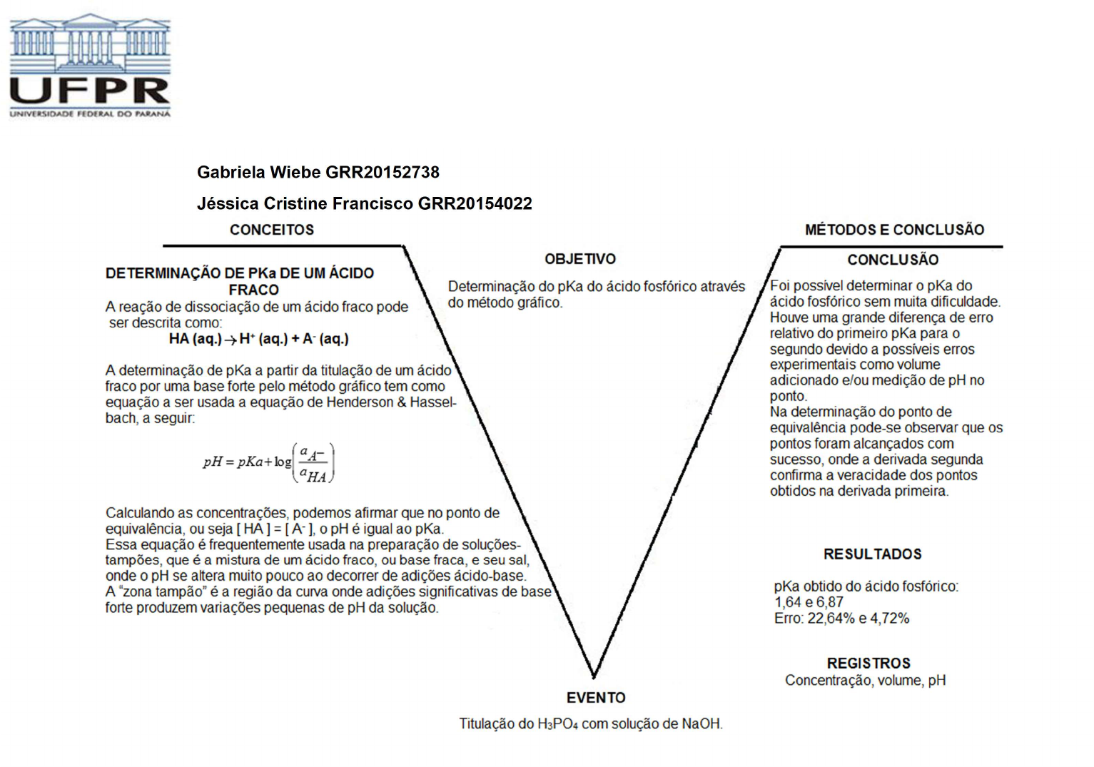UNIVESIDADE FEDERAL DO PARANÁ SETOR DE CIÊNCIAS EXATAS DEPARTAMENTO DE QUÍMICA CQ 050 – FÍSICO-QUÍMICA EXPERIMENTAL I Gabriela Wiebe GRR20152738 Jéssica Cristine Francisco GRR20154022 UNIVESIDADE FEDERAL DO PARANÁ SETOR DE CIÊNCIAS EXATAS DEPARTAMENTO DE QUÍMICA CQ 050 – FÍSICO-QUÍMICA EXPERIMENTAL I Gabriela Wiebe GRR20152738 Jéssica Cristine Francisco GRR20154022 Gráfico 1: pH x volume (mL) Gráfico 2: Primeira derivada do gráfico 1 UNIVESIDADE FEDERAL DO PARANÁ SETOR DE CIÊNCIAS EXATAS DEPARTAMENTO DE QUÍMICA CQ 050 – FÍSICO-QUÍMICA EXPERIMENTAL I Gráfico 3: Segunda derivada do gráfico 1